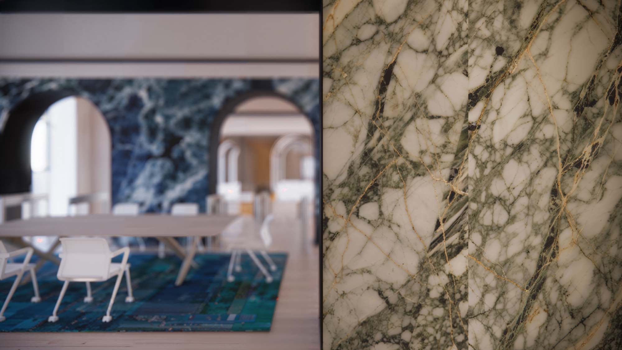 Eine der Hauptherausforderungen, denen sich das Team von Machine Learning Reply, das auf Künstliche Intelligenz spezialisierte Unternehmen der Reply Gruppe, und ACPV ARCHITECTS stellen musste, war die Reproduktion von Marmorplatten im großen Maßstab, ohne einen halluzinatorischen optischen Effekt zu erzeugen und dabei eine realistische Wirksamkeit zu bewahren, die auf großen architektonischen Oberflächen bis zu 3,2 Meter Höhe anwendbar ist.