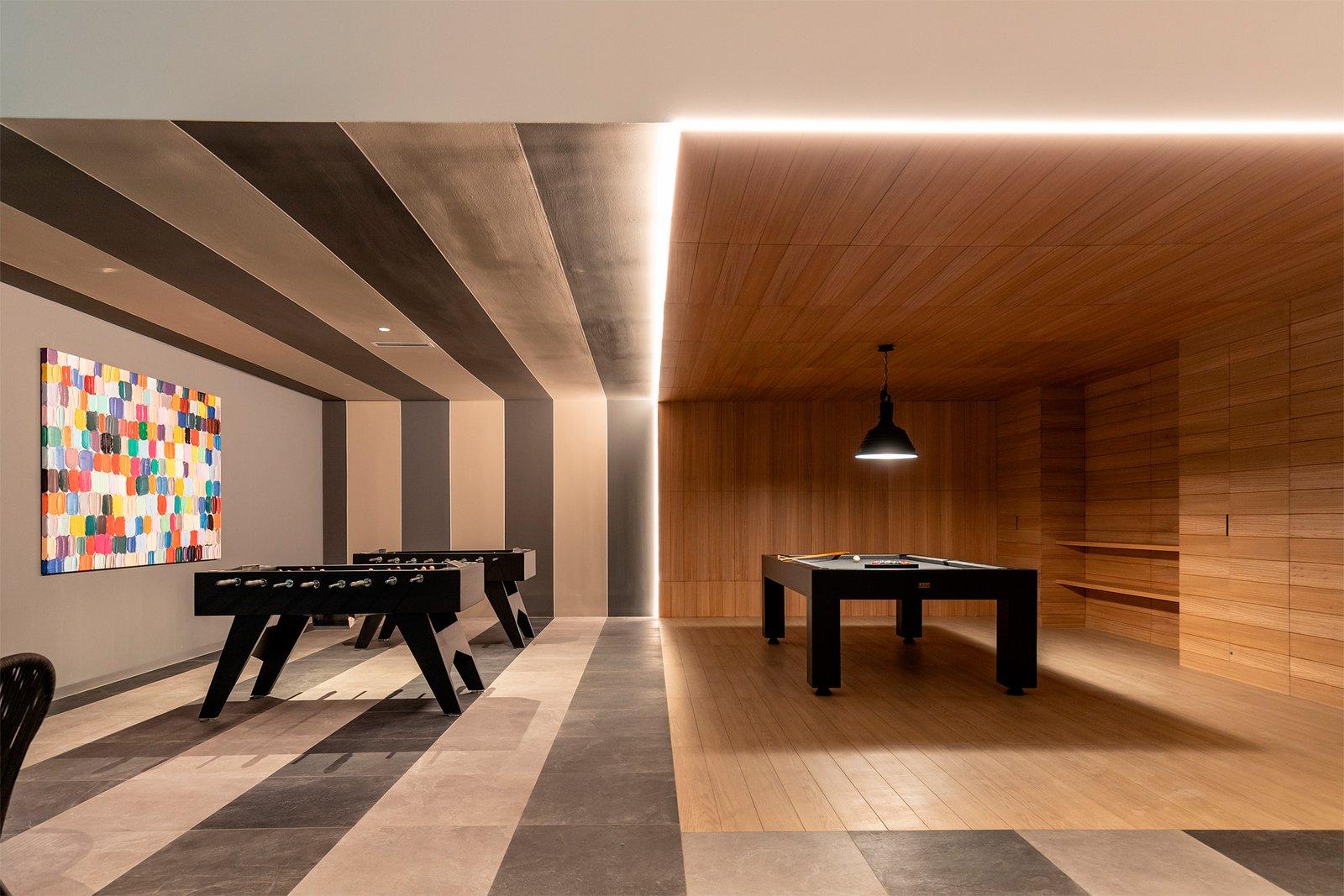 Holz und Feinsteinzeug sind Materialien, die am besten dem Projektkonzept entsprechen, das an einen Gesteinsblock mit dichtem Bewuchs erinnert. Die Inneneinrichtung sollte absolut kohärent mit der poetischen Gestaltungsidee von Jean Nouvel sein, auch wenn die Auswahl der Ausstattung und die Planung der Technikräume direkt vom Immobilienentwickler betreut wurden.“