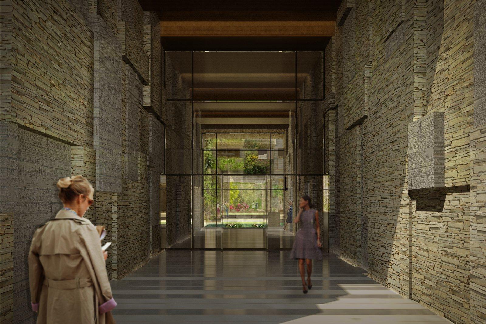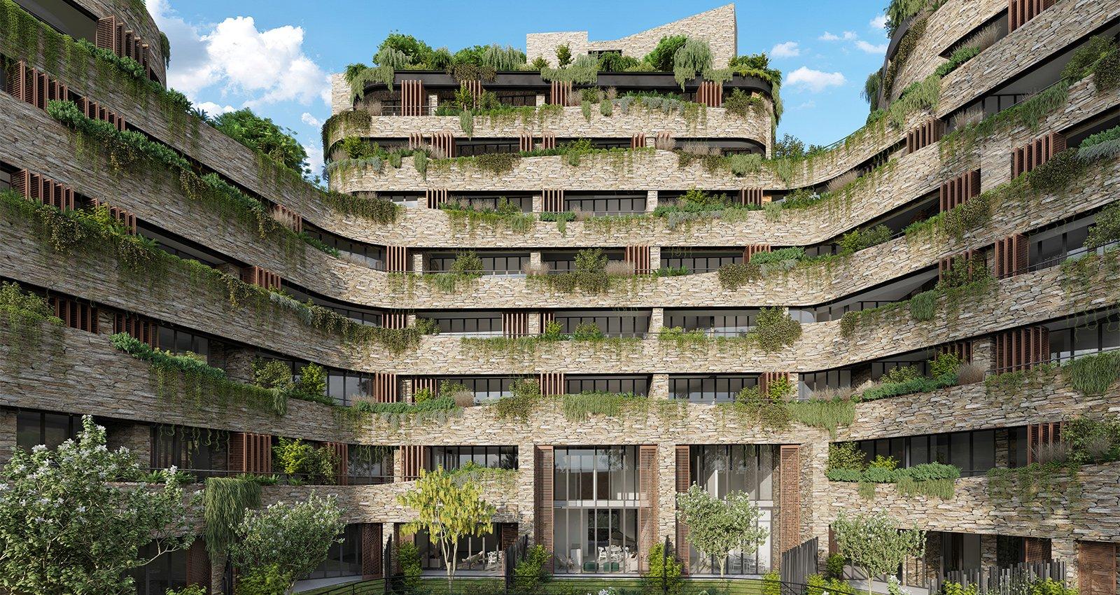Das neue Gebäude erinnert an die steilen Berge in der Umgebung von Cumbayá. Die Wohntürme sind um großzügige grüne Innenhöfe herum angeordnet, die miteinander verbunden sind. Die Fronten der neuen Wohnanlage besitzen große vertikale Gärten und sind mit Pflanzen begrünt, die sich an den mit Stein verkleideten Oberflächen bald ihren Weg bahnen werden.