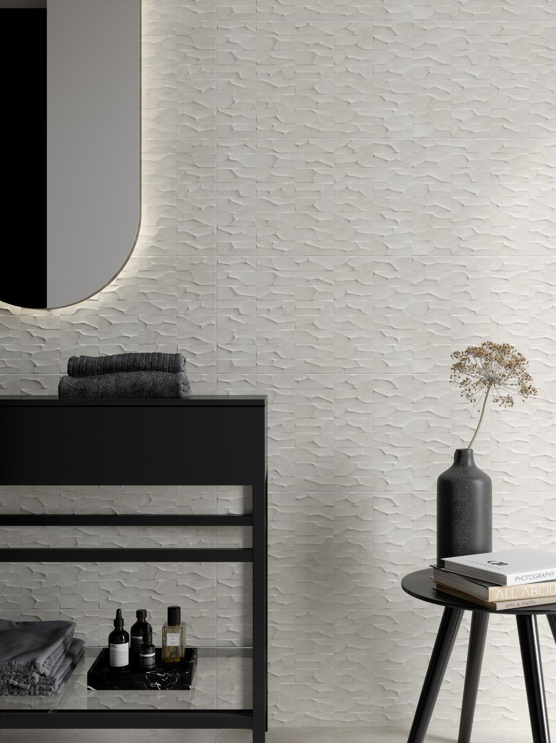 Plaza bietet auch als Wandbelag eine Vielzahl an Varianten für Dekorationen Ton in Ton und im Kontrast zu den Texturen. Dazu gehören die Version im 3D-Relief Range, ein gestreiftes Dekor mit lebhaften Farbeffekten (Wallace) im Format 30×90 cm und ein Mosaik im Format 30×30 cm. Alle Beläge stehen in den drei Farben Beige, Greige und White im Format 30×90 cm zur Wahl.