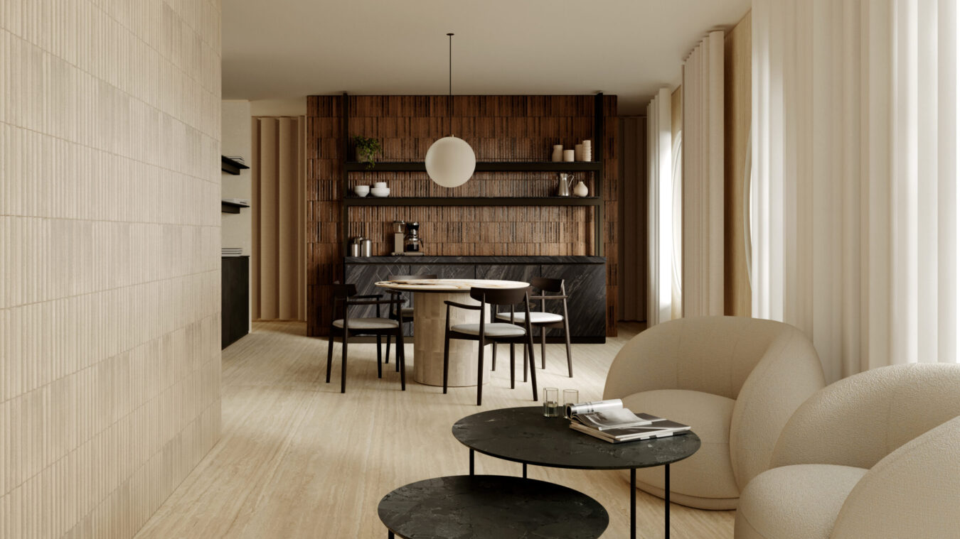Die großen Steinoptik-Platten in Travertino Classico und Berici Beige schaffen einen Hintergrund in neutralen, taktilen Tönen, die durch die 3D Ink-Technologie Tiefe und Charakter erhalten. Die Räume sind so gestaltet, dass sie ein flüssiges und anspruchsvolles Hotelerlebnis bieten. Die Möbel in der Wohnbereich sind mit den Feinsteinzeugplatten The Top Stone Look Bahia Black und Marble Look Patagonia realisiert und werden mit den neuen Nuancen des kleinen Formats Crogiolo Lume kombiniert.