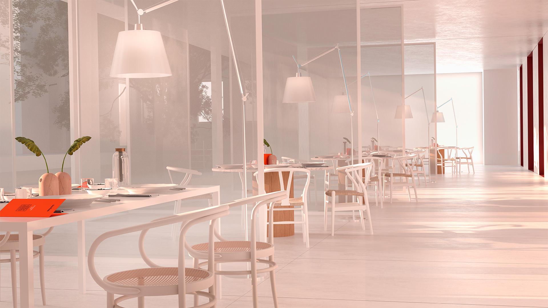 Das Restaurant empfängt seine Gäste in einem mit Grande Solid Color look White gestalteten Raum, wo die Total White-Optik dieser für große, durchgehende Flächen gedachten Kollektion ihren ganzen Charme ausspielt.