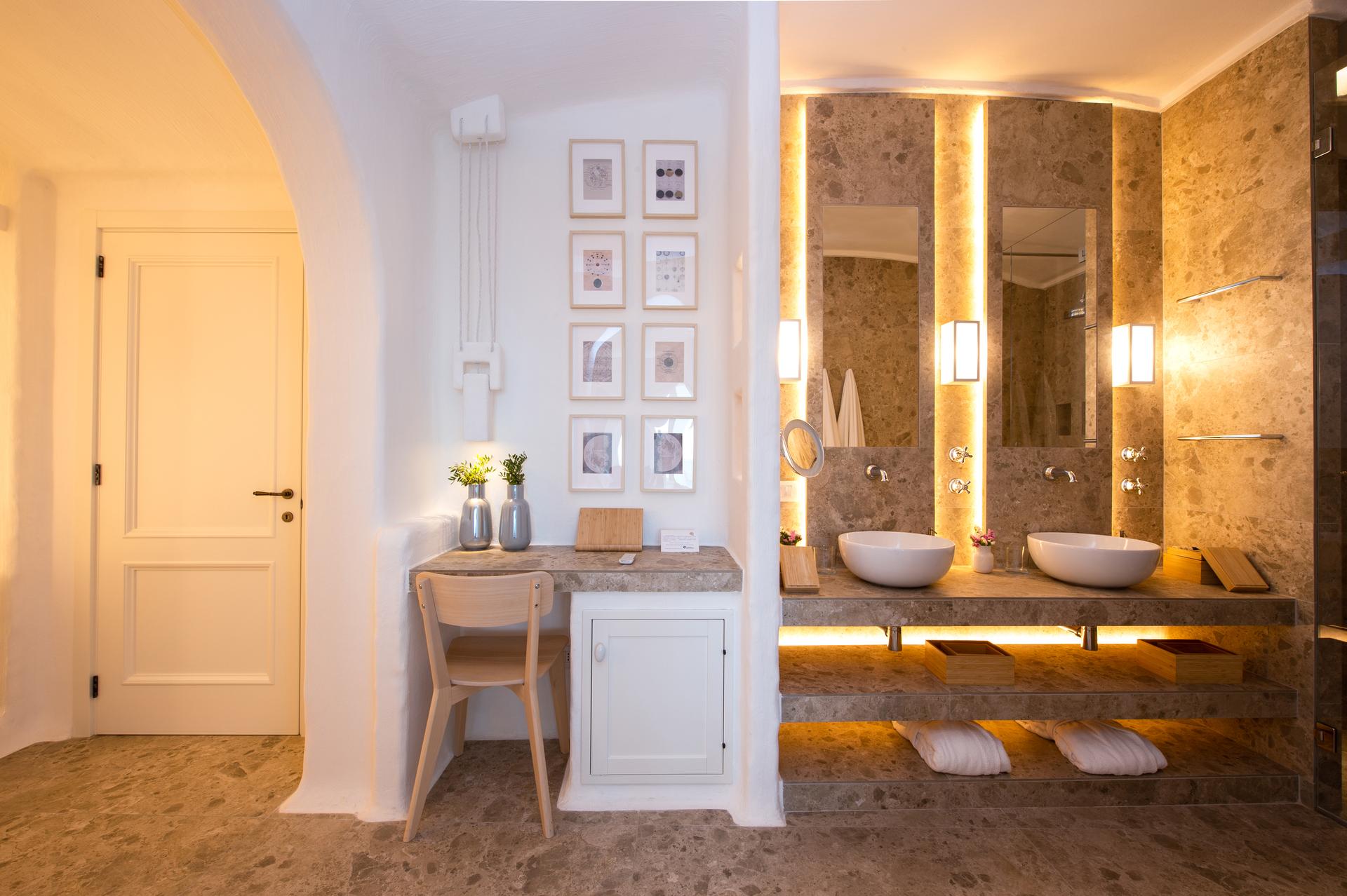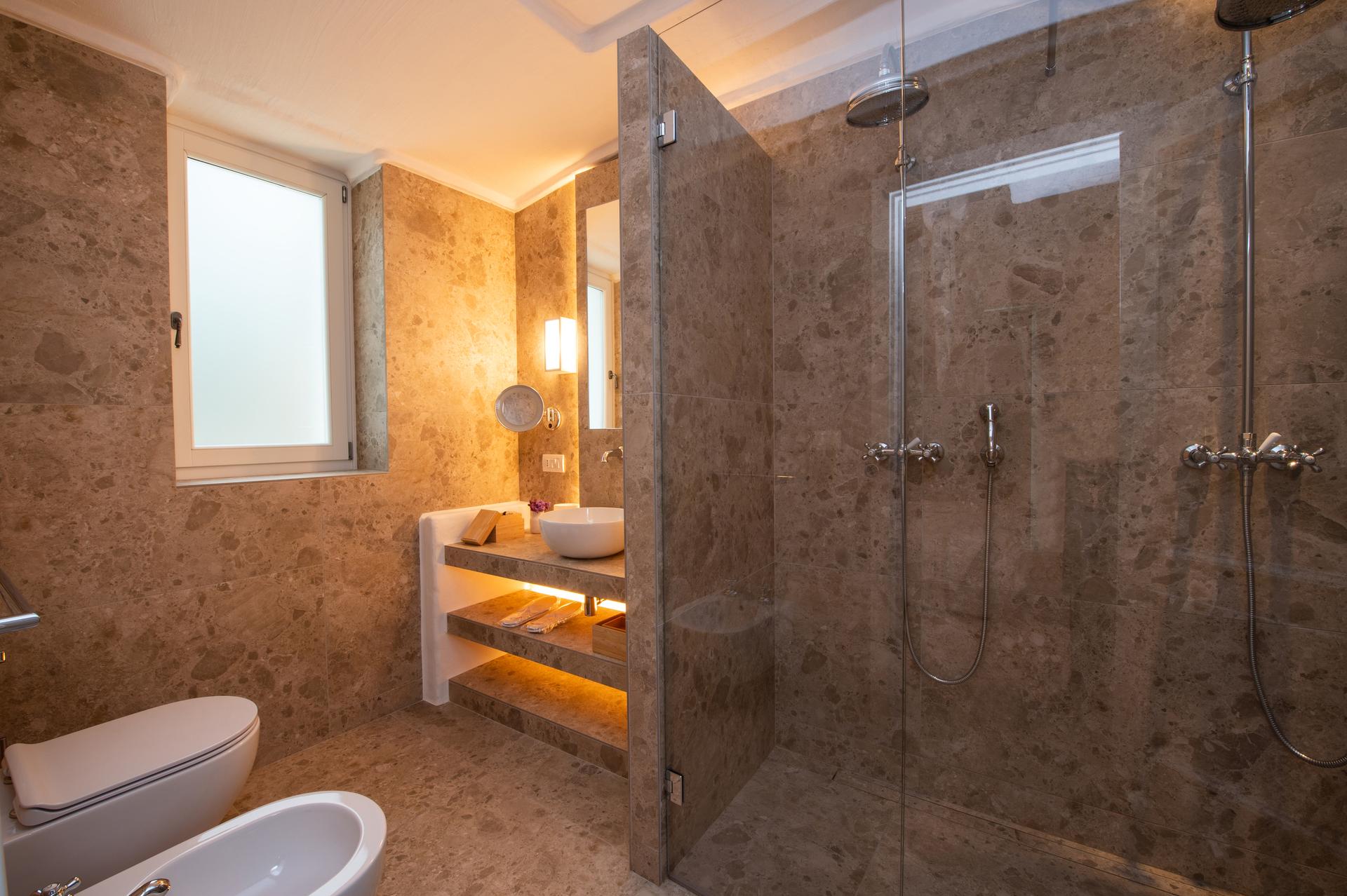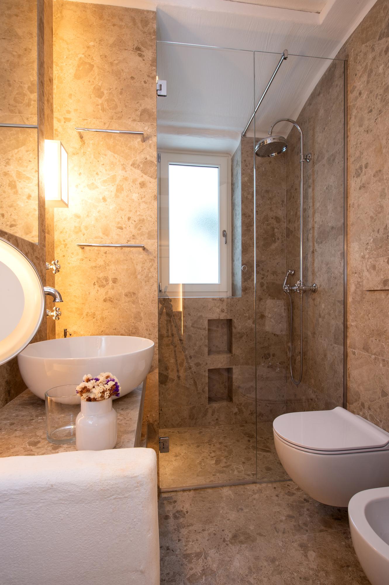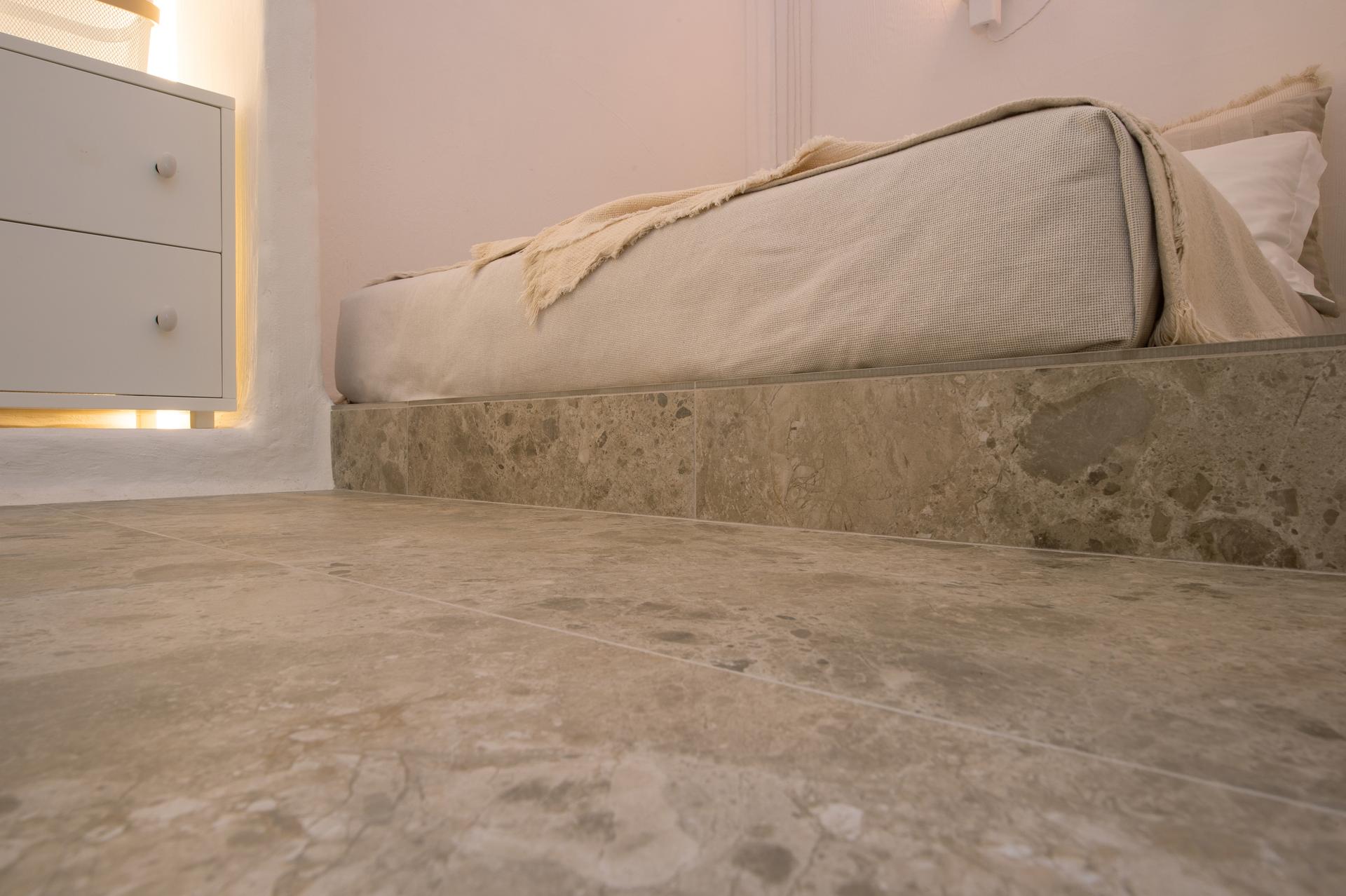 In den Zimmern dominieren die Farben Weiß und Beige, die durch die Kollektion Carácter Mix Beige in Steinoptik mit Kieseleinschlüssen auf der Oberfläche schön zur Geltung kommen. Das Feinsteinzeug wurde hier im Format 60×120 cm für die Böden der Zimmer, Wände der Bäder und auch für einige Wände und Küchenarbeitsplatten in den Deluxe-Zimmern eingesetzt. Eine vielseitige, nachhaltige Kollektion, die mit einem Recyclinganteil von 40 Prozent und mit zwei Premium-Technologien gefertigt wird: Puro Marazzi Antibacterial, die bis zu 99,9 % der Bakterien beseitigt, und StepWise, die den Oberflächen Rutschhemmung und zugleich Pflegeleichtigkeit verleiht.
