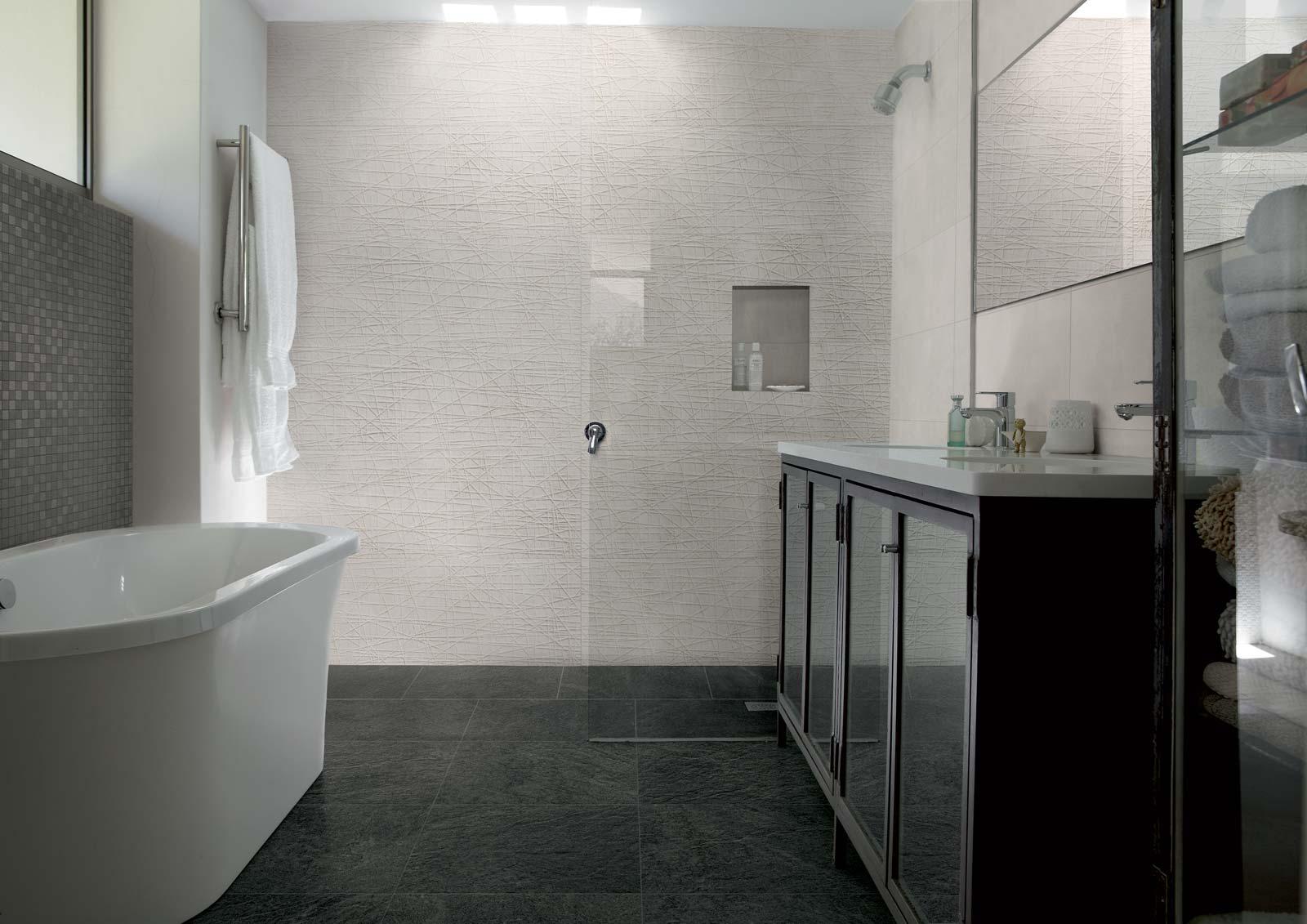 Fabric ist die neue Marazzi Kollektion aus weißscherbiger Keramik, der die Texturen und Farben von Naturfasern wie Baumwolle, Jute, Leinen, Hanf und Wolle als Vorlage dienten.