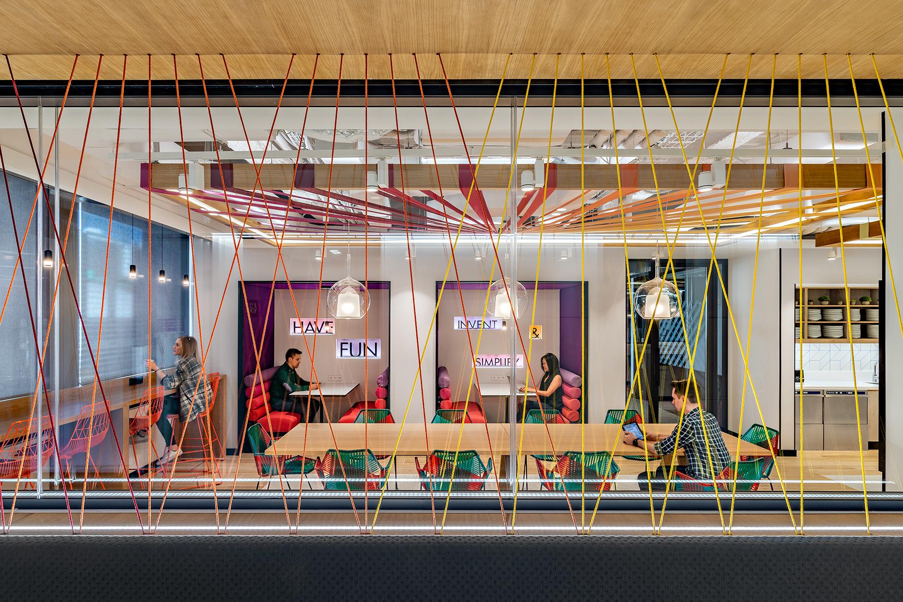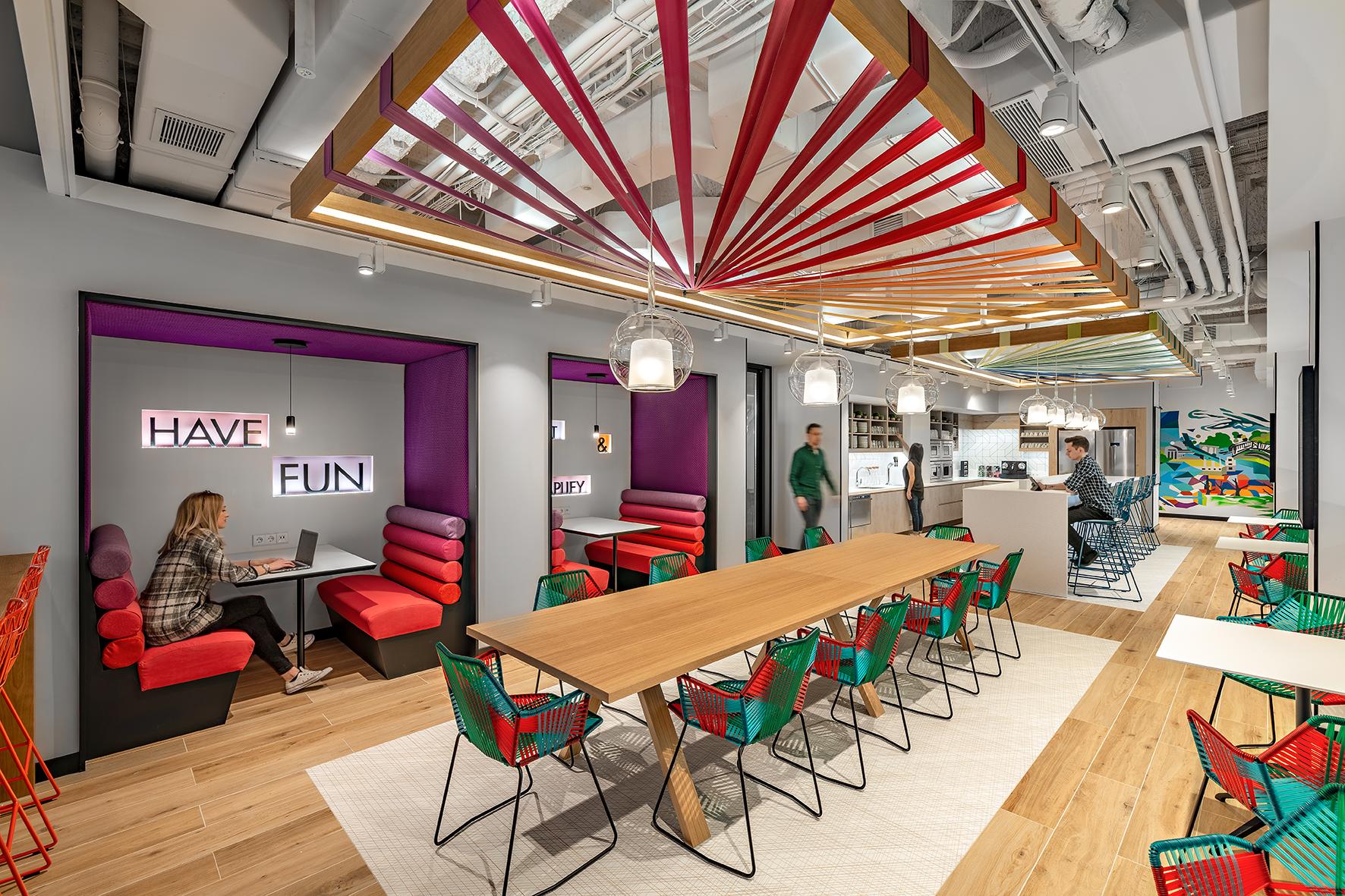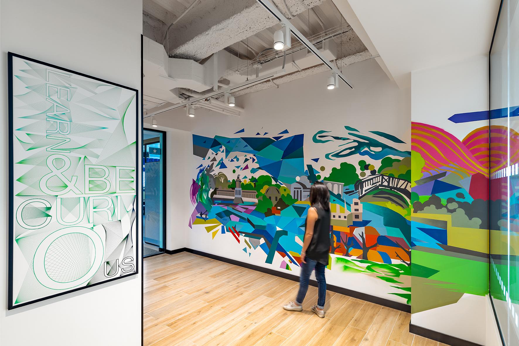 Als wesentliche Inspirationsquelle für dieses Projekt dienten die Murales der Stadt, nach deren Vorlage die Gestaltung der Innenwände der Gemeinschaftsbereiche und der Büros erfolgte. Im Rahmen der Vergrößerung und Erweiterung der Räumlichkeiten wollten die Architekten die Farbpalette der bereits vorhandenen Innenbereiche berücksichtigen und die Stadt und ihre Farben in die Gestaltung der Innenflächen der Arbeitsambiente einbringen. Die Räume sind dadurch sehr hell und farbenfroh, was nicht nur der Philosophie des Unternehmens, sondern auch den aktuellen Trends des Interior Designs entspricht.
