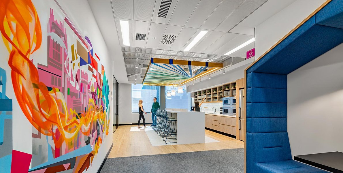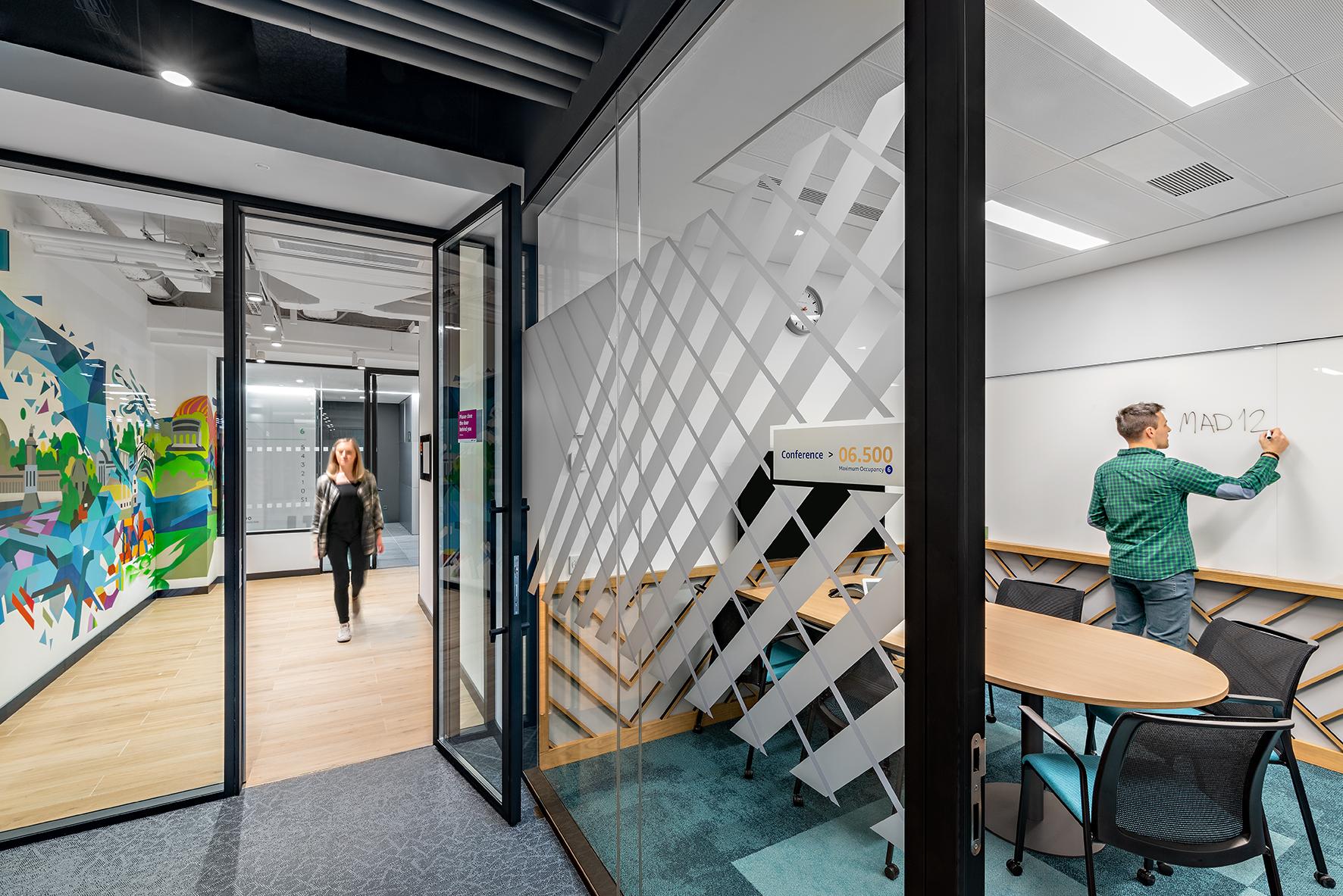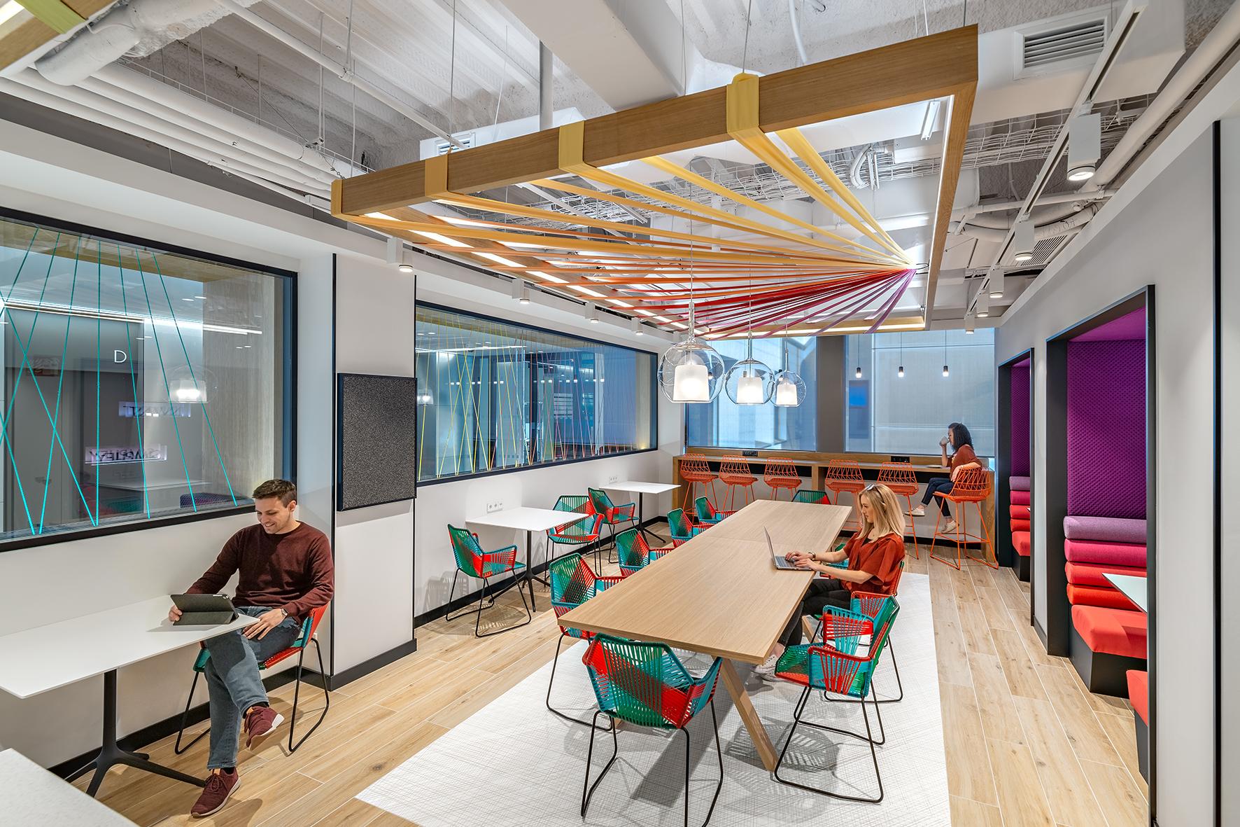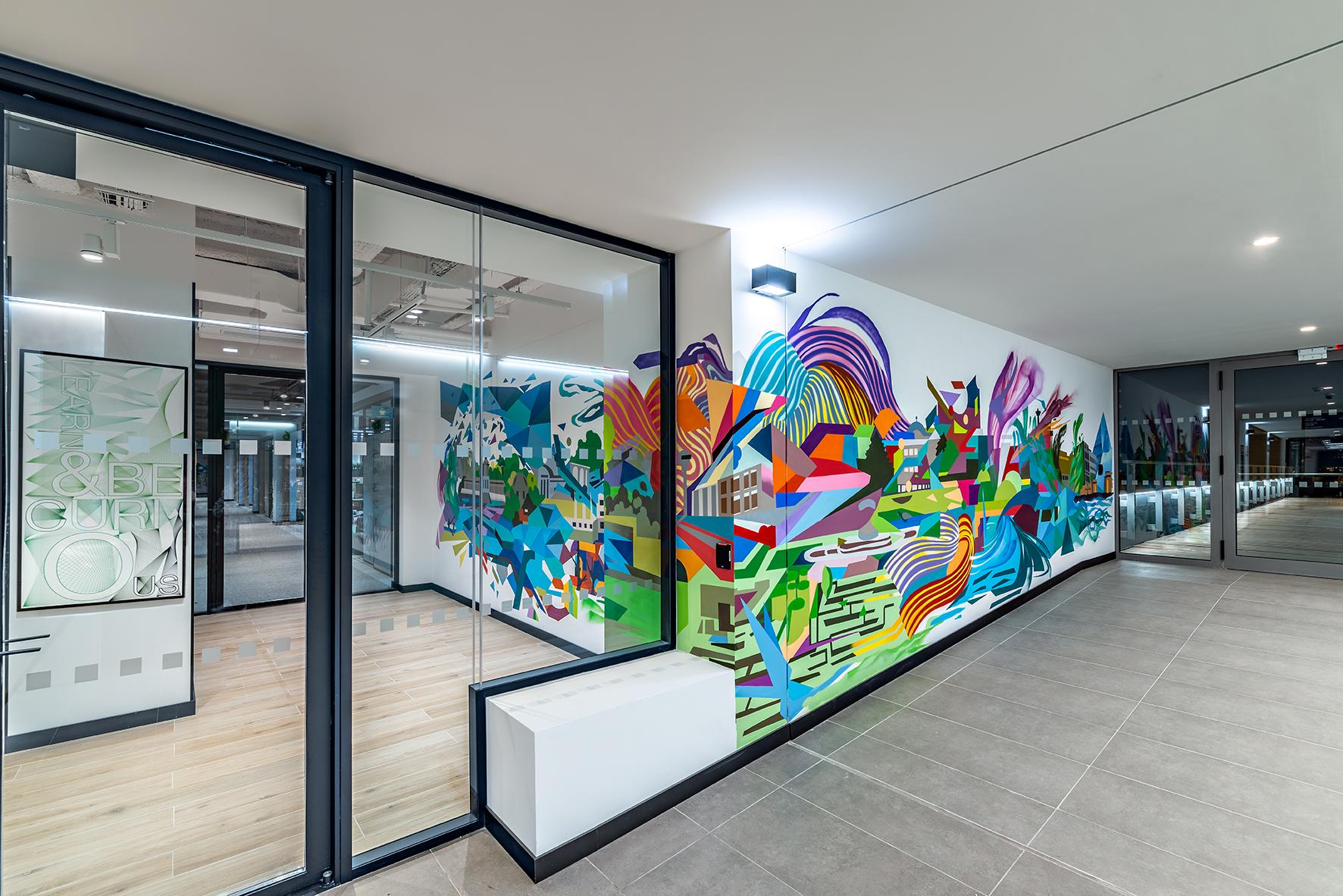 Als wesentliche Inspirationsquelle für dieses Projekt dienten die Murales der Stadt, nach deren Vorlage die Gestaltung der Innenwände der Gemeinschaftsbereiche und der Büros erfolgte. Im Rahmen der Vergrößerung und Erweiterung der Räumlichkeiten wollten die Architekten die Farbpalette der bereits vorhandenen Innenbereiche berücksichtigen und die Stadt und ihre Farben in die Gestaltung der Innenflächen der Arbeitsambiente einbringen. Die Räume sind dadurch sehr hell und farbenfroh, was nicht nur der Philosophie des Unternehmens, sondern auch den aktuellen Trends des Interior Designs entspricht.