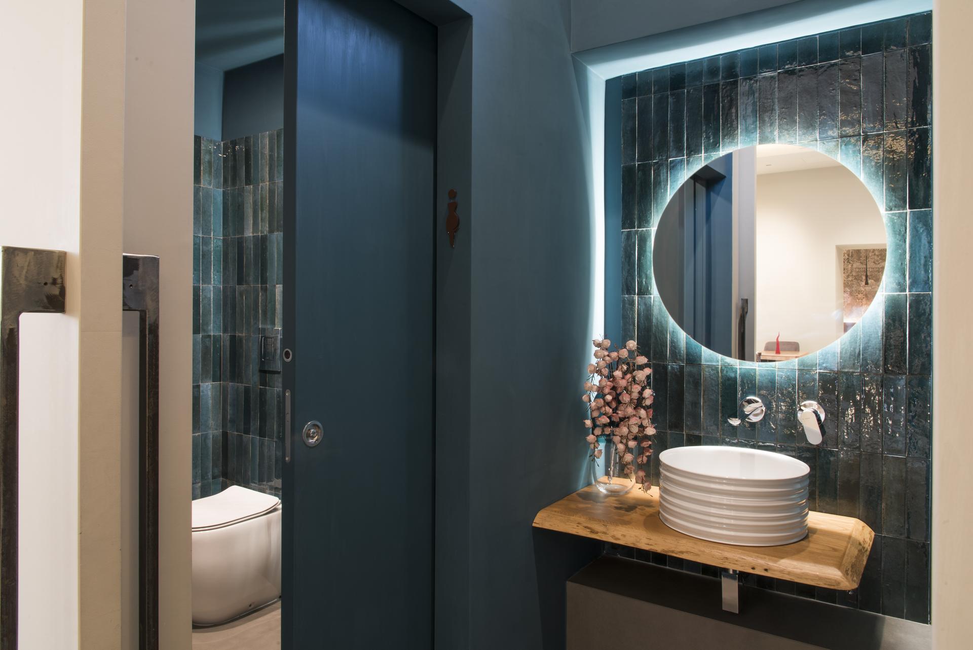 Die internen Gasträume wurden mit dem extraflachen Feinsteinzeug in Betonoptik Grande Concrete Look mit der Materialstärke 6 mm im Format 160×320 cm und in der Farbe Graphite gestaltet. Der fugenarme Bodenbelag verleiht dem Ambiente eine exklusive, minimalistische Ausstrahlung. Er setzt sich auch in den Sanitärräumen fort, deren Wände in den leuchtenden Farben der schmalen Hochglanzfliesen aus der Feinsteinzeugkollektion Crogiolo Lume Blue im eigenwilligen Format 6×24 cm erstrahlen. Die keramischen Flächenbeläge bilden ein spannungsreiches Ensemble mit den natürlichen Materialien, die das Restaurant ausgestalten: die Steinstufen zwischen den Gasträumen, das Holz der klassischen Möbel und der Tuffstein in der Außenveranda.