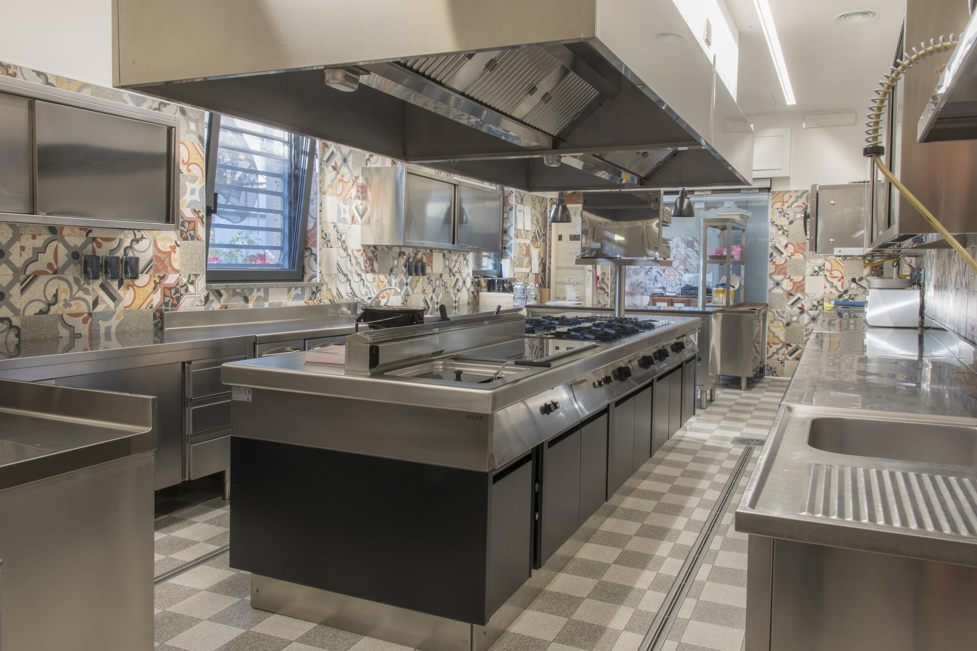 Im Herzen der Locanda Nonna Rosa, wo die große, wohlorganisierte Küche liegt, atmet alles Tradition: das Fliesenformat schrumpft auf 20×20 cm, das Dekor verweist mit Terrazzo-Optik auf die Historie und Zementfliesen bestechen mit antikem Charme. Crogiolo D_Segni Scaglie wurde hier als Decoro Mix (an der Wand) und mit einem Schachbrettmuster in den zwei Farben Weiß und Anthrazit (am Boden) verlegt.