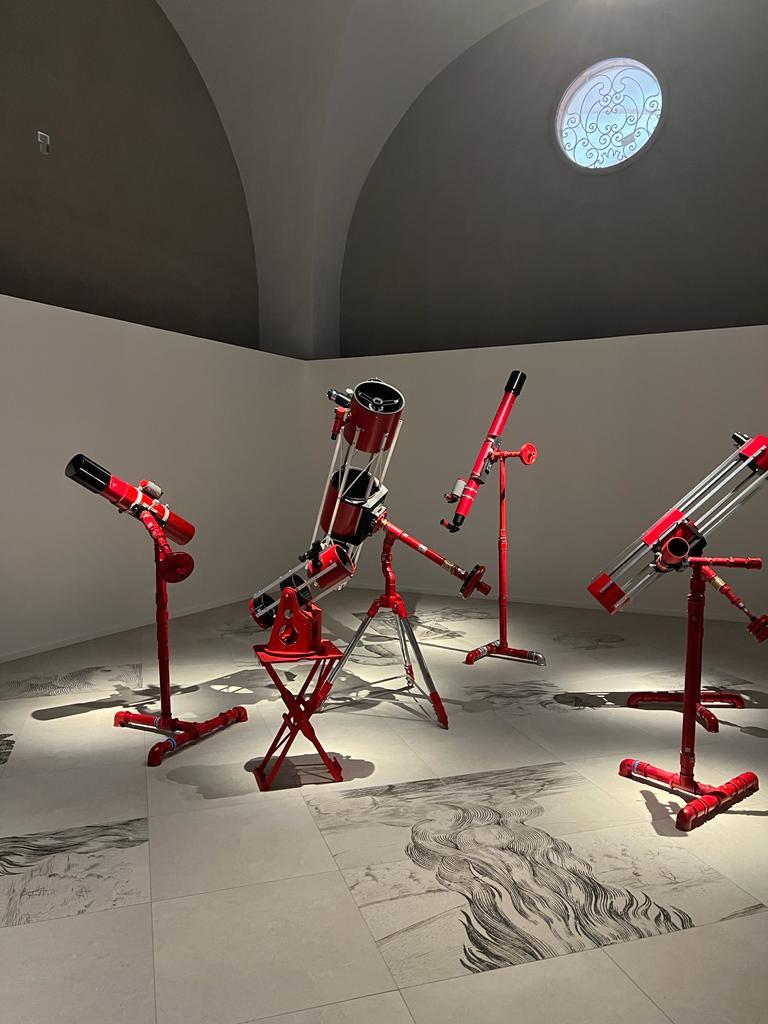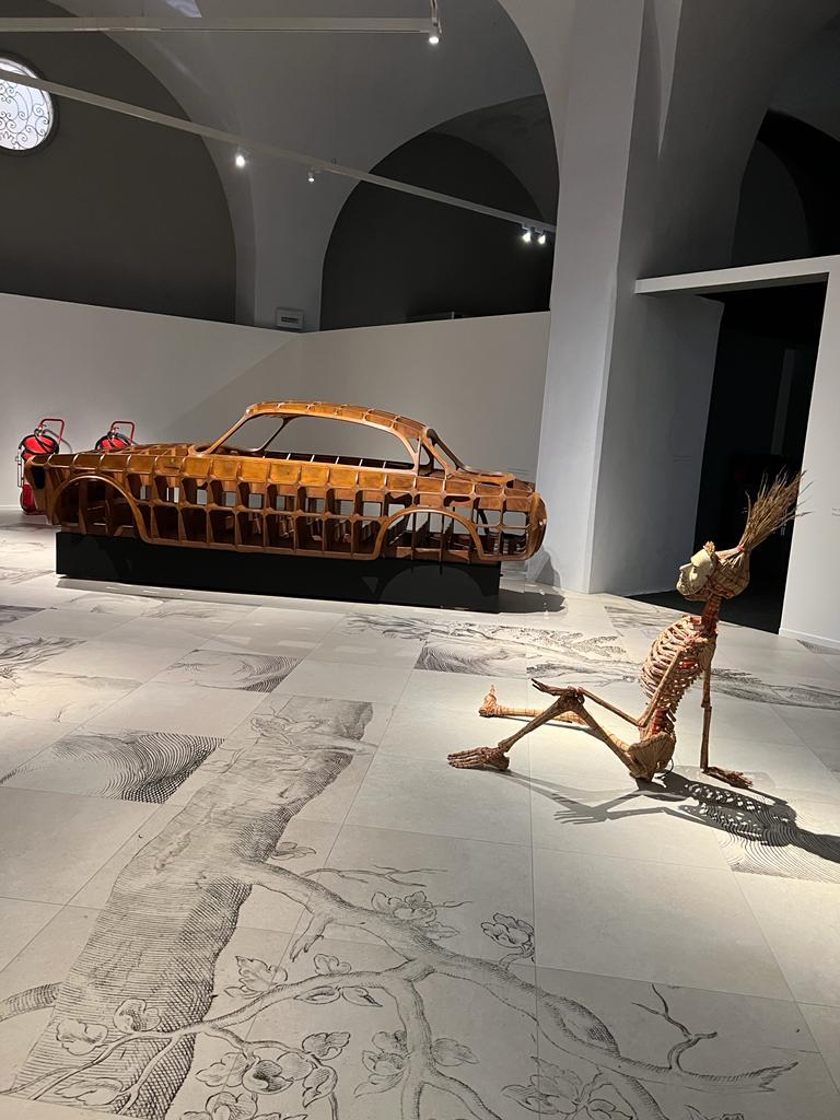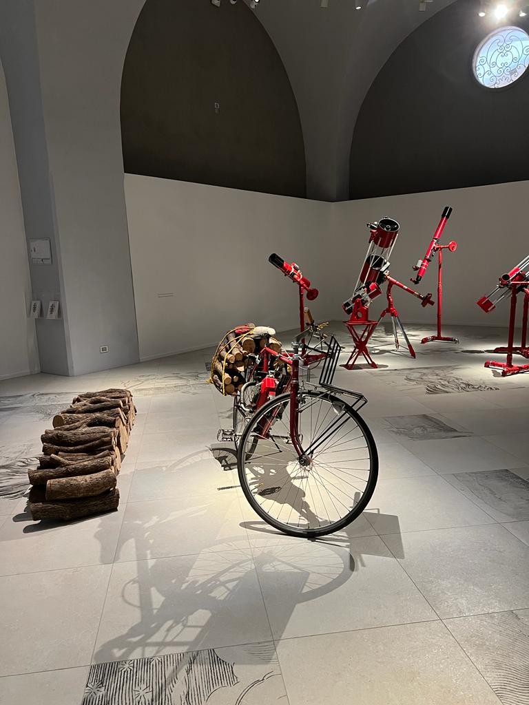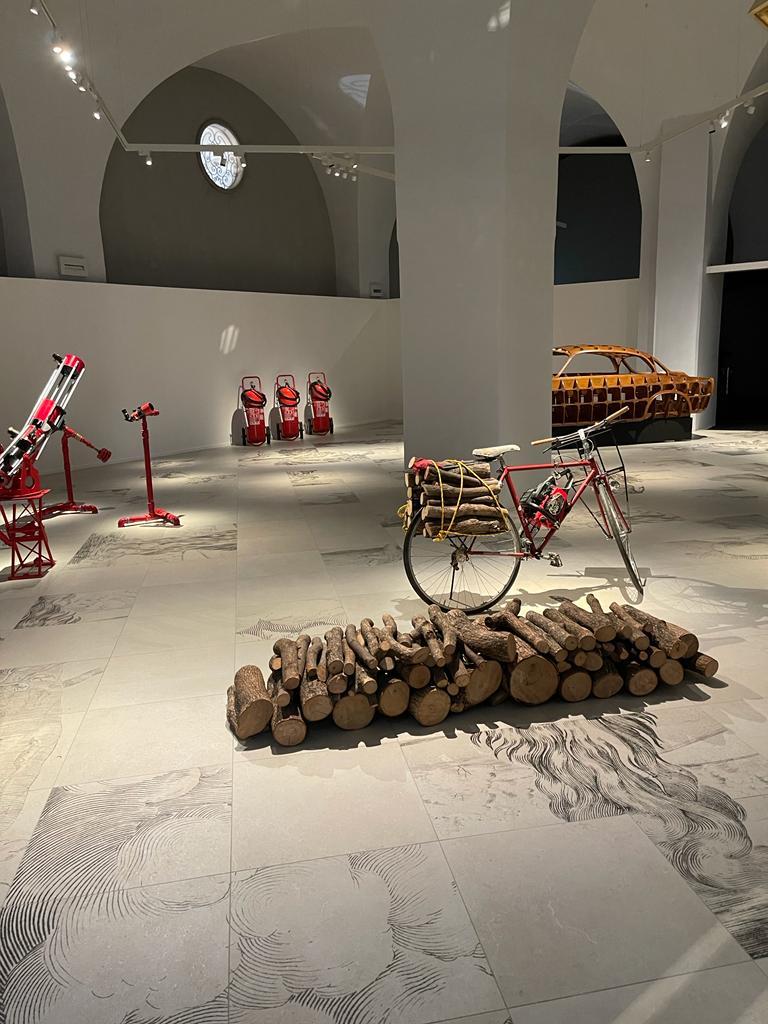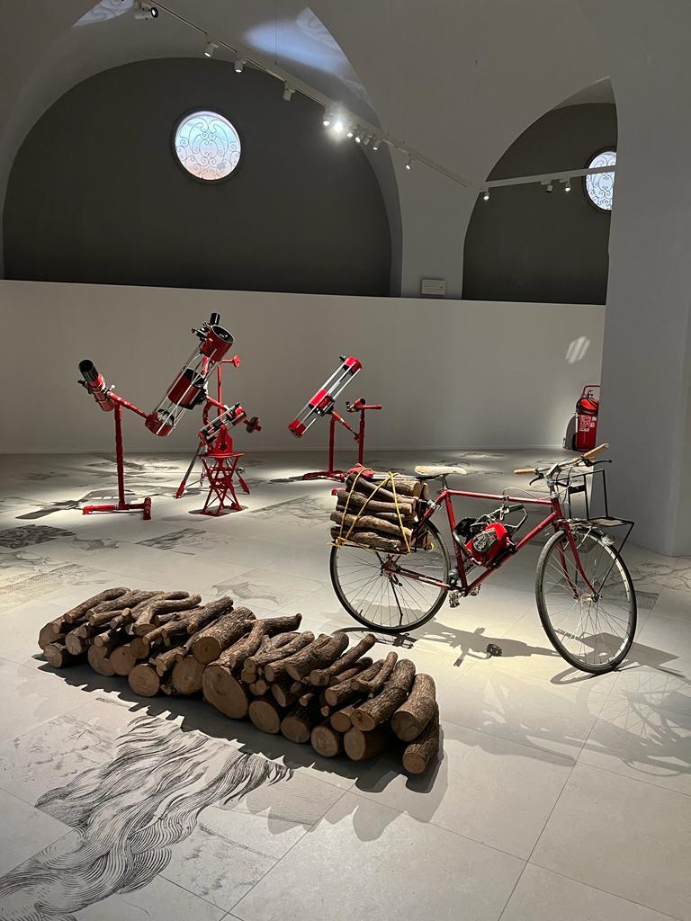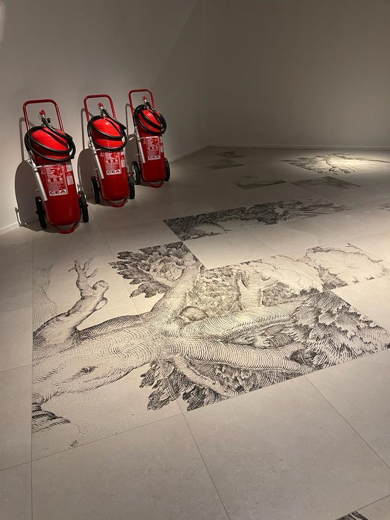 Die Installation tritt auch in einen Dialog mit einigen Illustrationen, die aus den Seiten der kostbaren Bände der Biblioteca Estense ausgewählt wurden, und mit weiteren Werken des Künstlers selbst. Die Besucherinnen und Besucher werden so eingeladen, in das suggestive Szenarium einzutauchen. „Der Fußboden stellt ein Labyrinth dar und fügt riesig vergrößerte Bildausschnitte von Holzschnitten aus dem 18. und 19. Jahrhundert zu einer Collage aus Bäumen, Bränden und Rauchwolken zusammen, die an eine Metamorphose erinnert. Himmel und Erde flammen zu einem riesigen Feuer auf, das vor unseren Augen zu brennen scheint und Bilder heraufbeschwört, die leider inzwischen vertraut sind und den Notstand unseres Planeten und den Klimawandel aufzeigen. Das Projekt soll die aktuelle Lage historisch einordnen. […] Es ist eine Zeitreise durch unsere Verantwortlichkeiten.“