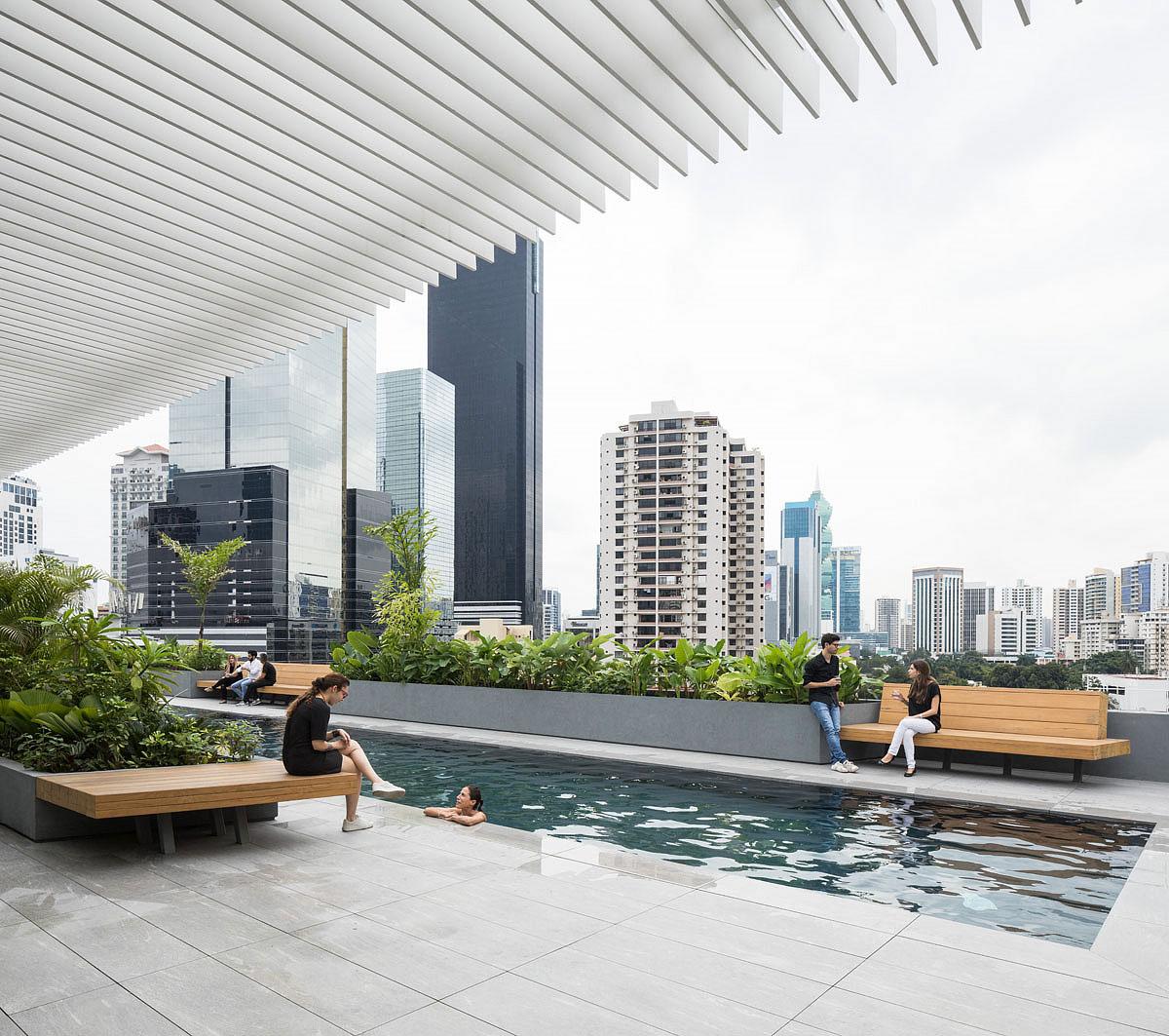 Ein Dachpool, ausgekleidet mit Mystone Pietra di Vals, lädt zur Entspannung in den Kreativpausen ein