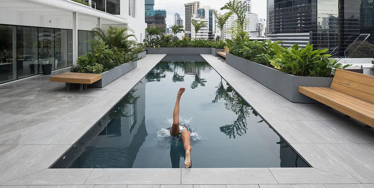 Den Architekten steht auch ein Dachpool zur Verfügung, der direkt mit einem internen Gemeinschaftsraum verbunden ist. Da Innen- und Außenbereich eine weitestgehend einheitliche Gestaltung aufweisen sollten, erhielten Innenraum und Dachterrasse den gleichen Bodenbelag aus dem Feinsteinzeug Mystone Pietra di Vals von Marazzi.