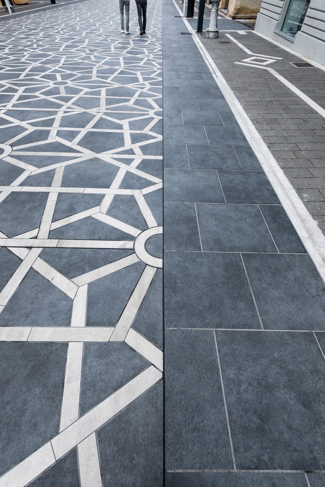Der große, geometrische Teppich, der sich auf der gesamten Straße ausbreitet und, wo es geht, an den bestehenden Bodenbelag aus Basaltplatten anschließt, ist mit dem 20 mm starken technischen Feinsteinzeug SistemN von Marazzi in den Farbtönen Sabbia und Grafite gestaltet. Speziell zugeschnitten nach dem Design der Planer ergibt es ein besonderes Muster. Bei diesem breit angelegten Outdoor-Projekt kommt das Potenzial der Serie besonders gut zur Geltung: die Möglichkeit zur kundenspezifischen Produktgestaltung und Ausführung personalisierter, präziser Schnitttechniken, die hohen technischen Leistungsmerkmale, die raffinierte Kombinationen ermöglichende Farbpalette.