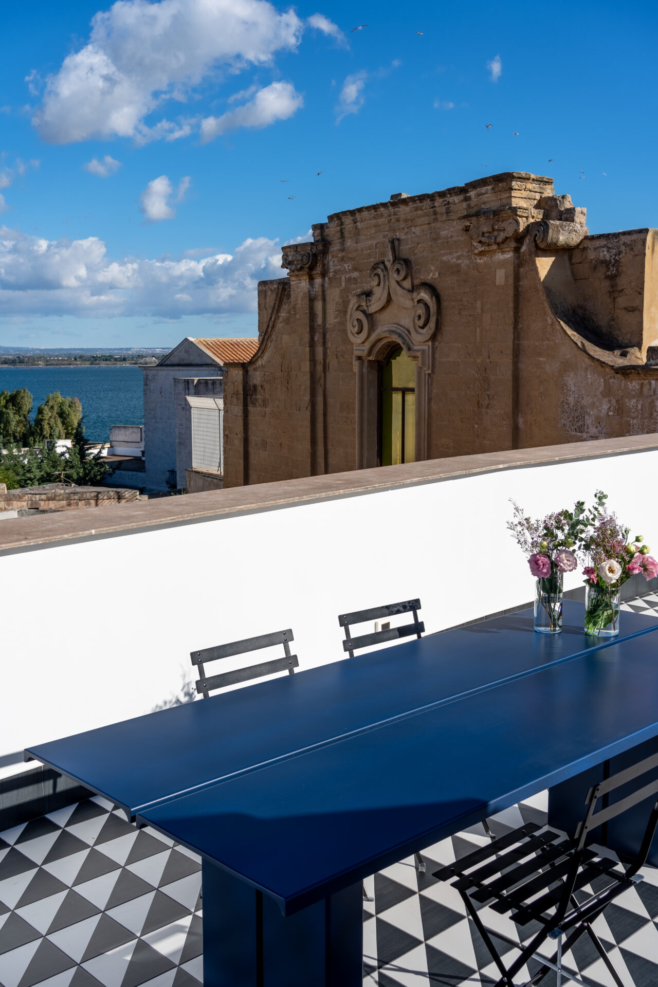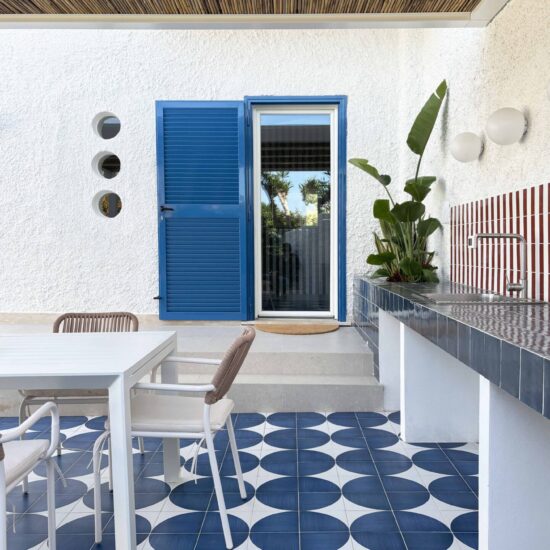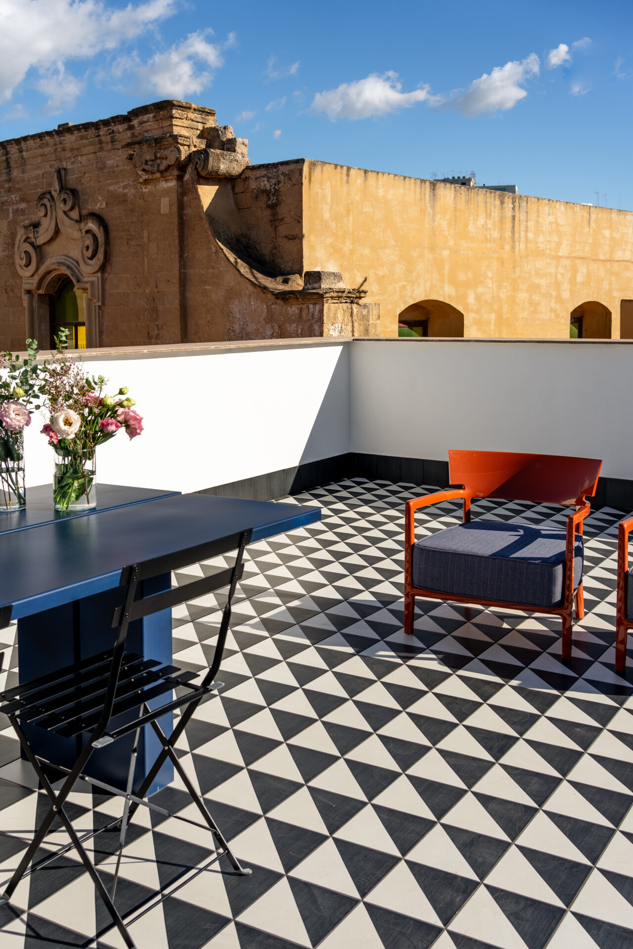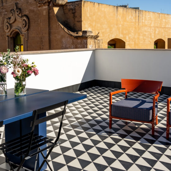 In Villa Gran Mare in Tarquinia Lido zeigt sich die Kollektion Scenario im Zusammenspiel von Weiß und Blau, mit der Dekoration Tappeto 2, die ausgewählt wurde, um das gesamte Haus und den Außenküchenbereich zu verkleiden und eine raffinierte sowie old fashioned Atmosphäre zu schaffen. Im Penthouse Terrasse zwischen den zwei Meeren in Tarent erlebt Scenario in der Variante Tappeto 1 in Schwarz-Weiß eine Wiedergeburt, die den Räumen Charakter und Modernität verleiht und zeitgenössisch auf die keramischen Oberflächen unserer materiellen Kultur verweist.