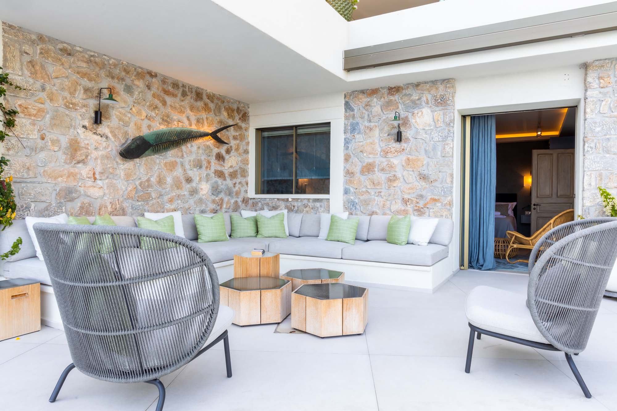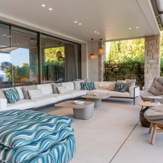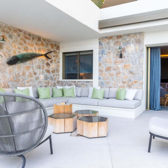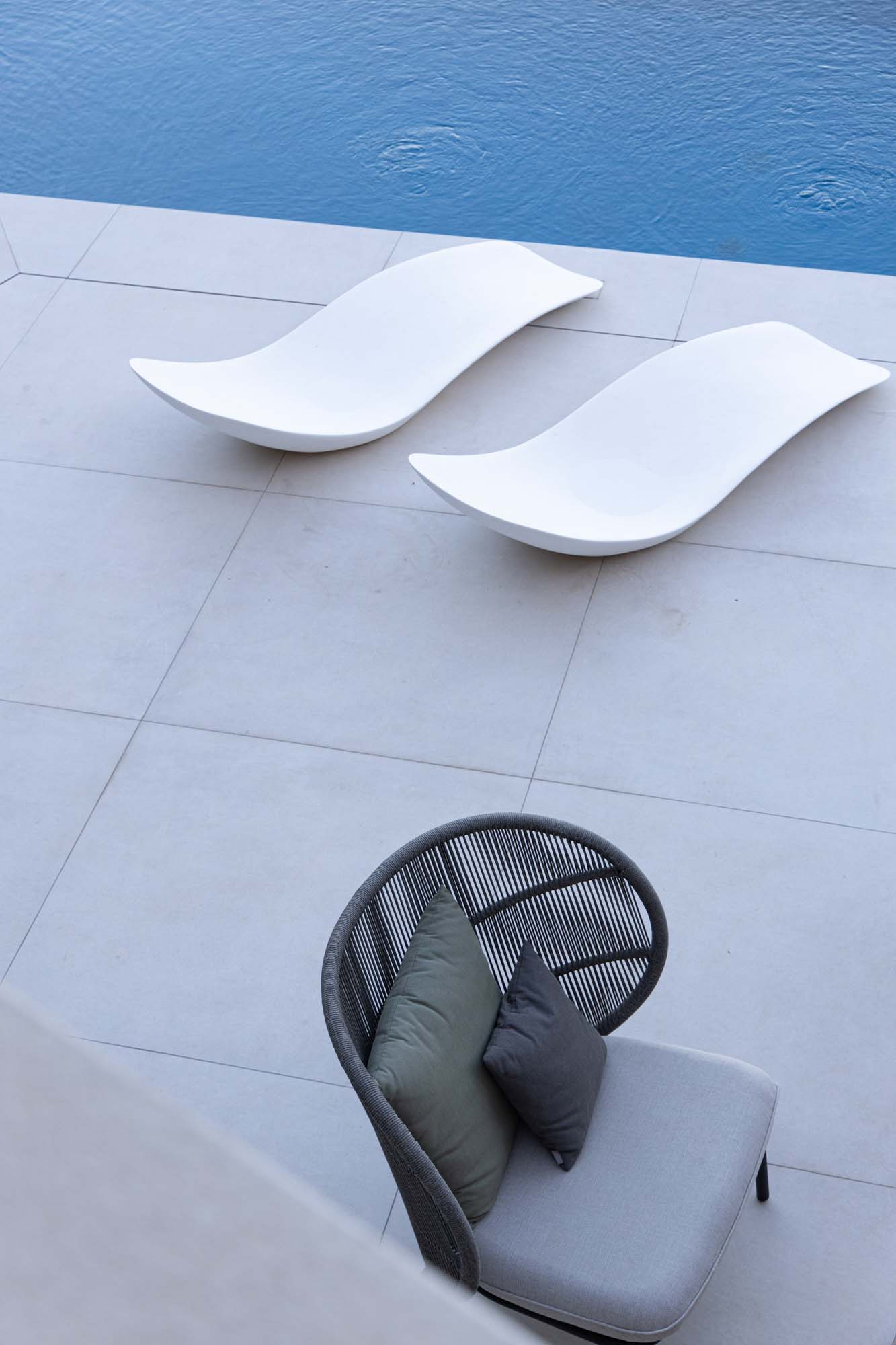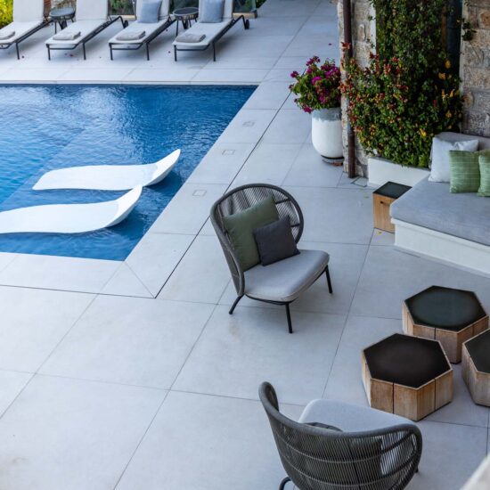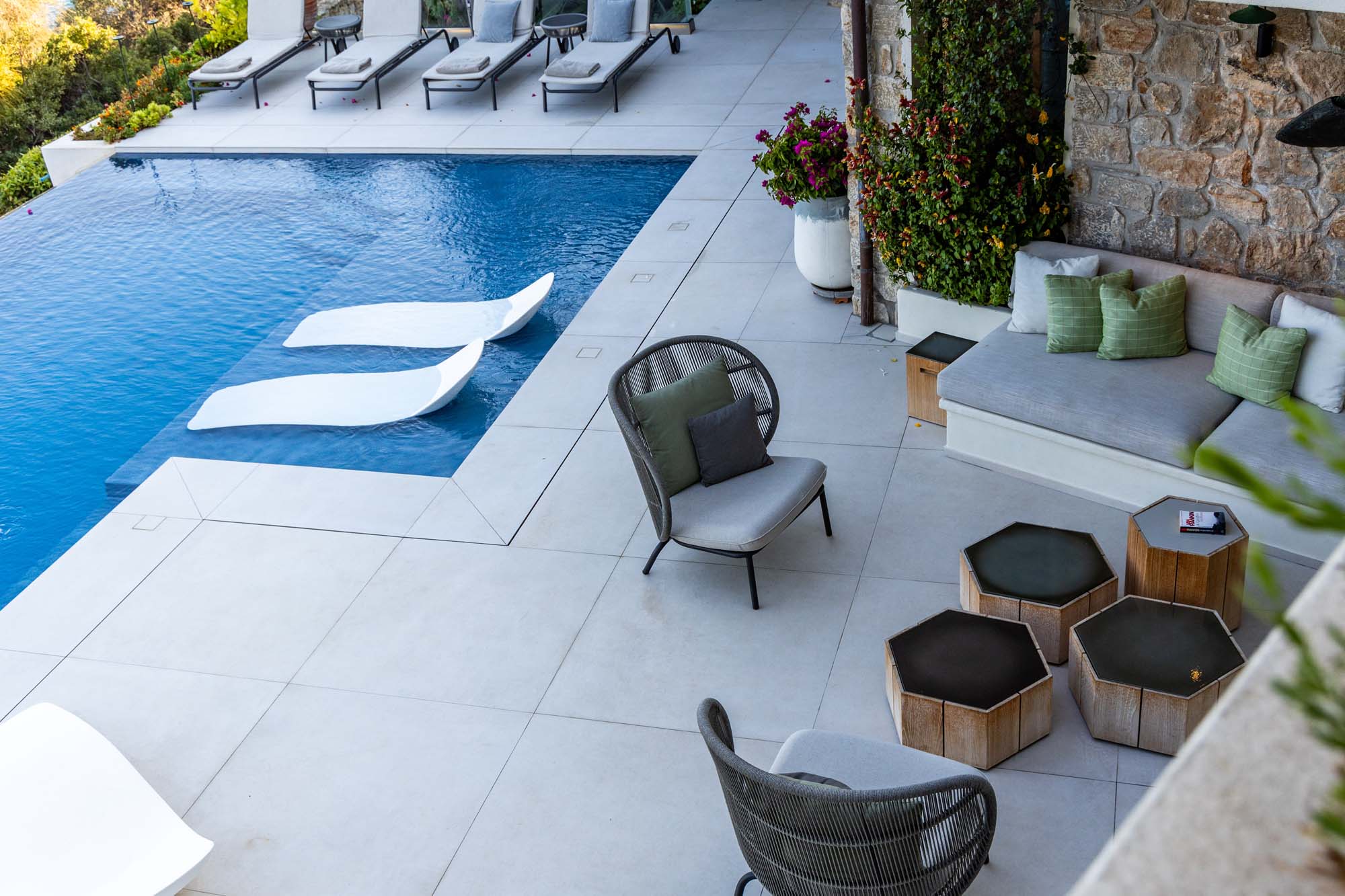 Ein prägnantes Beispiel für ihre Anwendung ist die Renovierung der Apollonio House, einer der Wohneinheiten des Wohnkomplexes, der in den 1970er Jahren vom modernistischen Architekten und Stadtplaner Constantinos Doxiadis entworfen wurde. Hier, in den großzügigen Außenbereichen und rund um den Pool, definieren die Marazzi-Oberflächen den Stil des Hauses und fügen sich harmonisch in den atemberaubenden Meerblick von Porto Rafti ein, nur wenige Kilometer von Athen entfernt. Für den Außenboden wurde die Kollektion Cementum in einem eleganten Ash-Ton gewählt, mit Platten im Format 120×120 und 60×120 cm, die Kontinuität und Charakter in die Außenbereiche bringen.