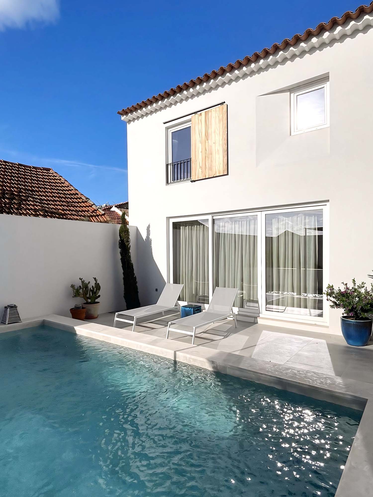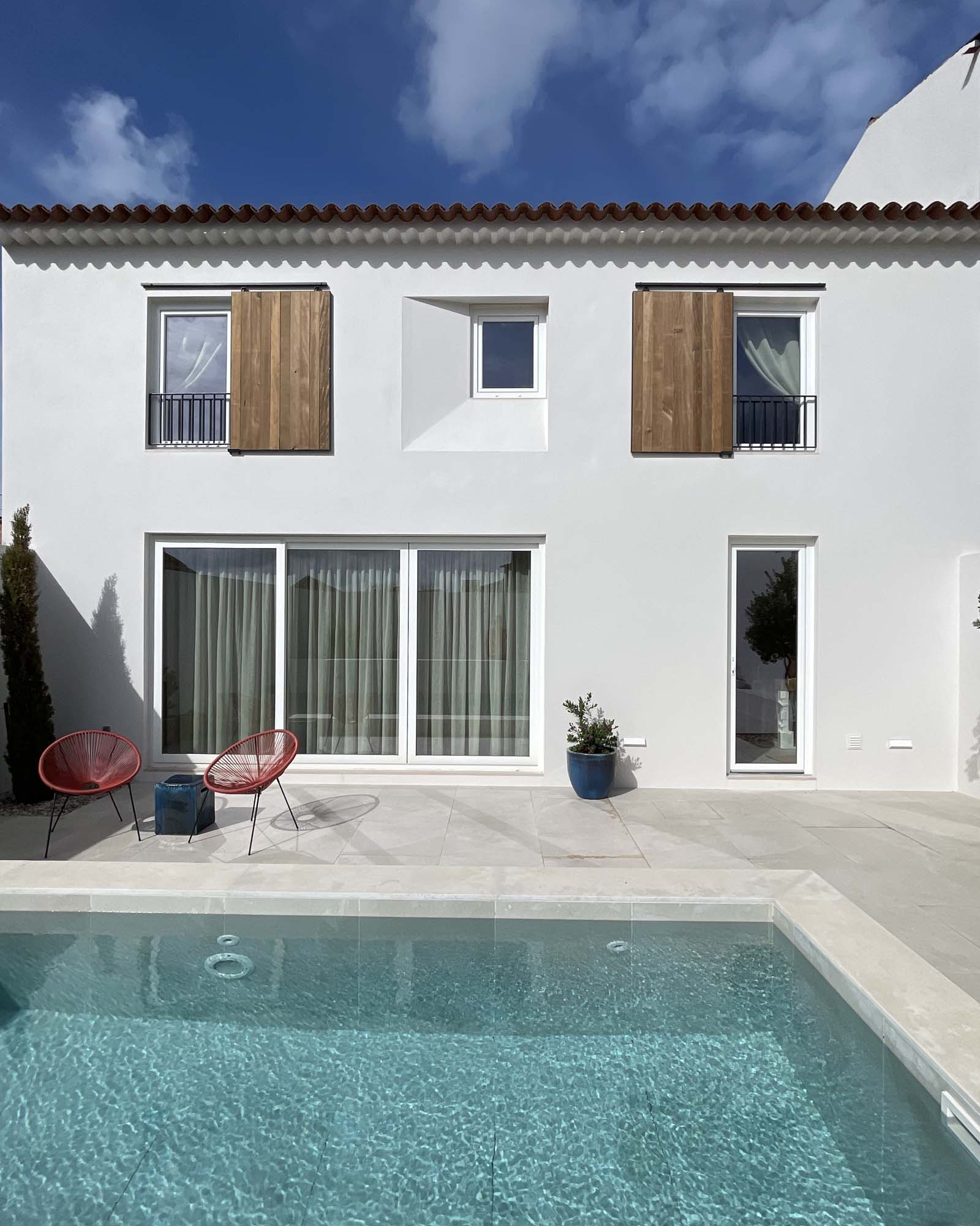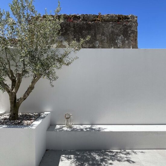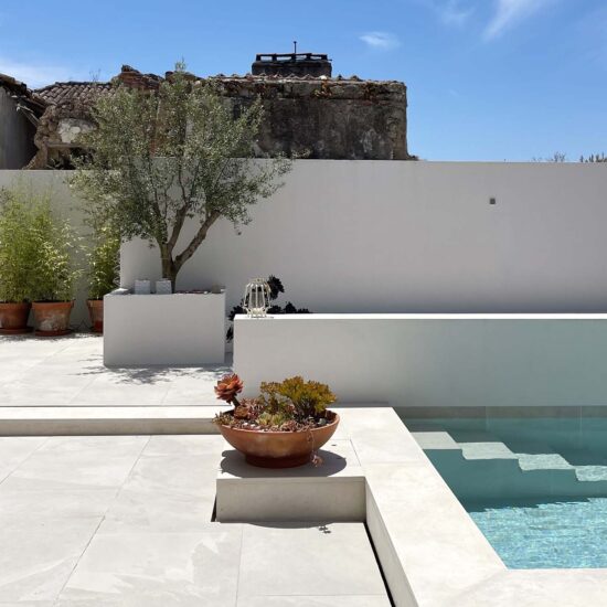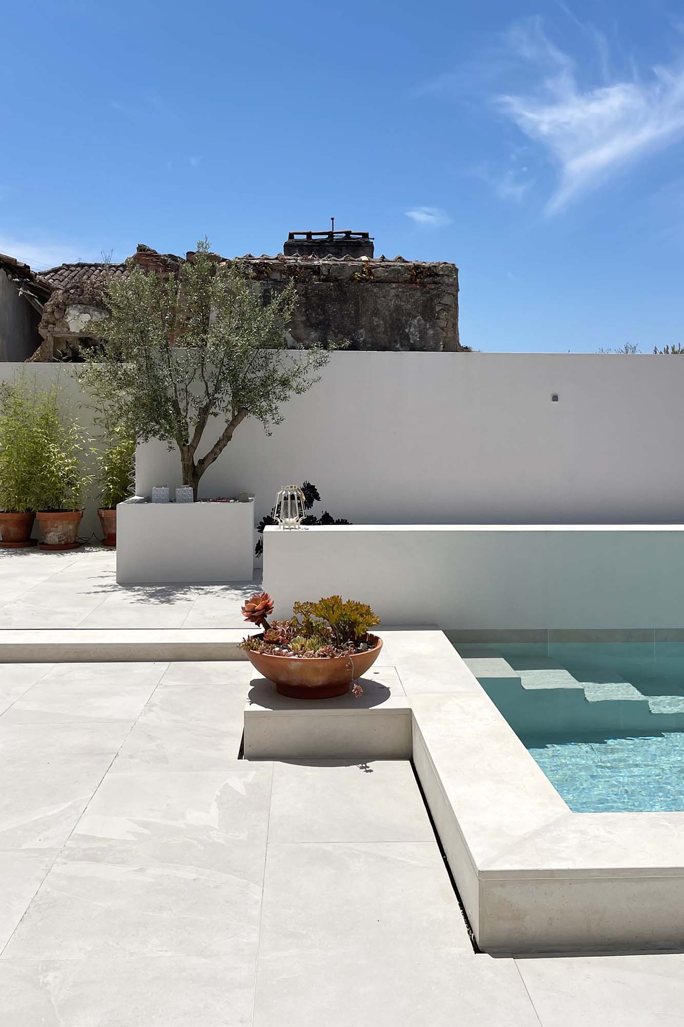 Ein Beispiel für die perfekte Harmonie zwischen Natur und Design findet sich in Casas da Ginja, in der ländlichen Umgebung von Lissabon. Der Pool und die Außenbereiche wurden mit Platten der Kollektion Mystone Ardesia neu gestaltet, in einem zarten Weiß und im großzügigen Format 75×150 cm. Die natürlichen Farbtöne, die im gesamten Haus gewählt wurden, umhüllen die Gäste mit einer warmen und einladenden Atmosphäre, die perfekt mit der umliegenden Landschaft harmoniert. Die Kontinuität zwischen Innen- und Außenbereich wird durch dieselbe Kollektion Mystone Ardesia in der Farbe Sand und im Format 60×60 cm gewährleistet, wodurch eine visuelle und materielle Verbindung entsteht, die das Haus zu einer Einheit mit der Umgebung macht.