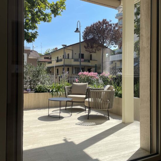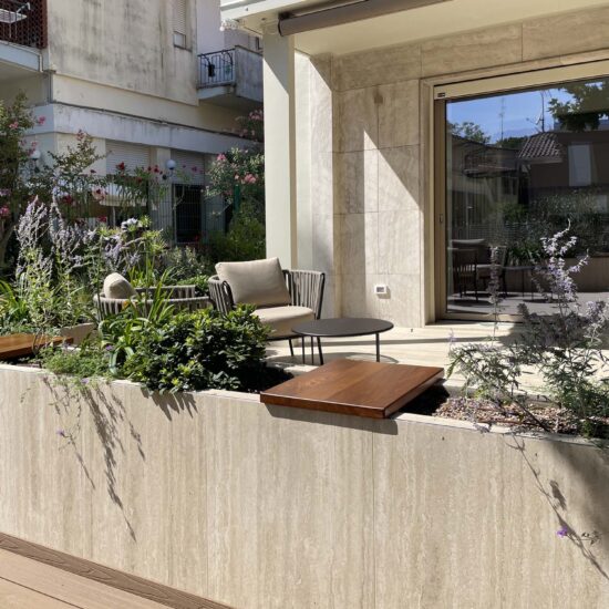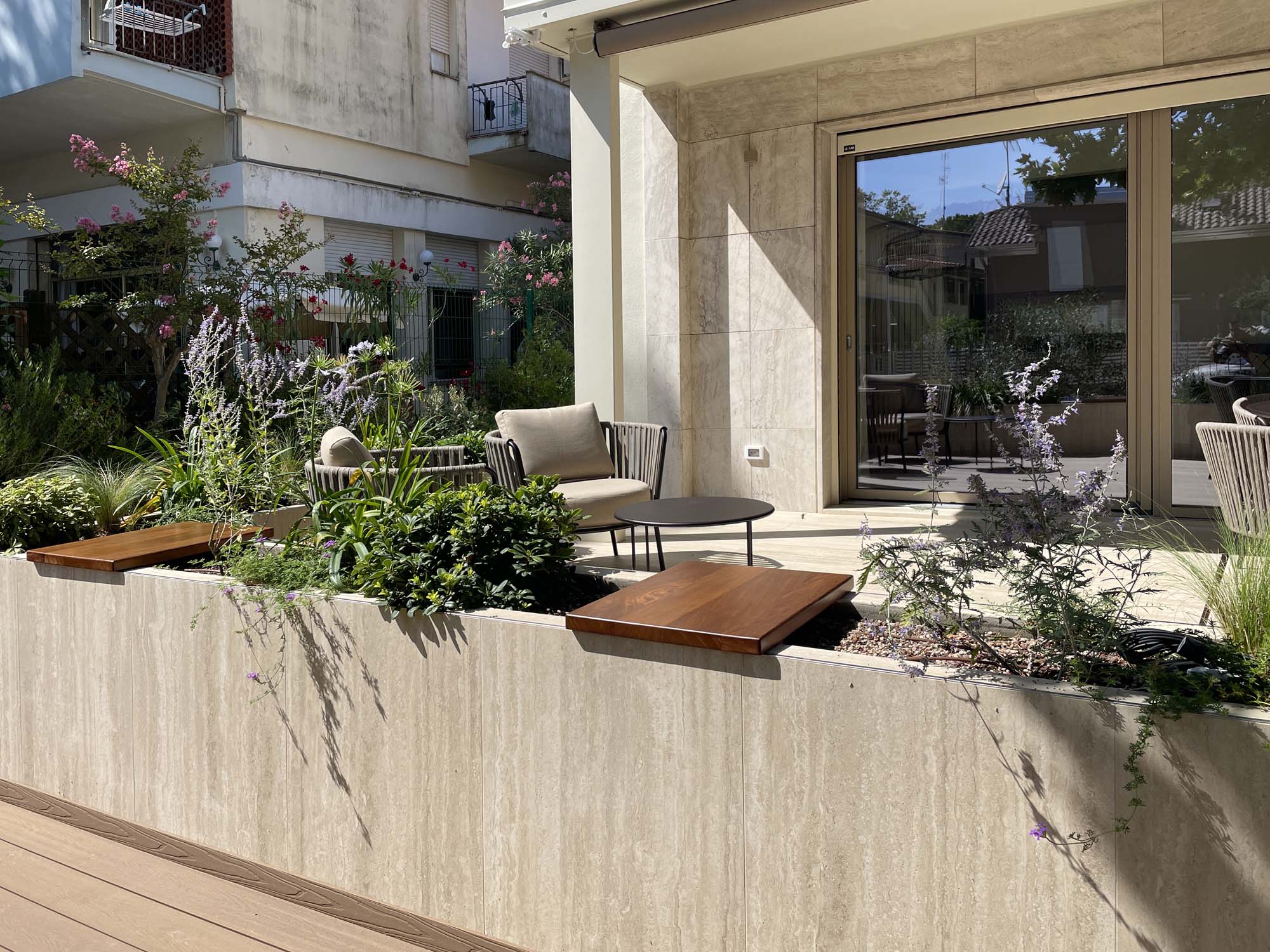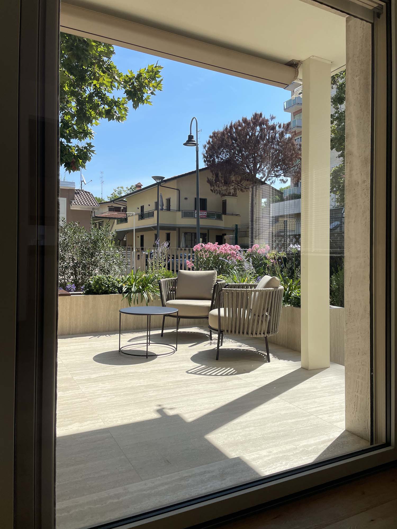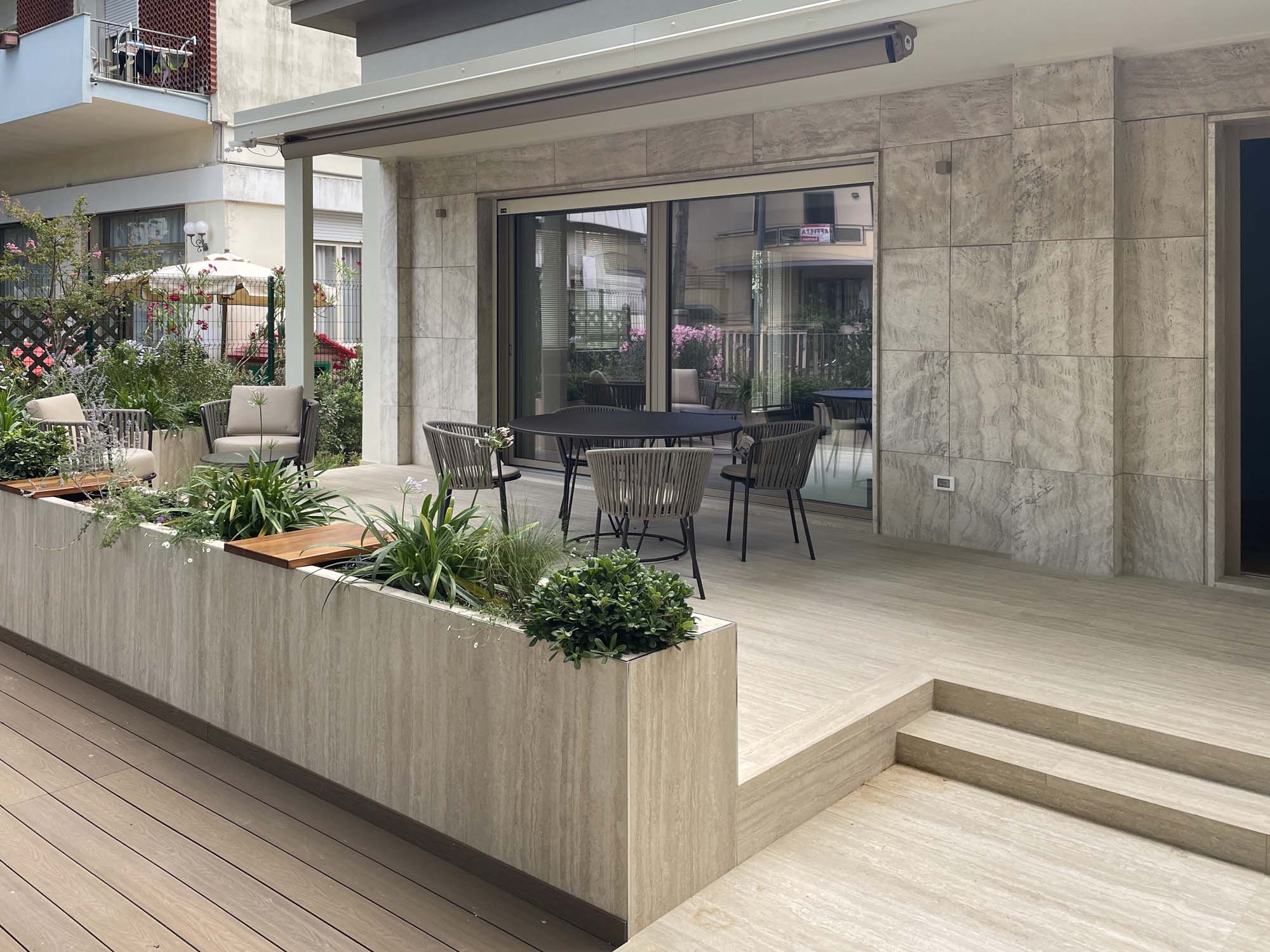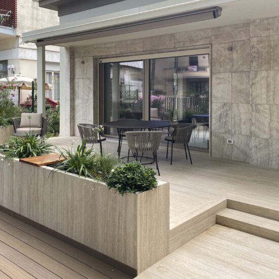 Schließlich feiert in Cervia, in der Provinz Ravenna, das Erneuerungsprojekt der Villetta Volturno — eine typische Residenz der 1960er Jahre mit Blick auf die Küste — die Tradition durch seine ikonische Fassade aus Travertinmarmor. Dieses wertvolle Merkmal wird durch die Kollektion Mystone Travertino Classico im Außenbereich weitergeführt, die mit natürlicher Eleganz die Maserungen und Farben des Originalmaterials nachbildet und dem gesamten Gebäude Kontinuität sowie Authentizität verleiht.