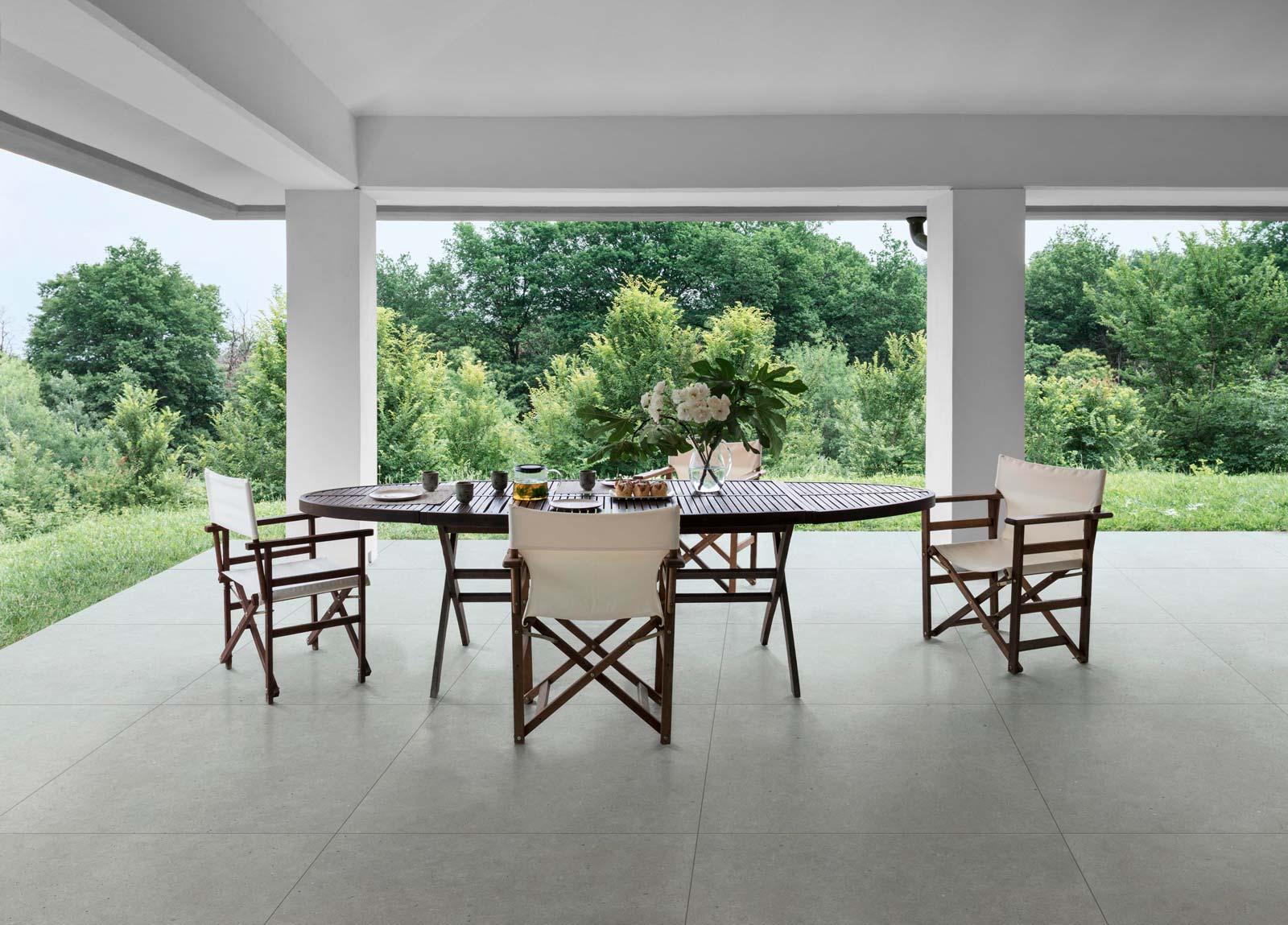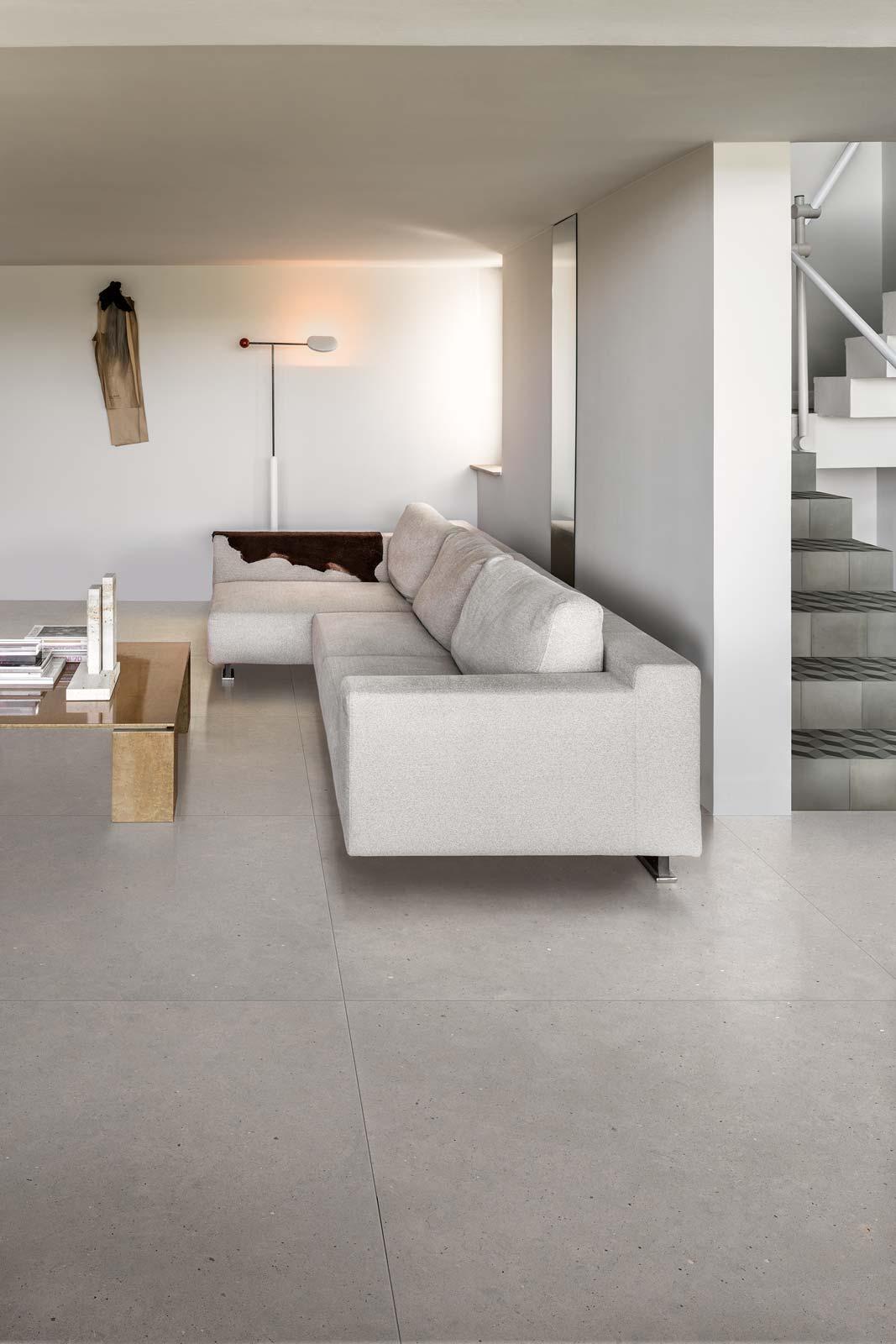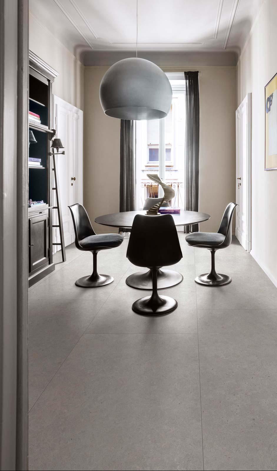 Neues Feinsteinzeug in Steinoptik, inspiriert vom Gestein Moongrey, im Großformat für den Innen- und Außenbereich