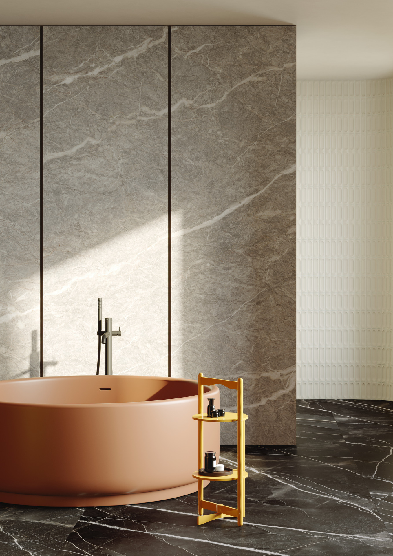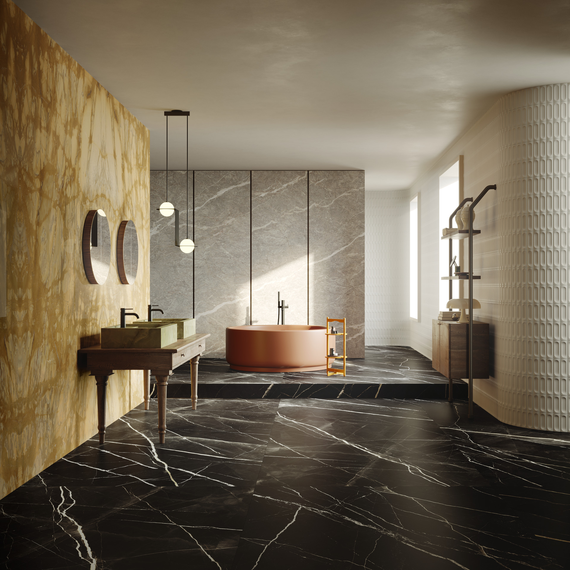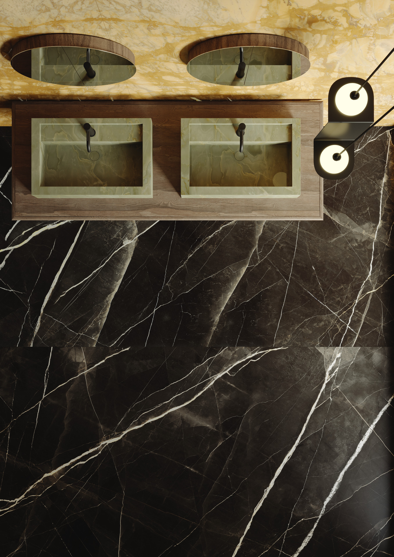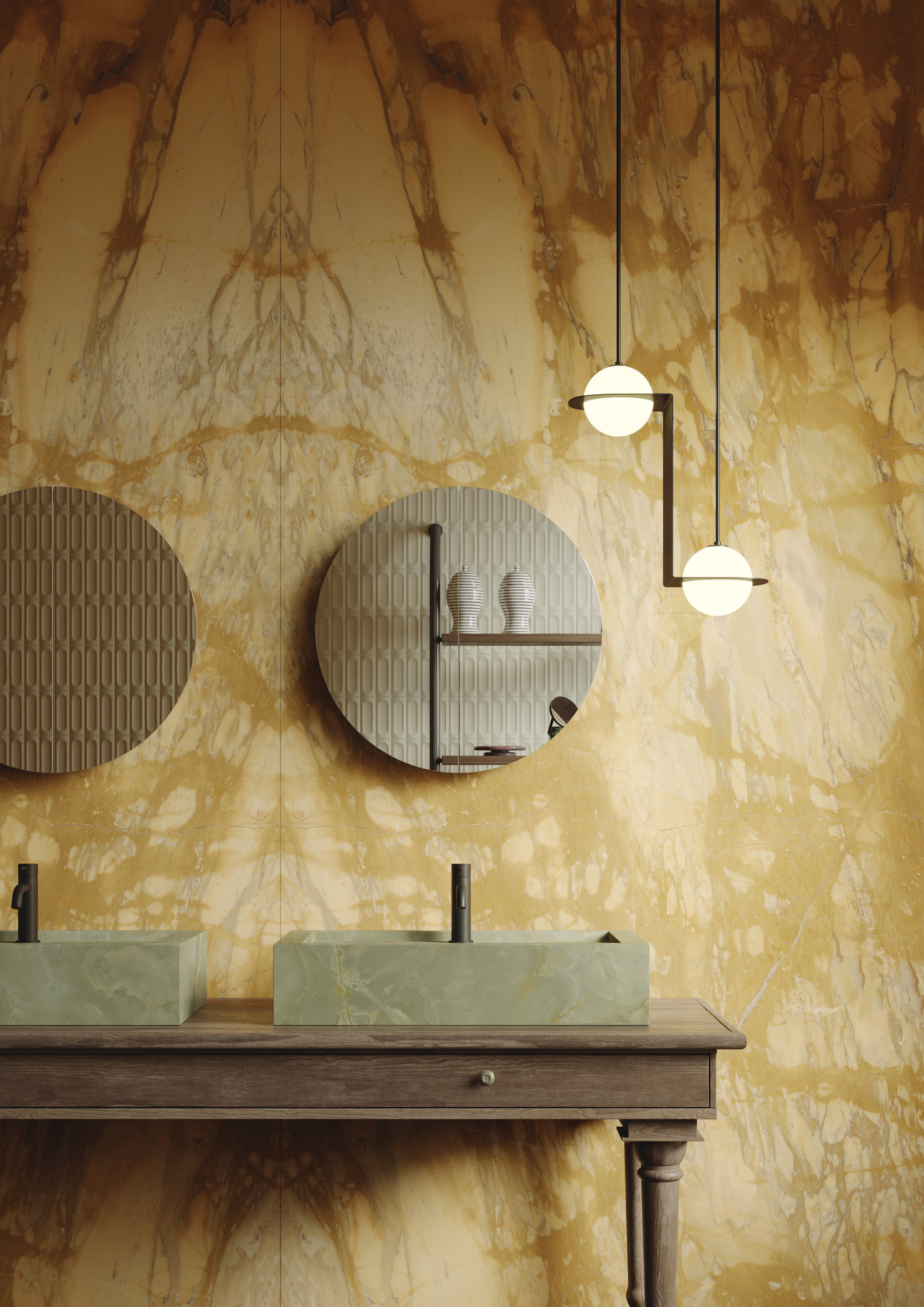 In diesem Bad leben die Äderungen und Farbschattierungen der edelsten, seltensten Marmorsteine in der Ära der Digitalisierung der natürlichen Texturen wieder auf, verblüffend naturgetreu und in der überraschenden Haptik des Großformats, ohne die Nachhaltigkeit der Baumaterialien zu vergessen. Das Erbe von Grande Marble Look Giallo Siena und Grande Marble Look Calacatta Black lässt im Hintergrund Raum für die moderne Ausstrahlung der Platte Grande Marble Look Fior di Pesco Carnico, mit der die Türen der Ausstellungsbox verkleidet sind, und Onice Giada, mit der die auf Vintage-Möbeln ruhenden Waschbecken gestaltet sind.
