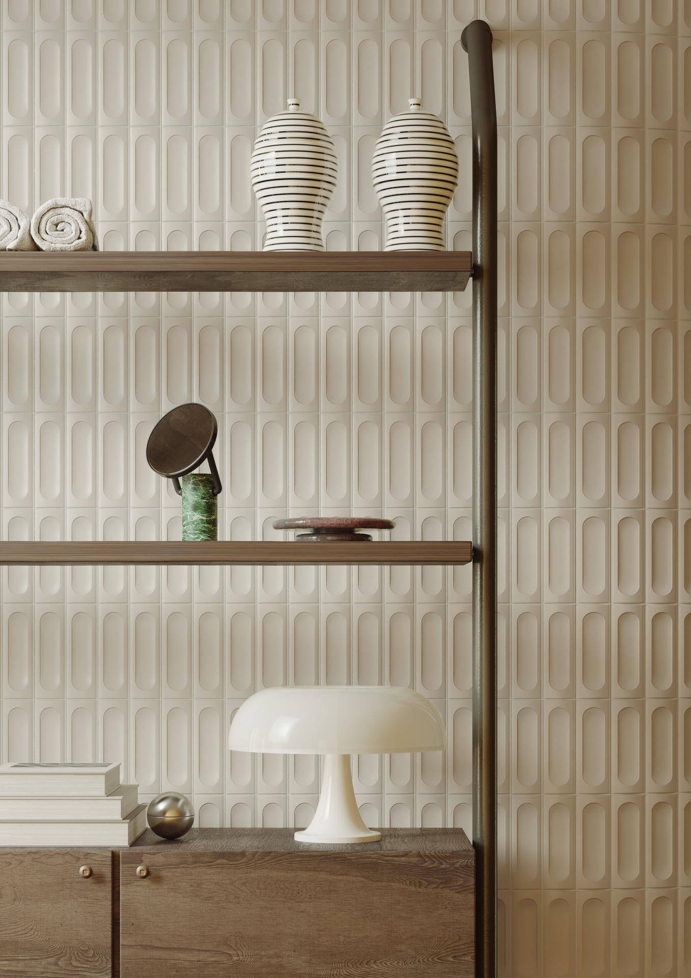 An der rechten Wand spielen die Fliesen Crogiolo Confetto mit Lichteffekten; es handelt sich um eine kleinformatige Feinsteinzeugkollektion mit einer unregelmäßigen halbmatten Oberfläche und einer angenehmen Haptik. Das Muster besteht aus dem Flachrelief-Modul (3D-Flachrelief Savoiardo, 5×15 cm), welches die berühmte Marazzi-Kollektion “Canne d'Organo” von Nino Caruso, einem Designer und Bildhauer der 1970-er Jahre, neu interpretiert. Hier zu sehen in der Farbe Bone. Die Kollektion bietet eine Auswahl an 12 kräftigen warmen und kalten Tönen.