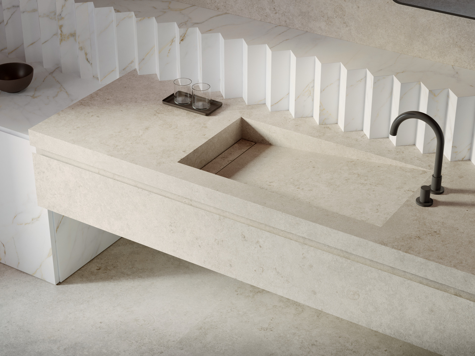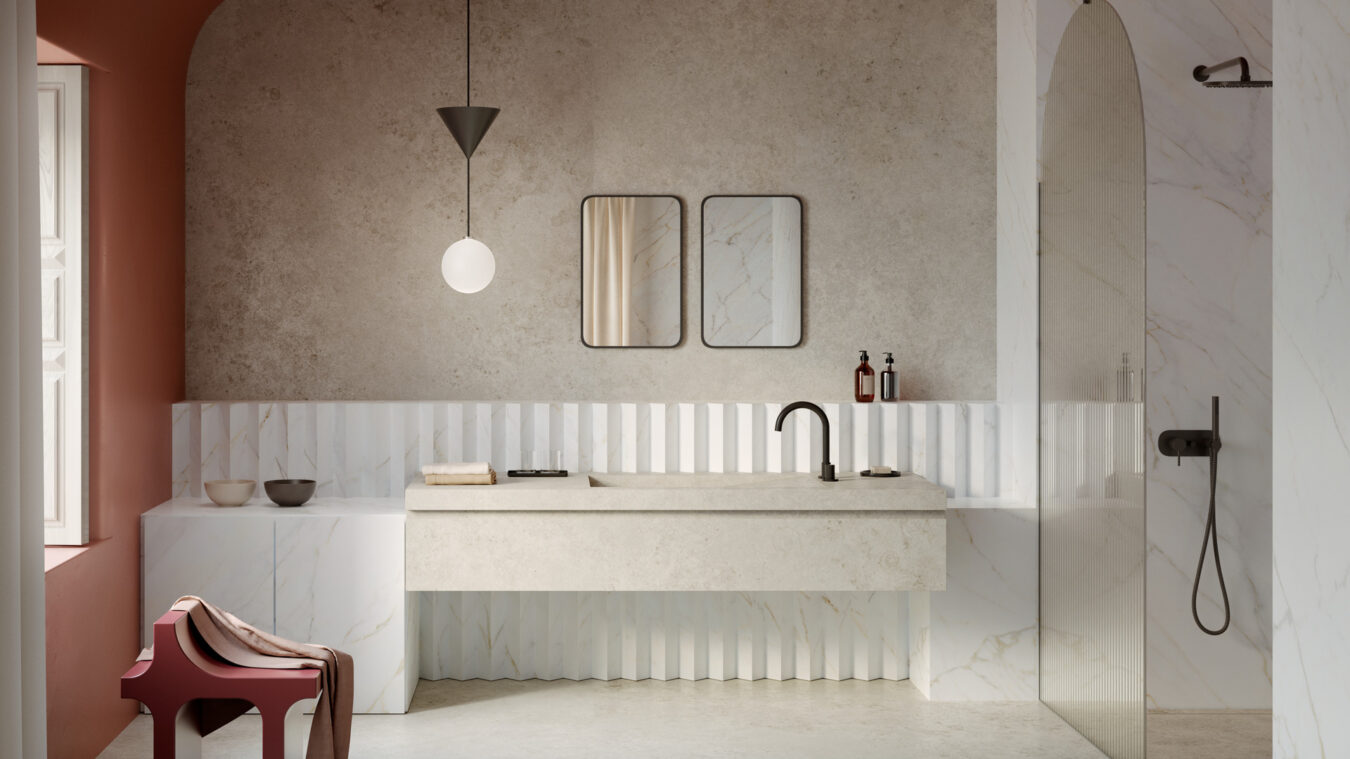 Marazzi The Top ist mit einem Planungstool vergleichbar. Und zwar nicht nur, weil die Serie dank ihrer Großformate die Anfertigung von Küchenarbeitsplatten, Fliesenspiegeln, Tischplatten, Wandverkleidungen oder Einrichtungselementen gestattet. Sondern auch, weil ihre Farben und Oberflächenvarianten mit etlichen Materialien kombinierbar sind. Das ermöglicht die Gestaltung nahtlos ineinander übergehender und miteinander kommunizierender Raumwelten sowohl im privaten als auch gewerblichen Bereich drinnen wie draußen.