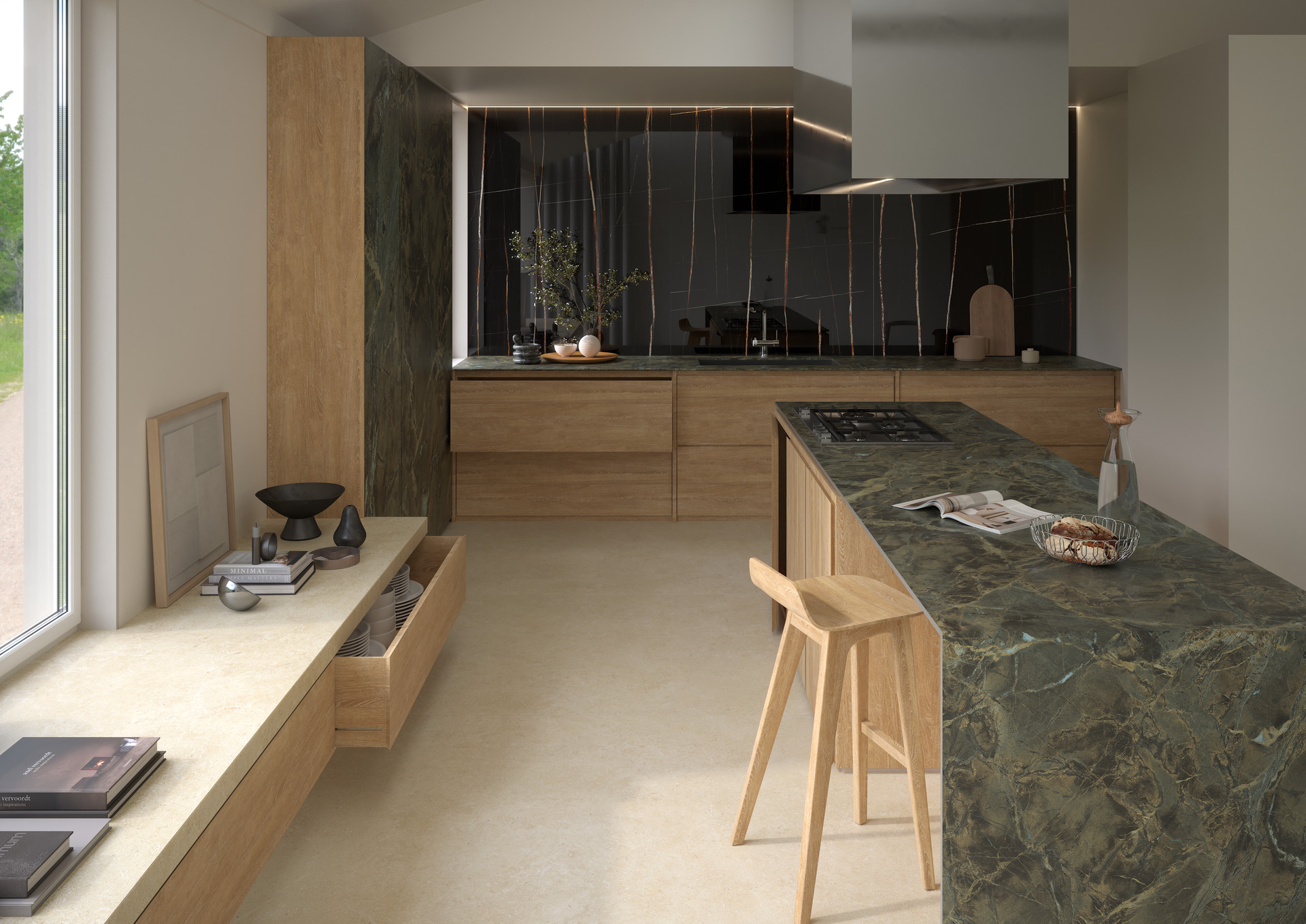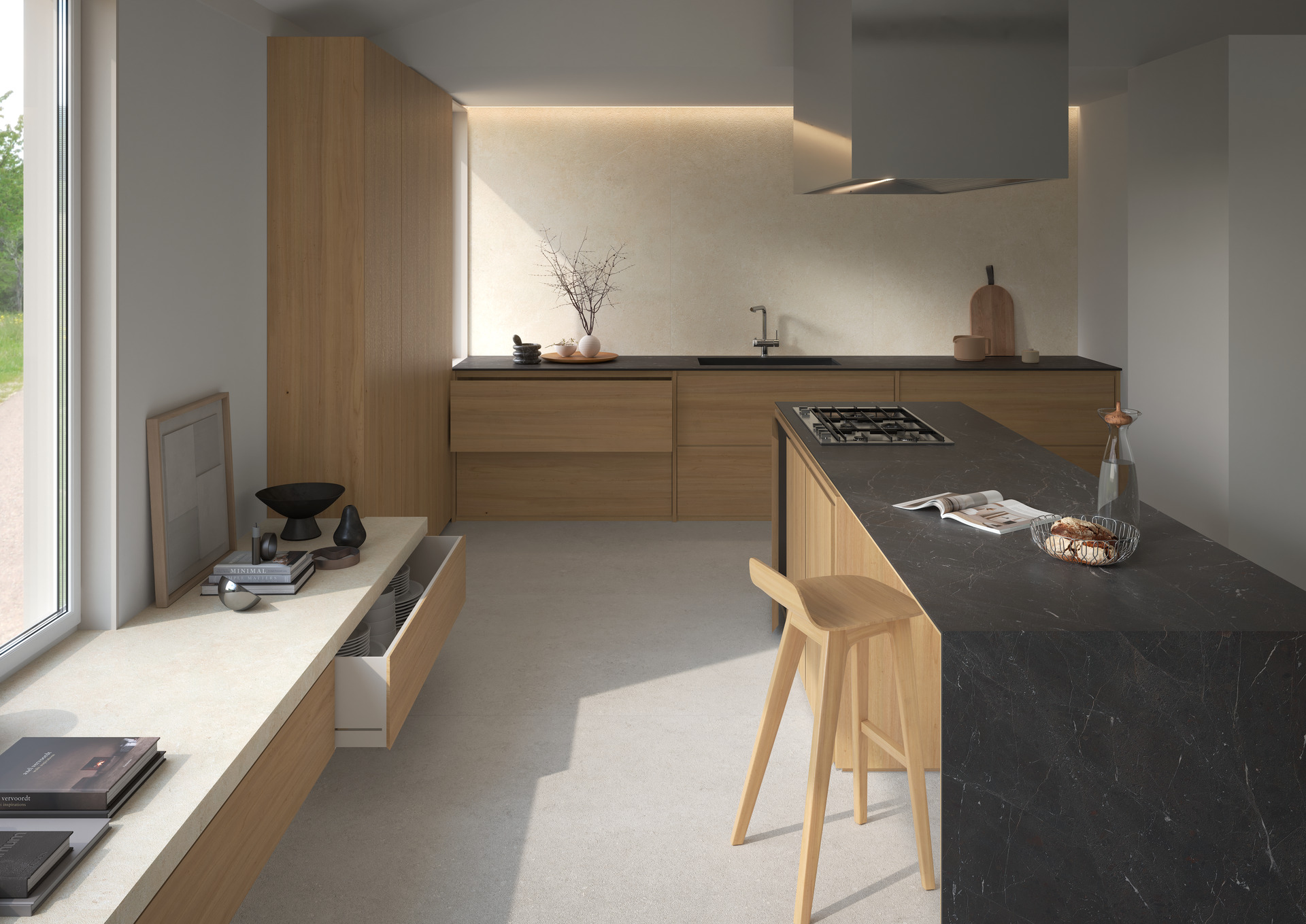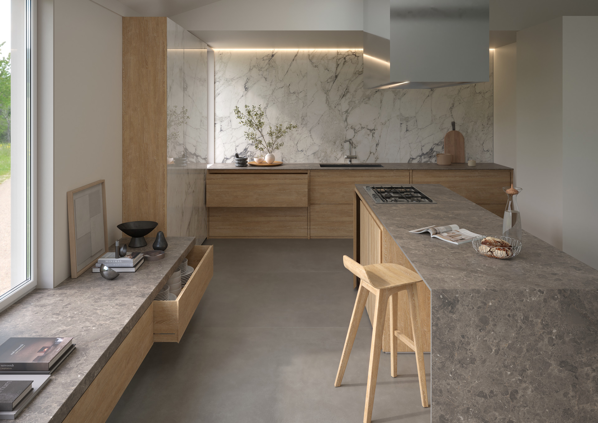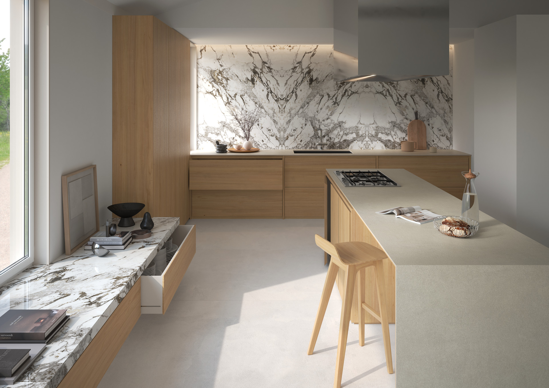 Das umfangreiche Angebot von Marazzi The Top ermöglicht einen völlig neuartigen Dialog der Strukturen zwischen den einzelnen Elementen der Inneneinrichtung und den Bereichen eines Hauses – dem Wohnbereich und der Küche. Dabei werden die Einschränkungen in Verbindung mit der Schlag- oder Fleckenfestigkeit, der Hygiene von Oberflächen in Kontakt mit Lebensmitteln überwunden.