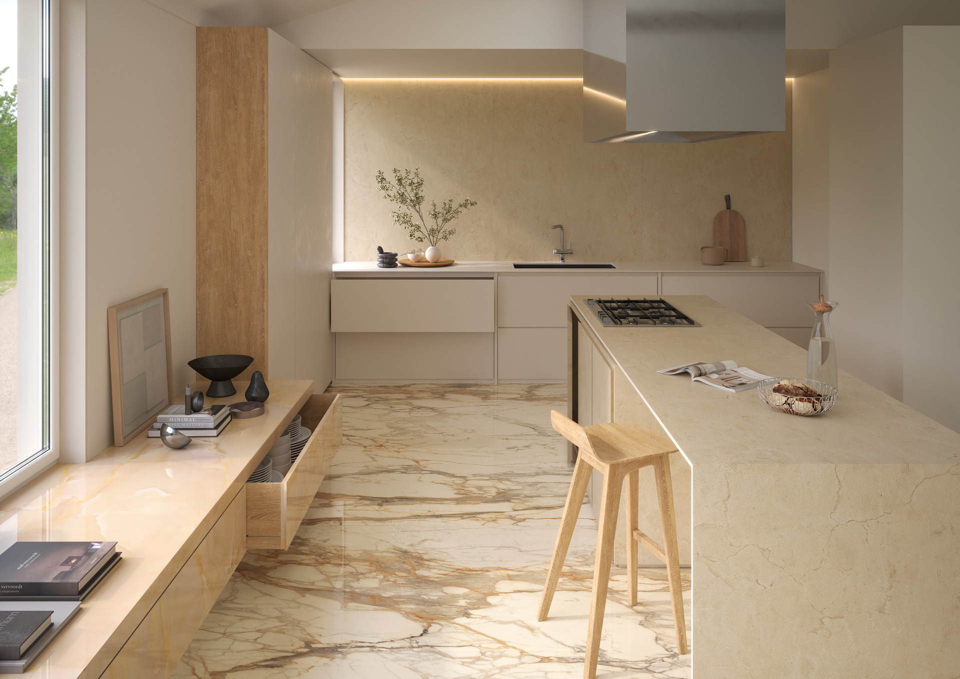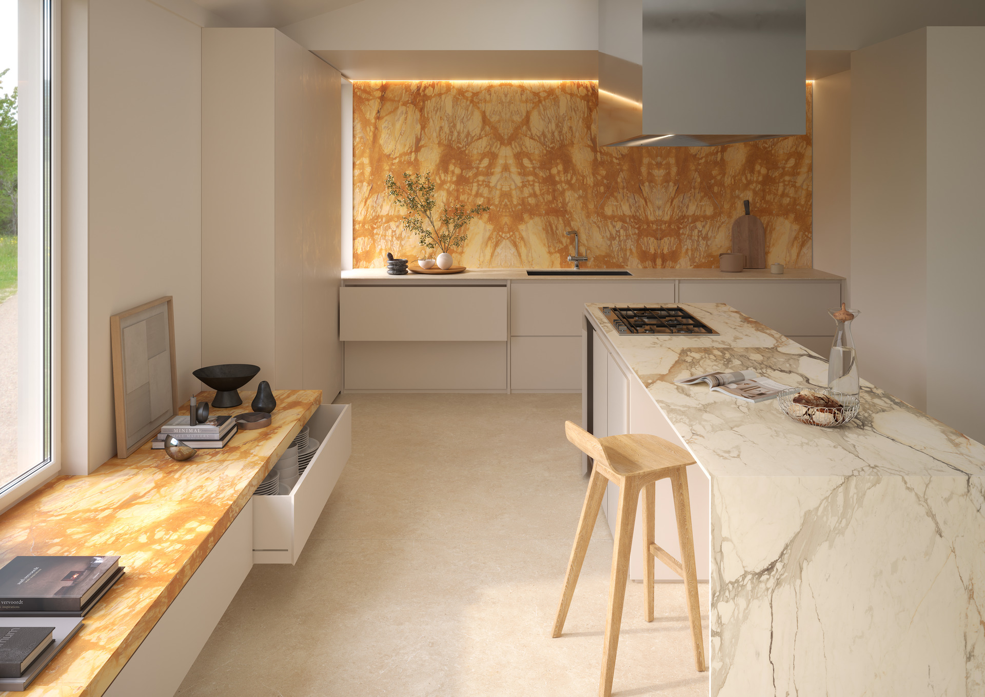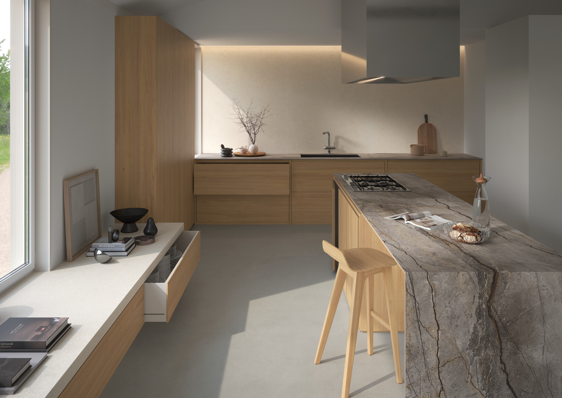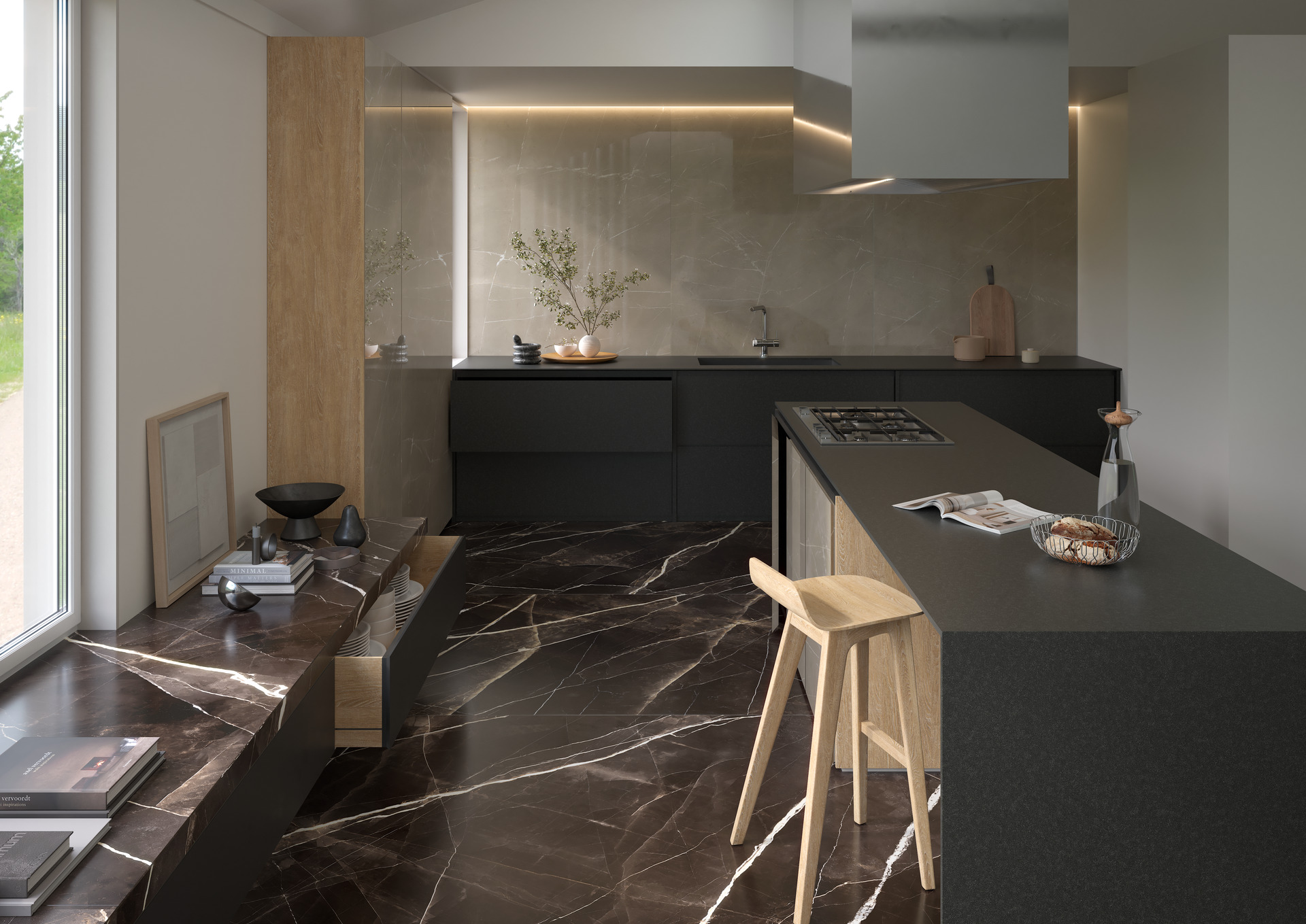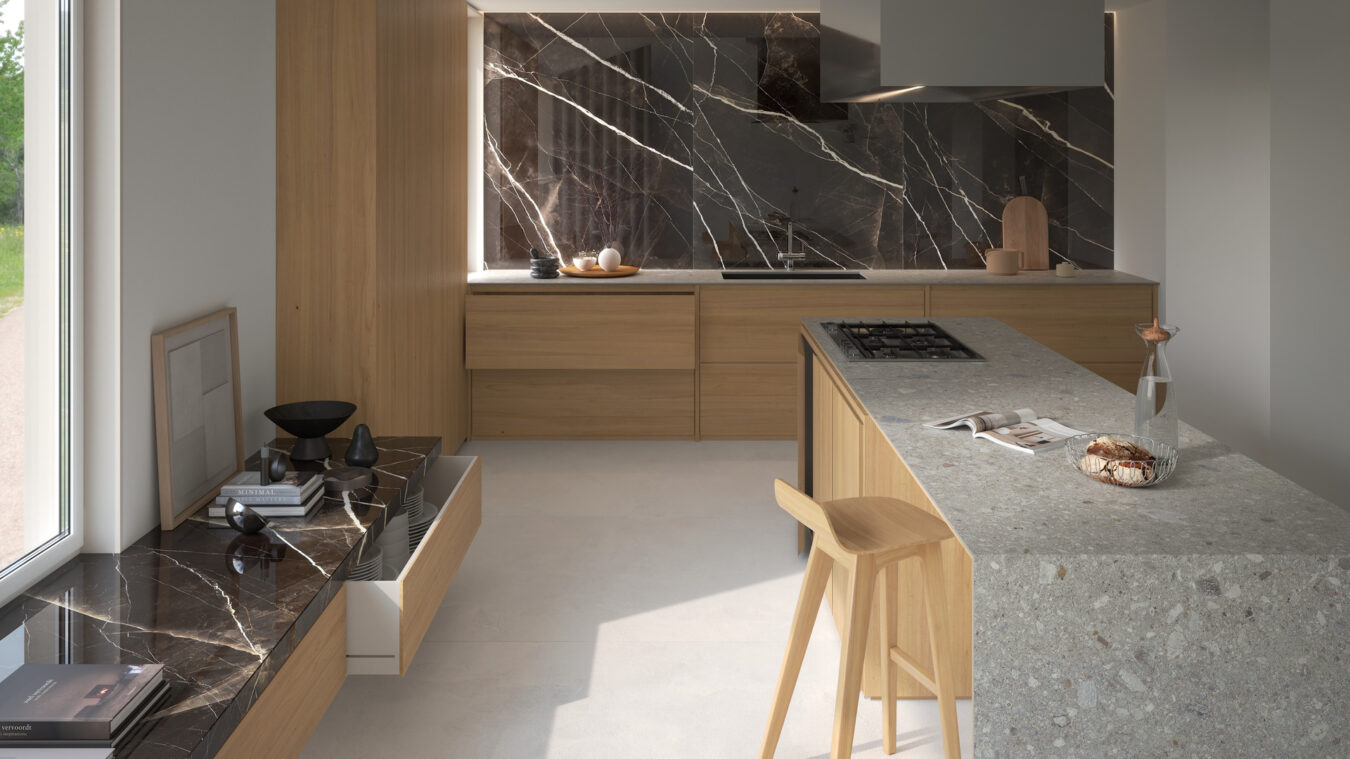 Das umfangreiche Angebot von Marazzi The Top ermöglicht einen völlig neuartigen Dialog der Strukturen zwischen den einzelnen Elementen der Inneneinrichtung und den Bereichen eines Hauses – dem Wohnbereich und der Küche. Dabei werden die Einschränkungen in Verbindung mit der Schlag- oder Fleckenfestigkeit, der Hygiene von Oberflächen in Kontakt mit Lebensmitteln überwunden.