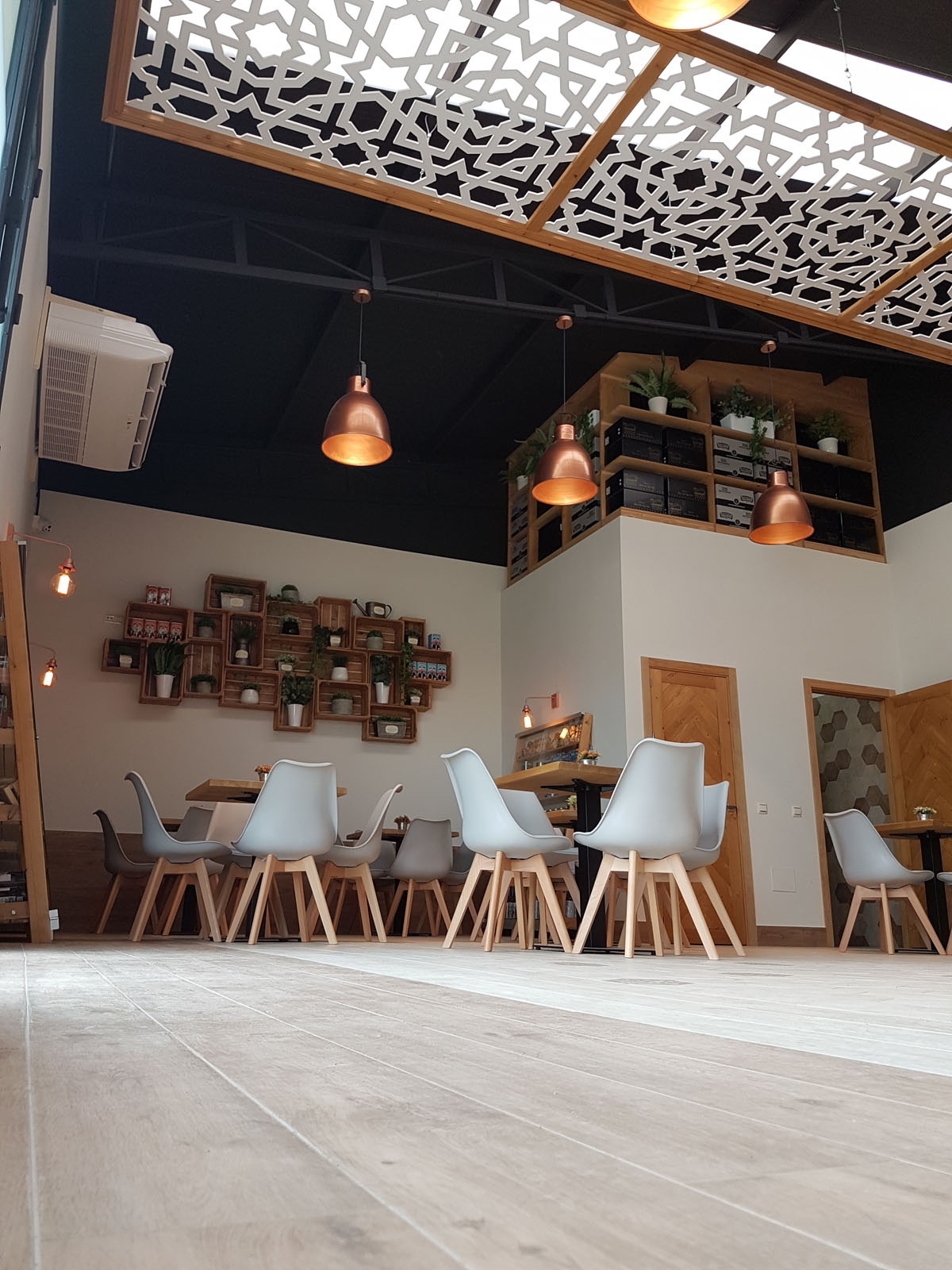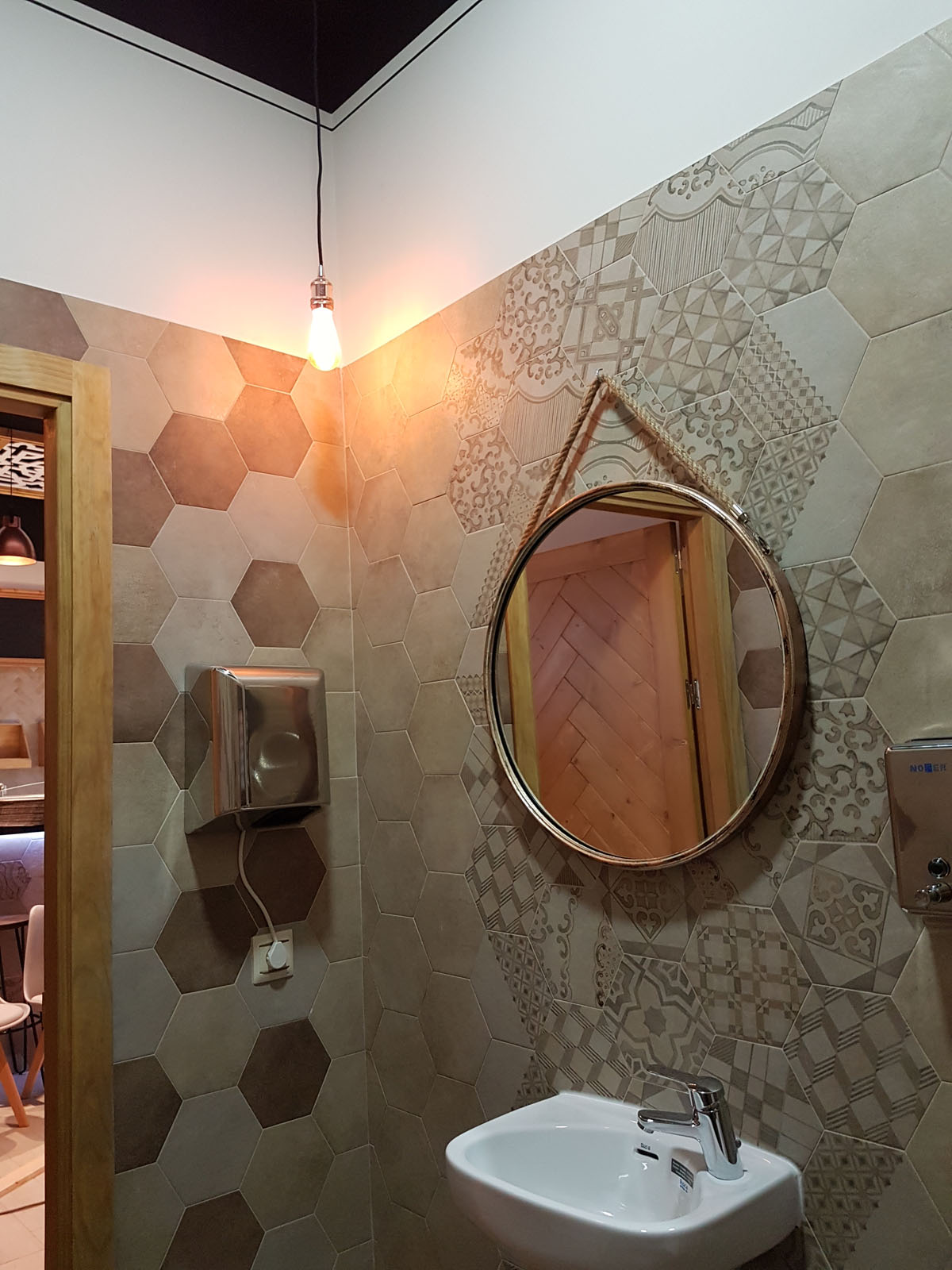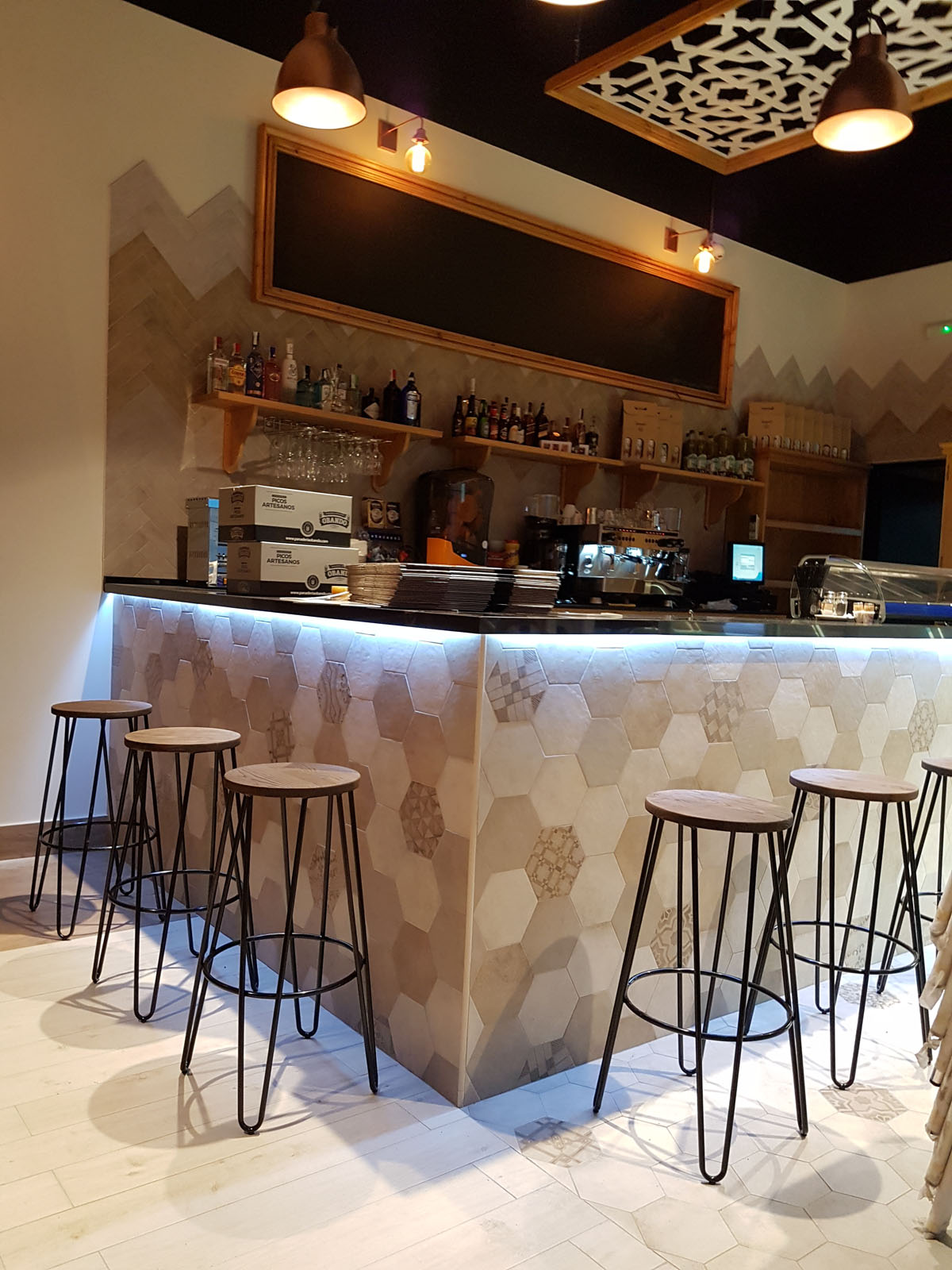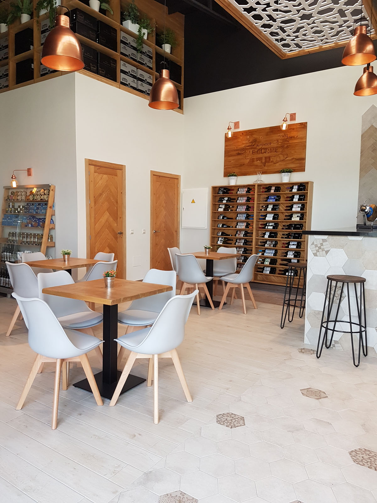 Das Büro Antonio Ternero Interiorista verlieh der Bäckerei Auténtico Le Gurmé in Utrera, Sevilla, die zugleich Bistro ist, einen Stil, der die andalusische Dekortradition zeitgemäß interpretiert. Die Innenausbau in Weiß und die Einrichtungen aus Holz und Metall stehen in perfektem Einklang mit dem Feinsteinzeug in Cotto-Beton-Optik Clays und dem Feinsteinzeug in Holzoptik Treverkway. Das Feinsteinzeug Clays, das im Sechskant- und Ziegelformat zur Bekleidung des Barbereichs (Wand und Tresen) und des Toilettenbereichs gewählt wurde, steht in einem gelungenen Dialog zum Feinsteinzeug in Holzoptik Treverkway, das ebenfalls sowohl am Boden als auch an der Wand verwendet wurde. Die zwei Treverkway Varianten Rovere und Acero verleihen dem Ambiente eine natürliche, warme Ausstrahlung und bilden ein interessantes Farbduo.