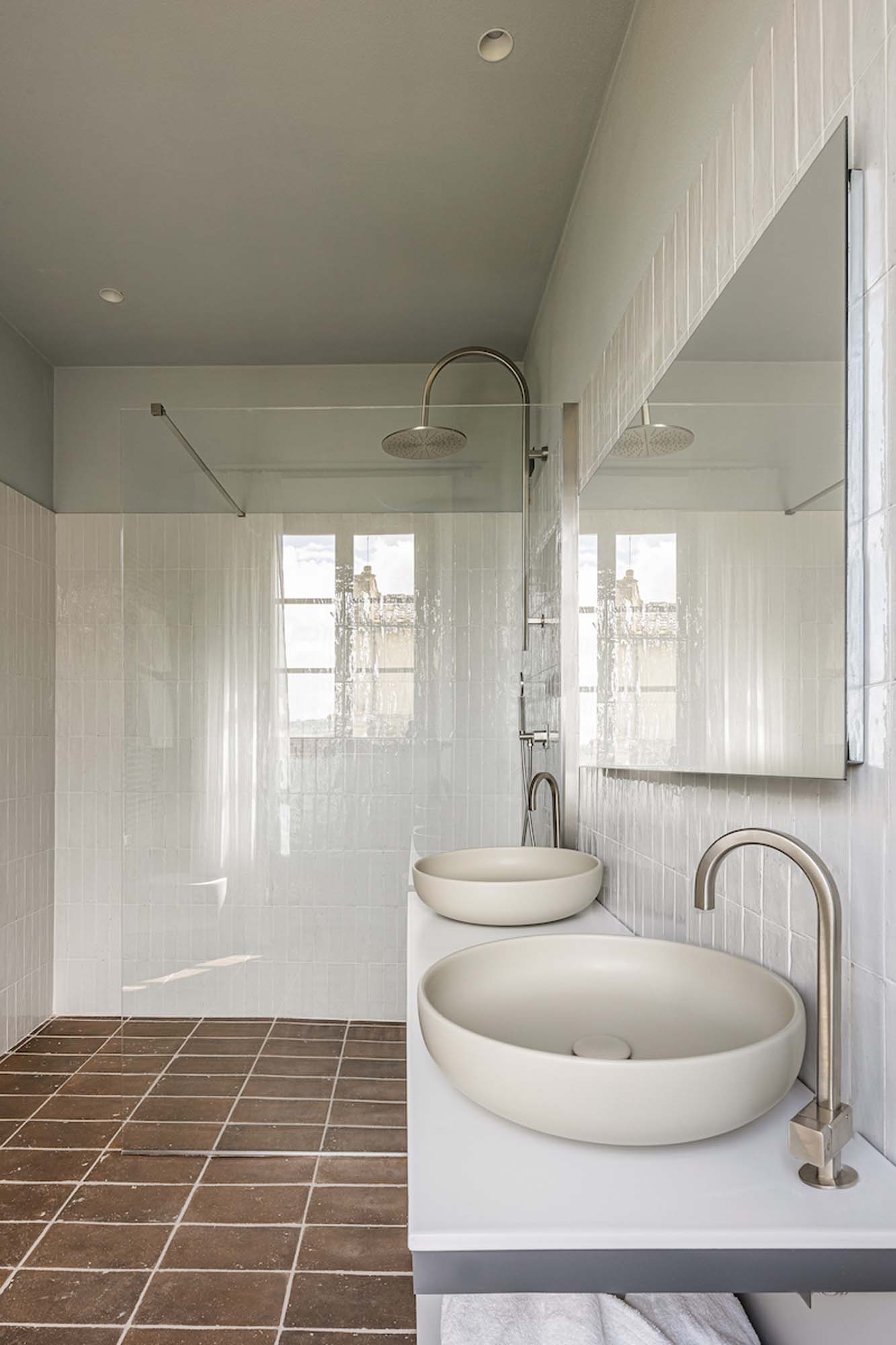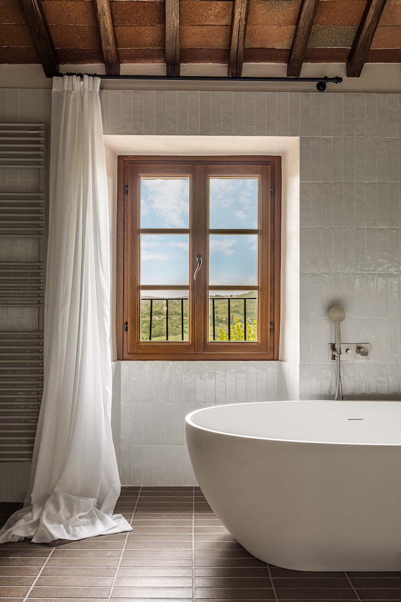 Diverse Produkte und Materialien bringen die Authentizität und Eleganz des Boutique-Hotels Pieve Aldina zur Geltung. Darunter insbesondere das Feinsteinzeug im Ziegelsteinformat Crogiolo Lume, das den Charme handgefertigter Fliesen verströmt. Es wurde in der Farbe White für die Wandverkleidung im Bad gewählt und zeugt von der Liebe zum Detail und der zeitlosen Eleganz, die das gesamte Projekt durchdringen. Die stark glänzenden Fliesen Lume passen ausgezeichnet zu den originalen Cotto-Böden des Anwesens: ein gelungenes Beispiel für die Verbindung von Tradition und Moderne.