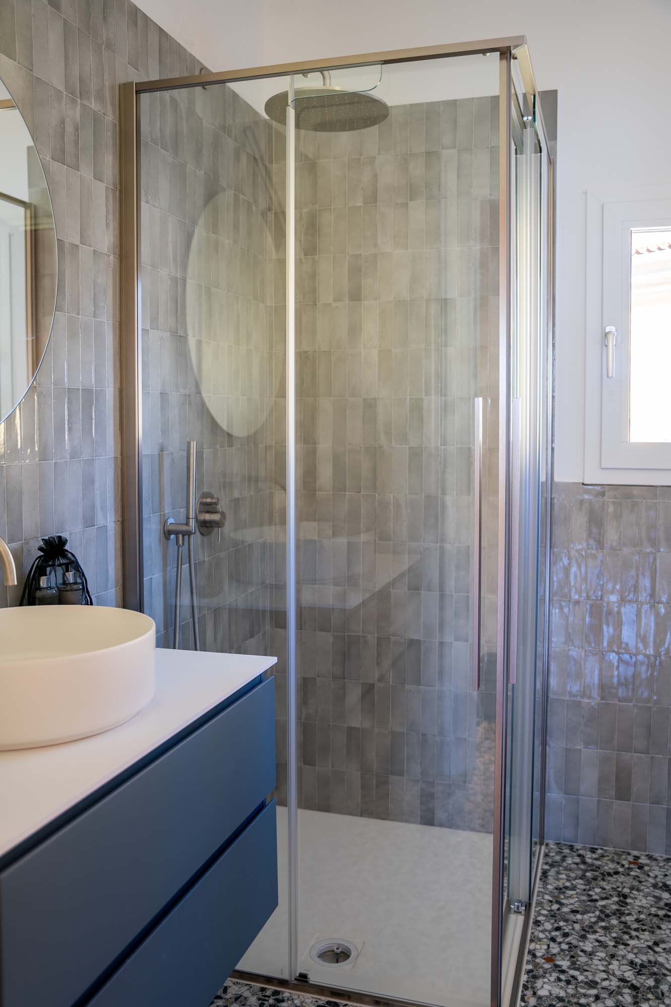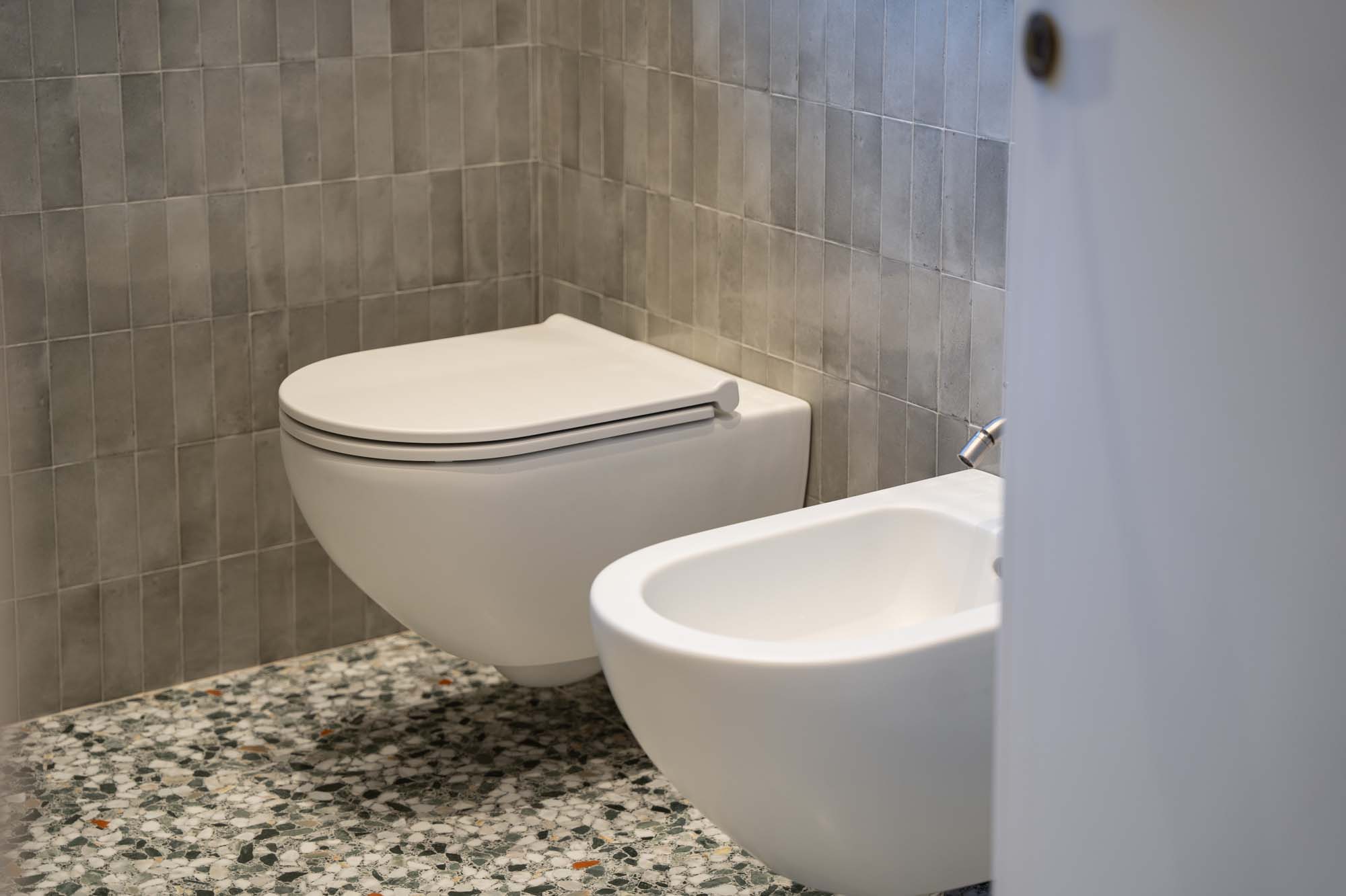 Für den zusätzlichen Touch sorgt der Bodenbelag aus dem Feinsteinzeug Grande Marble Look Ghiara Minuta Mix, das von venezianischen Terrazzoböden inspiriert ist und mit seiner unregelmäßigen Textur, die an die zeitlose Eleganz historischer Paläste anlehnt, dem Raum eine charakterstarke, individuelle Note hinzufügt.
