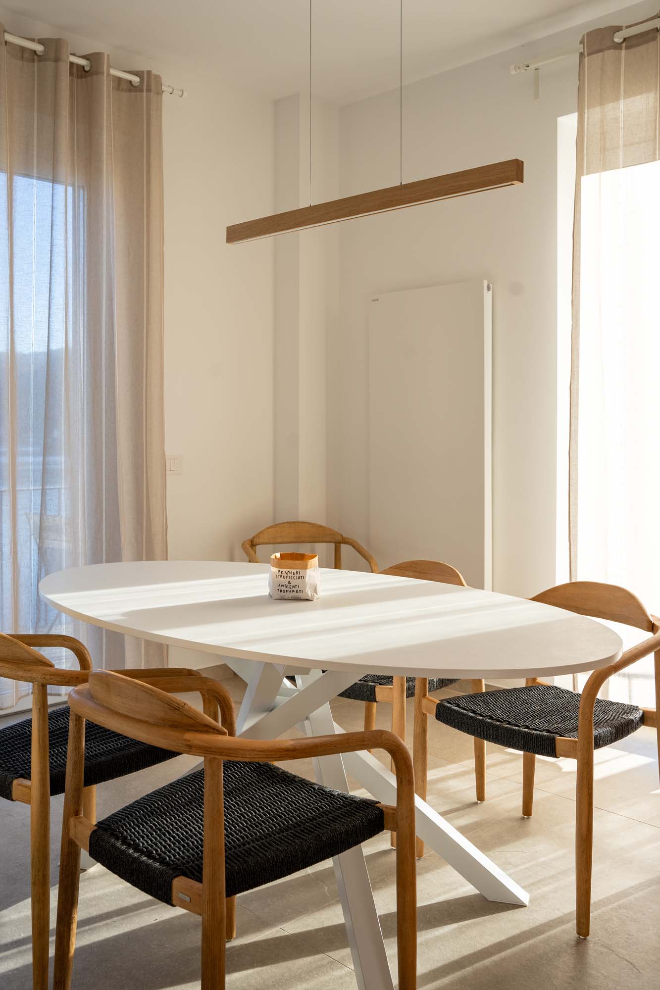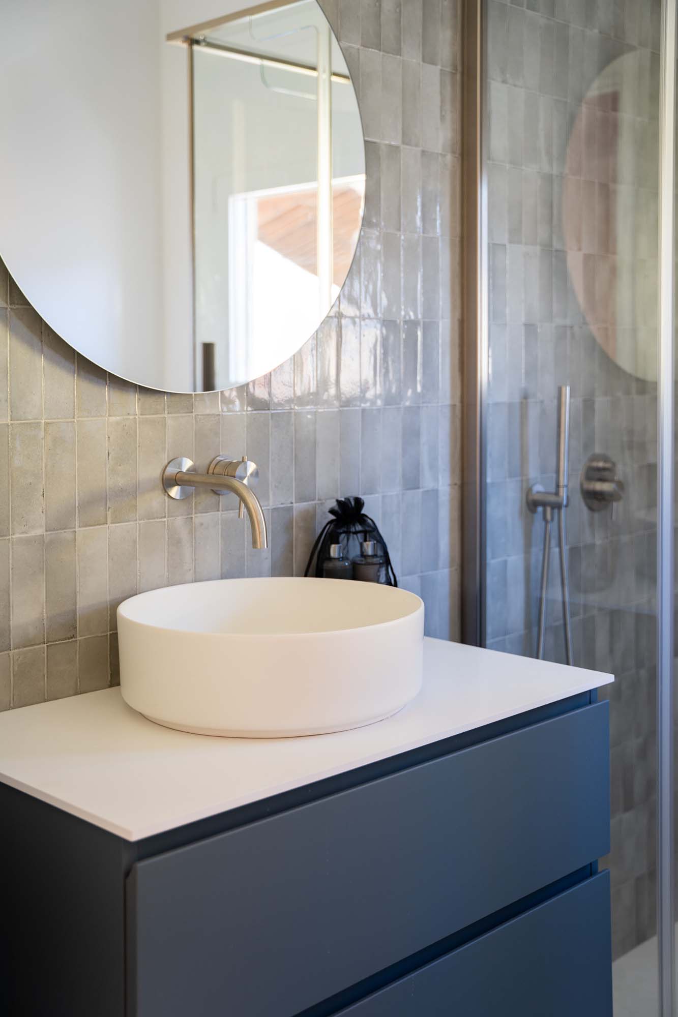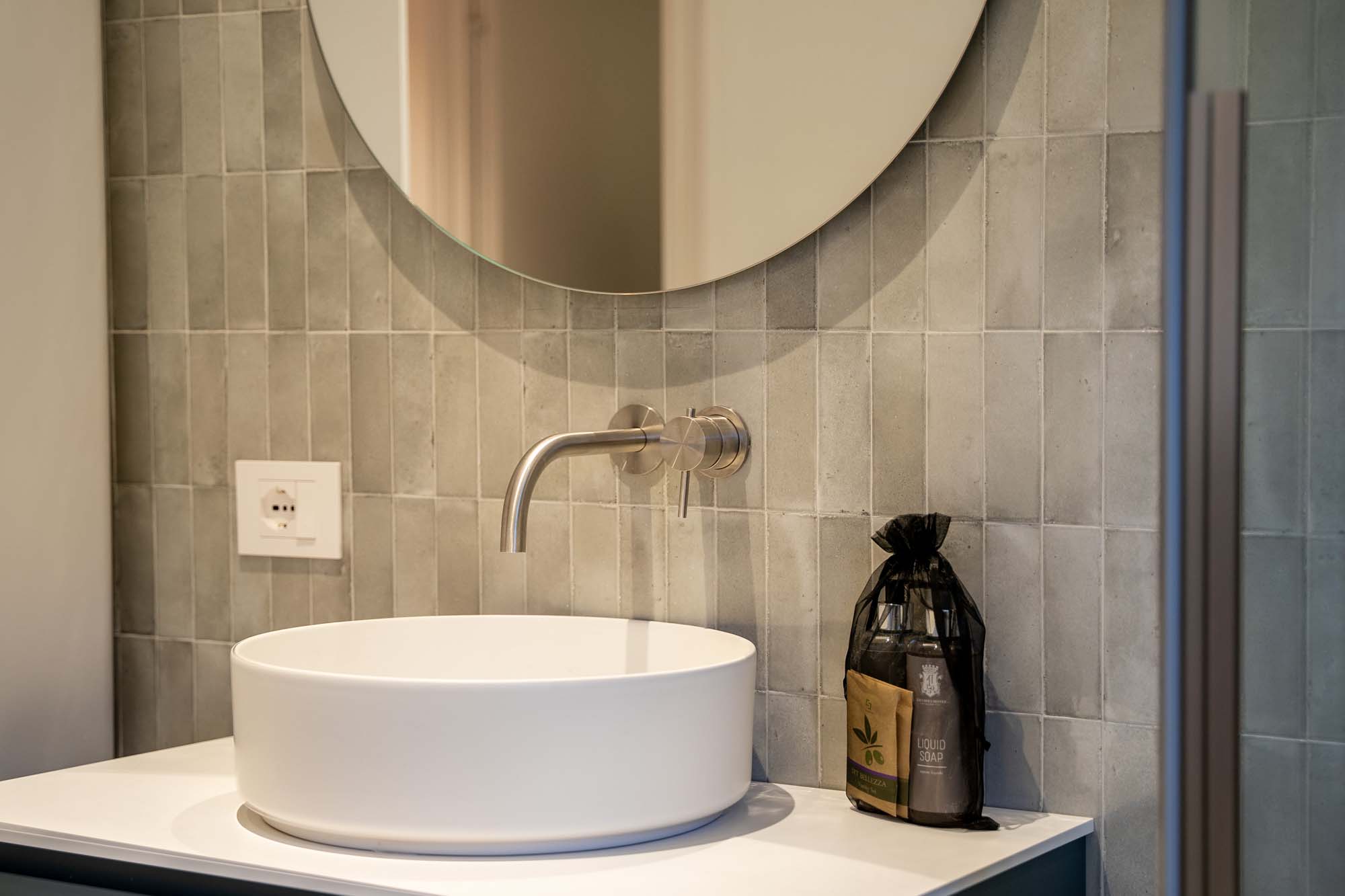 Im Bad sind hingegen die Farben- und Lichtspiele des Lago Maggiore tonangebend. An den Wänden erinnern die glänzenden unregelmäßigen Oberflächen der Fliesen im Ziegelformat aus der Kollektion Crogiolo Rice an seine Kräuselungen und Wellenspiele. Sie erzeugen eine entspannte, ätherische Atmosphäre, die der Flucht aus dem Alltag perfekt Vorschub leistet. Minimalistische Neonleuchten strahlen ein gedämpftes Licht aus, das die Spiegelungen der Fliesen betont und das Gefühl von Ruhe und Entspannung noch verstärkt.