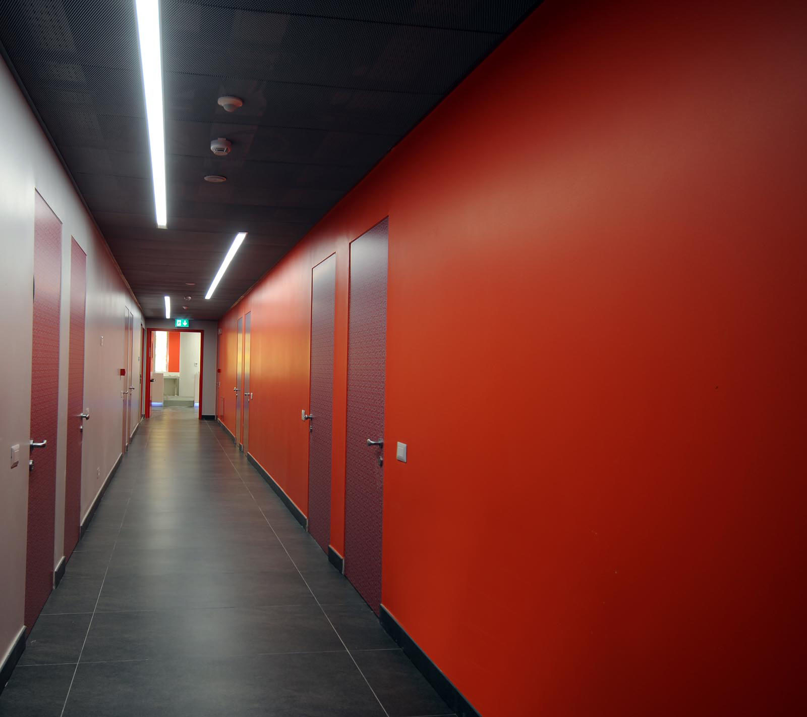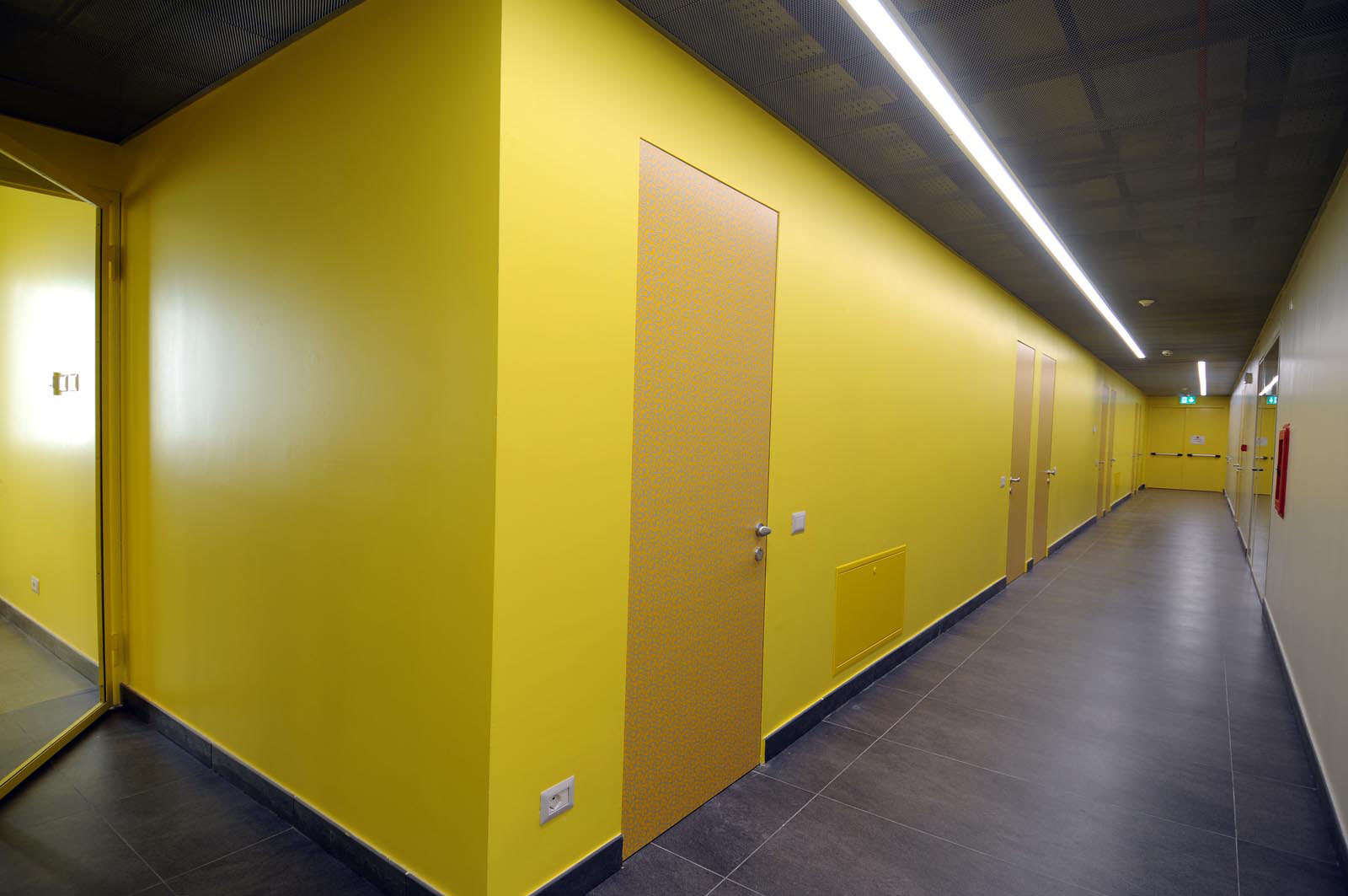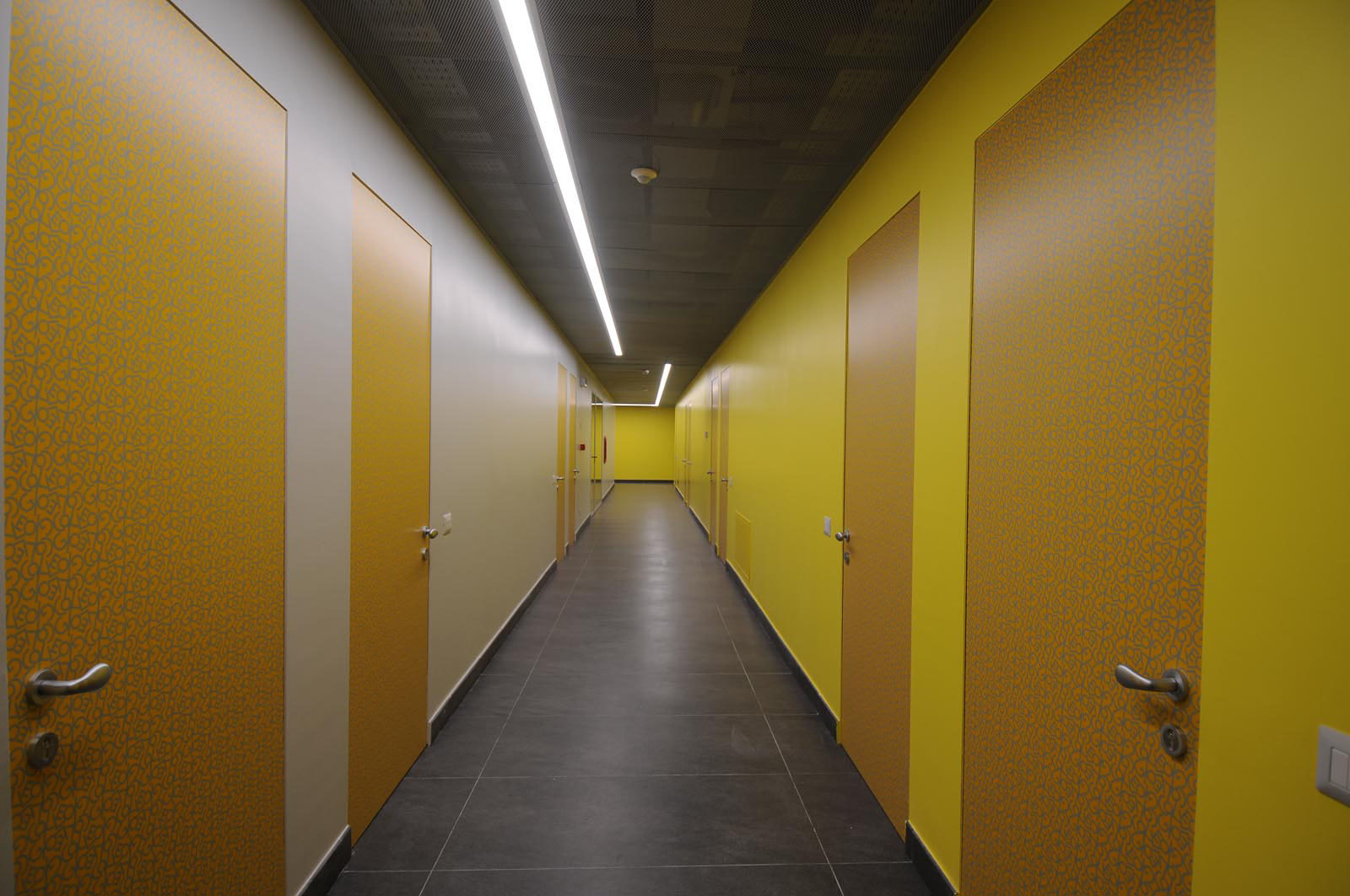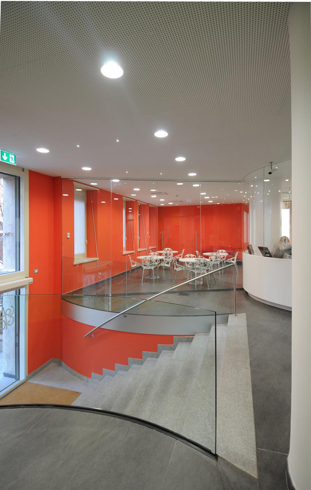 Die wichtigsten Gestaltungselemente des Projektes sind Farbe und Transparenz: Die Wände sind bis zur vollen Höhe aus Glas und jedes Zimmer hat eine andere Farbe. Drei verschiedene Feinsteinzeugkollektionen von Marazzi dienen als verbindendes Element für die unterschiedlichen Ambiente: die beiden Steinoptik-Kollektionen Stonehenge und Soho - letztere erhielt 2010 die ehrenvolle Erwähnung bei der Verleihung des Compasso d‘Oro des italienischen Fachverbands für Industriedesign ADI - und die Holzoptik-Kollektion Treverk. Die in der Farbnuance Cappuccino und im Format 30x120 cm ausgewählte Kollektion Treverk knüpft an die dunkleren Farbtöne der beiden Steinoptik-Kollektionen Soho Antracite 60x120 cm und Stonehenge Black 30x60 cm an, mit denen es in allen Räumen des Wohnheims einen harmonischen Einklang bildet.