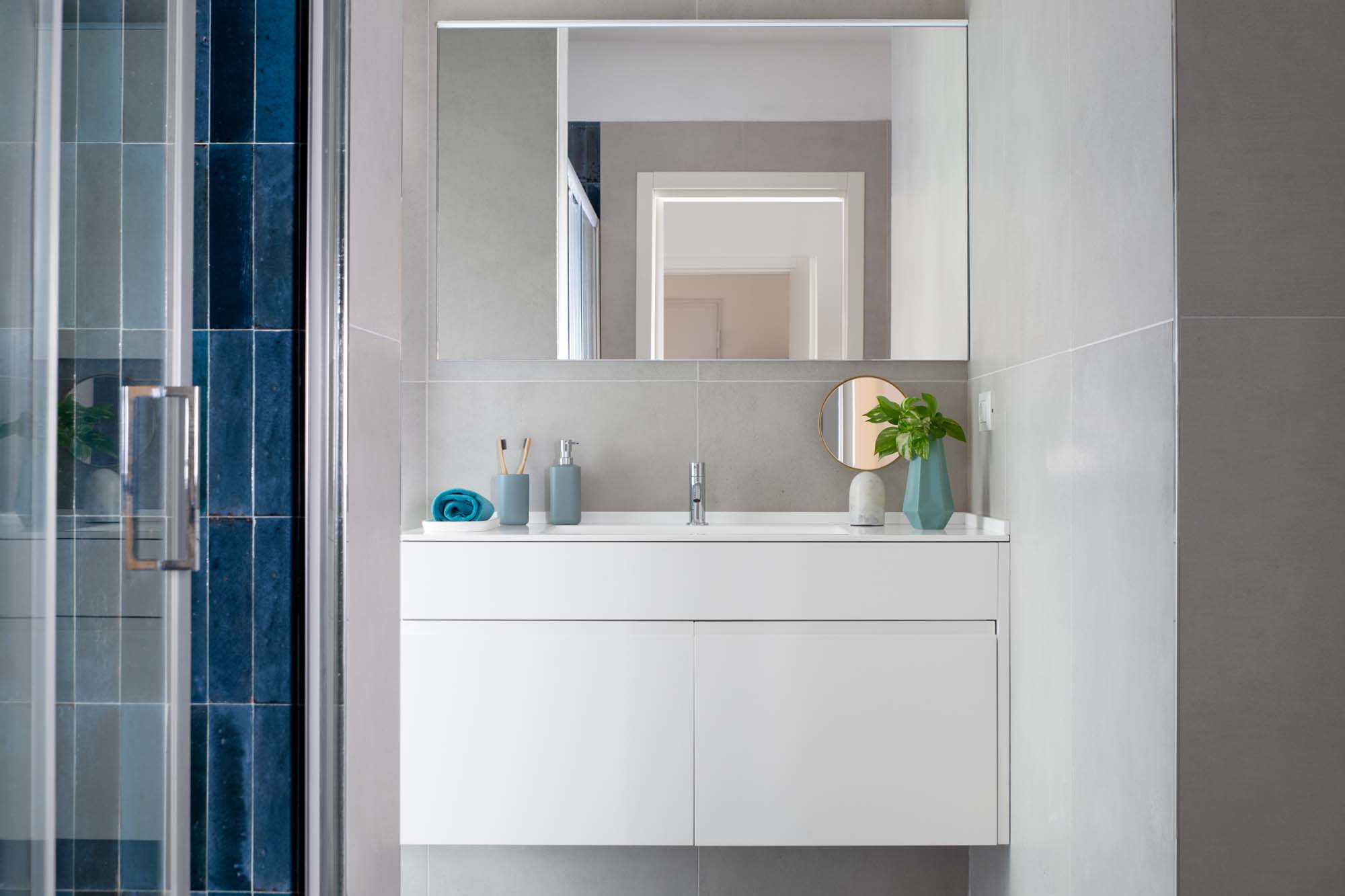 Das Hauptbadezimmer mit Nischendusche und Schiebetüren wurde mit Fliesen der Kollektion Crogiolo Lume im rechteckigen Format 6x24 cm in der Farbe Blau verkleidet.