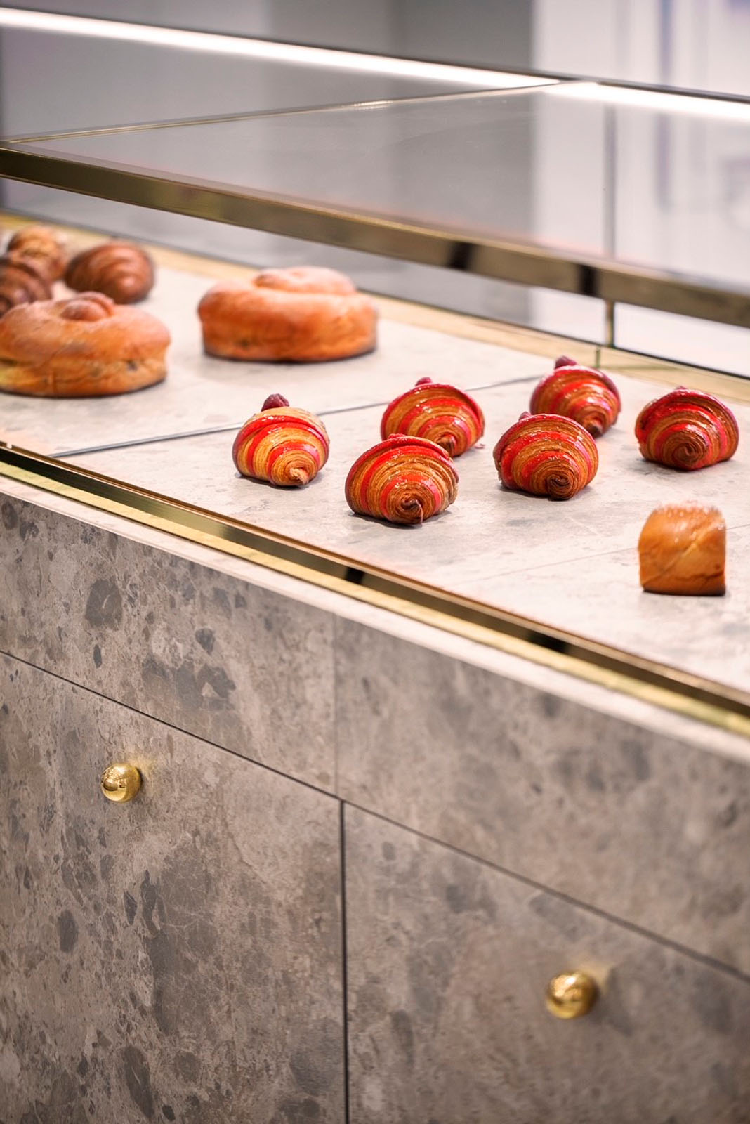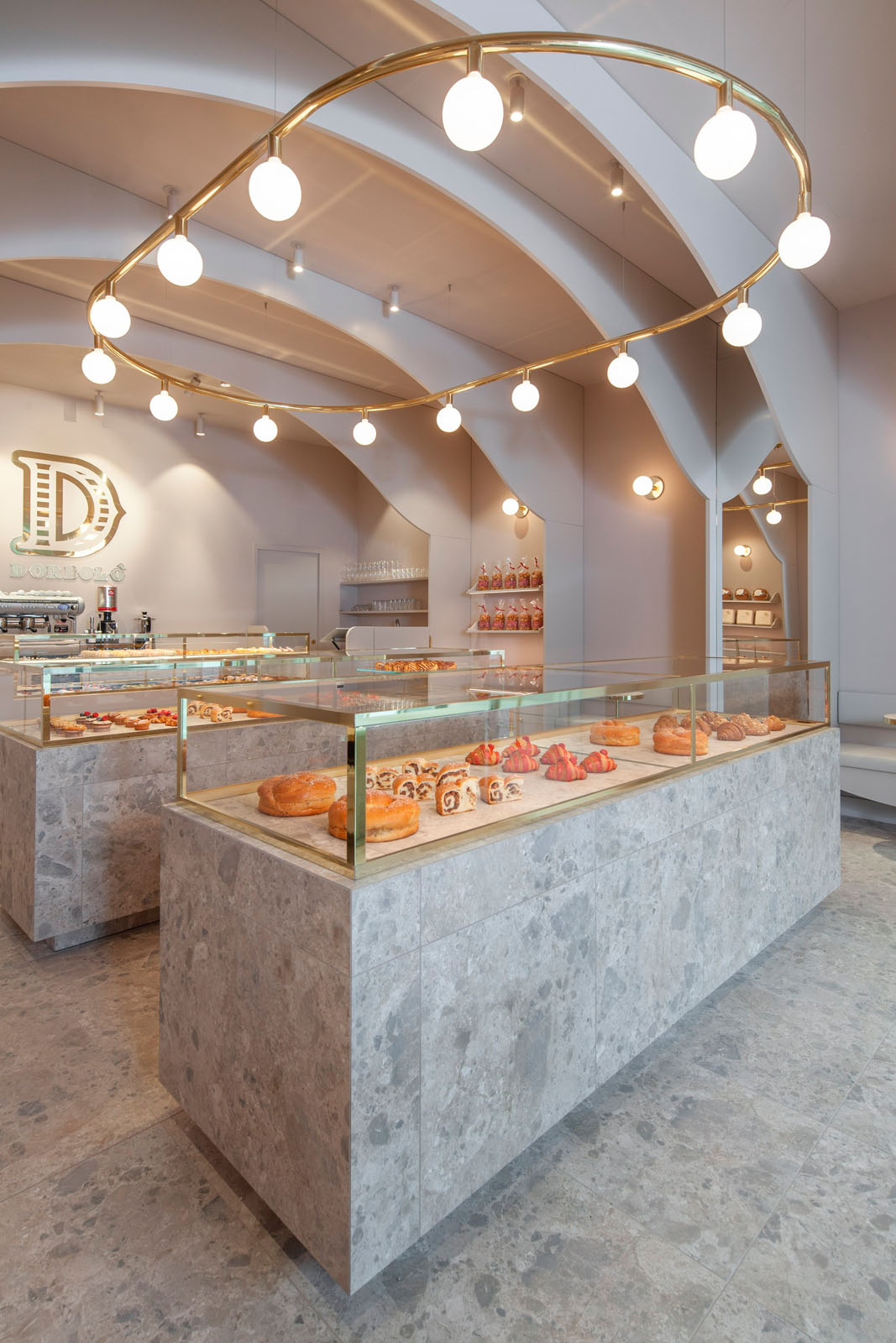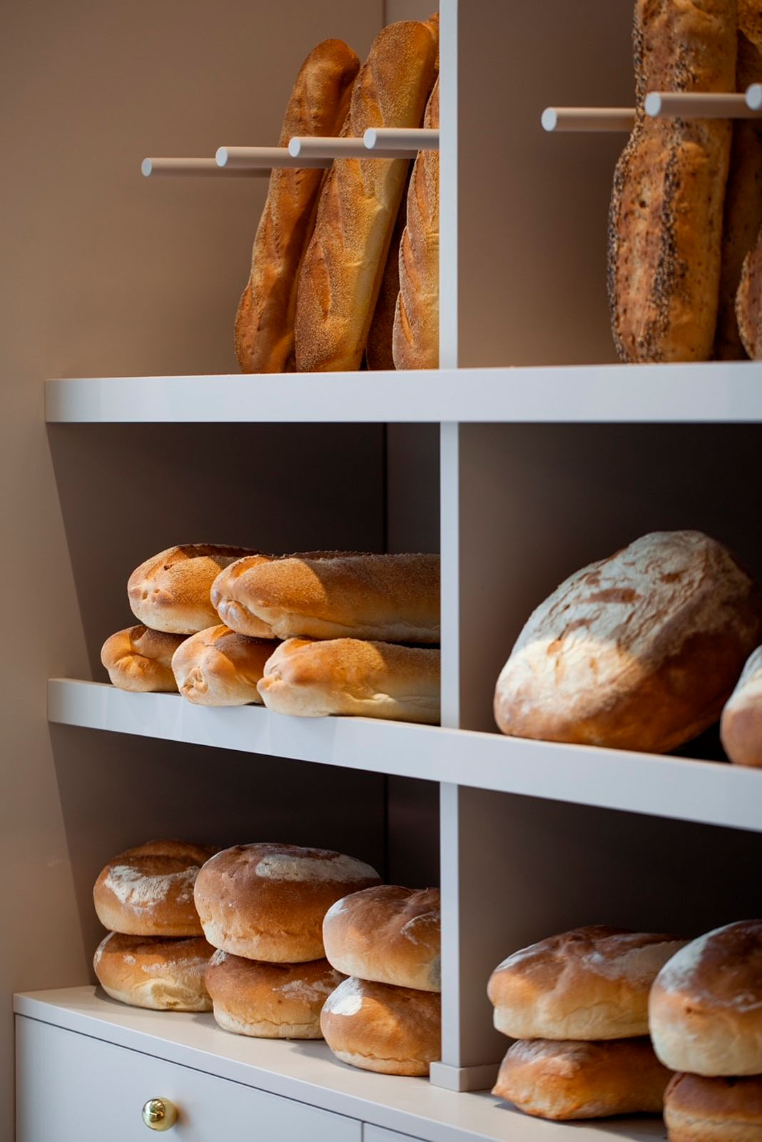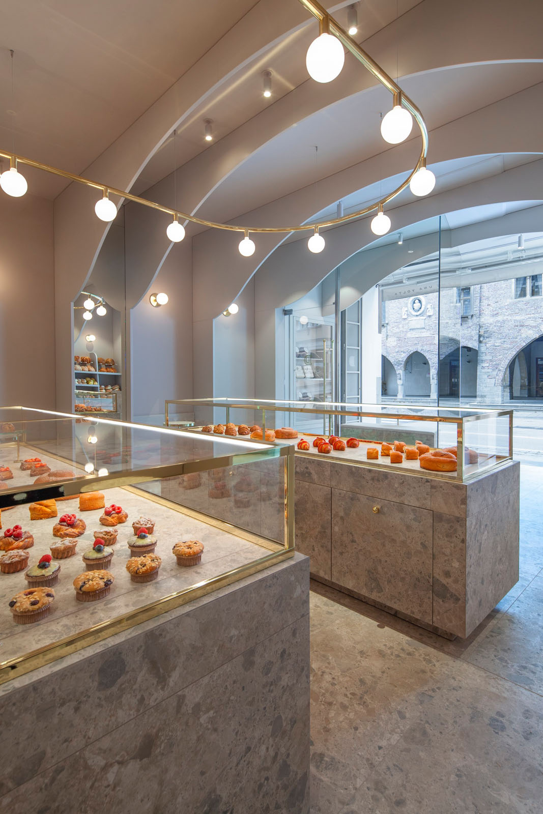 Zur Attraktivität der Szenerie tragen auch die weiteren Elemente des Raumkonzepts bei: Die prächtige Bogenstruktur an der Decke und die daran angebrachte große Hängeleuchte aus Messing und speziell dafür gestaltetem mattem Glas lockern den Minimalismus des Gesamteindrucks und die wiederkehrenden geometrischen Linien auf. Das Backwerk in den Glastheken wird wie ein Juwelenschatz ausgestellt. „Zwischen den haselnussfarbenen Trennwänden befinden sich Warenregale, Ablagefächer und kleine, aber bequeme Sitznischen, wo die Gäste ein Stück Kuchen und einen Kaffee genießen können. Auch Brot spielt eine wichtige Rolle, für die frisch gebackenen Produkte gibt es daher einen eigenen Ausstellungsbereich am Eingang.“