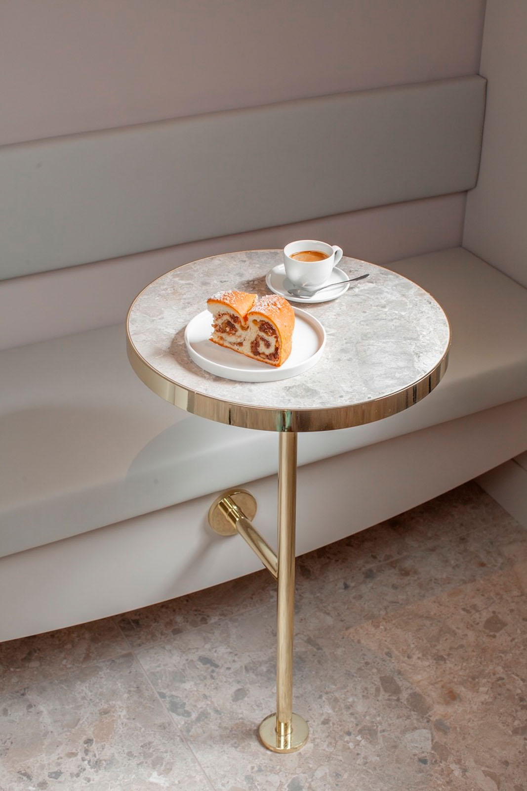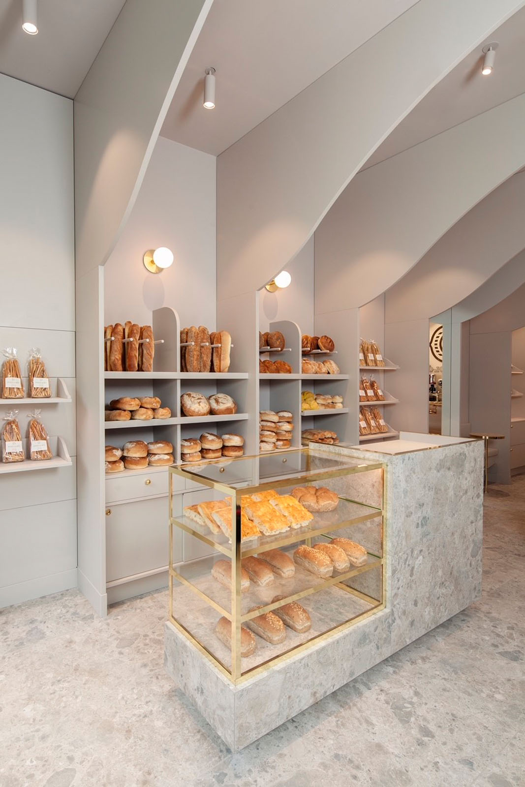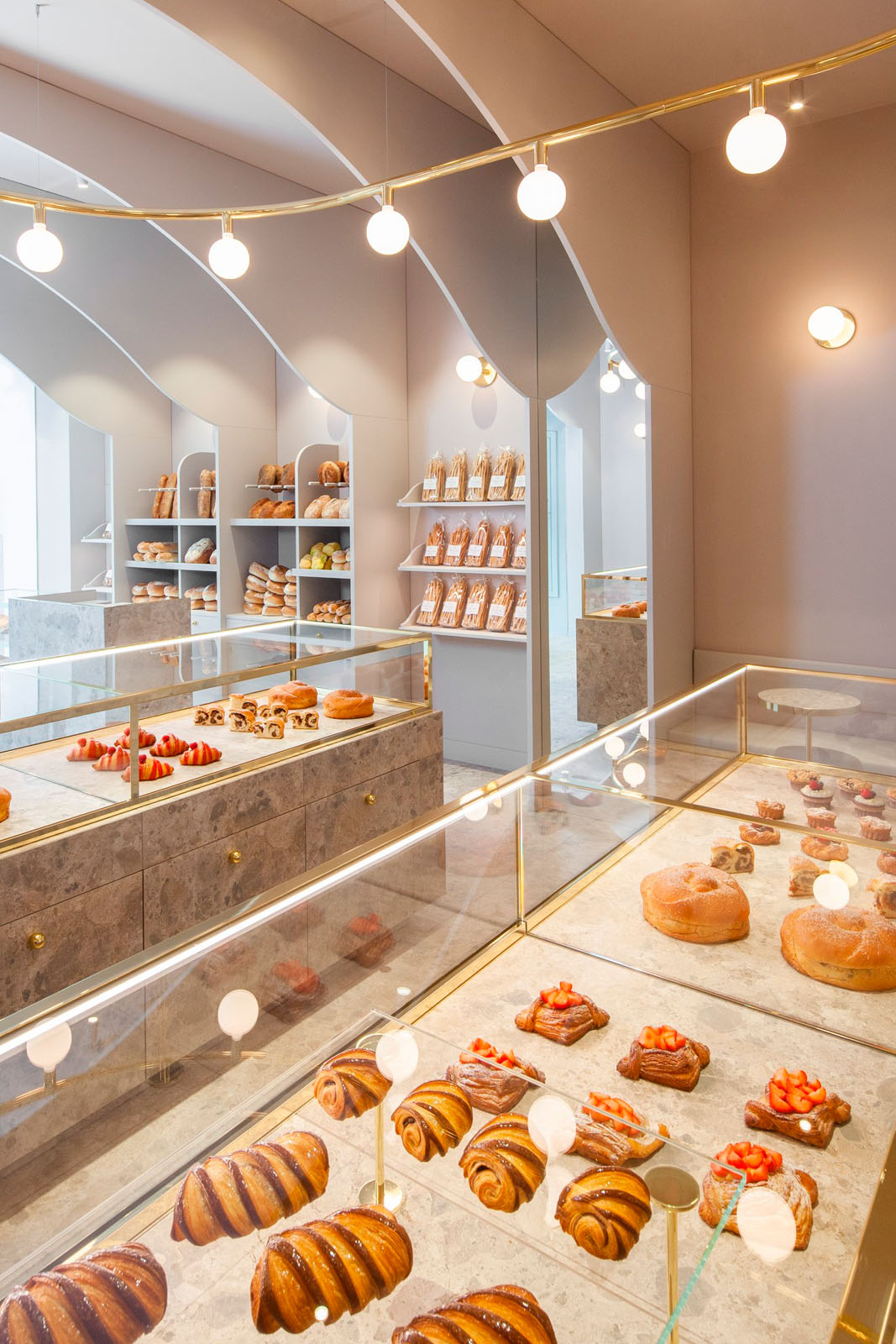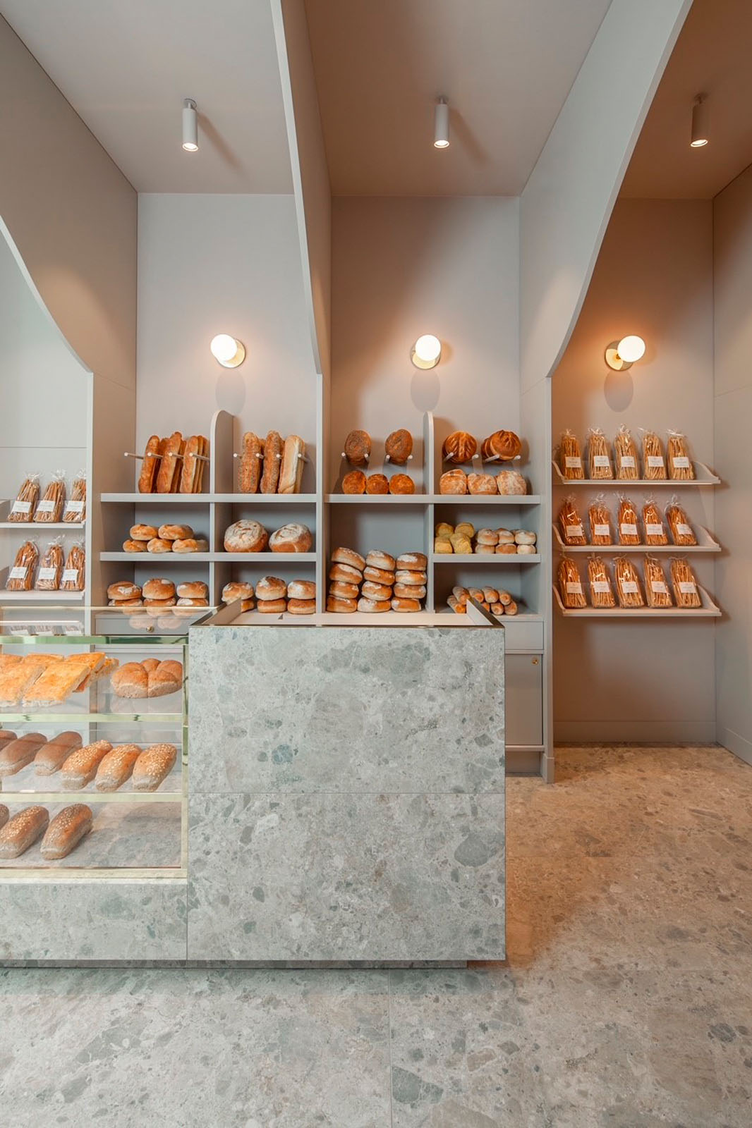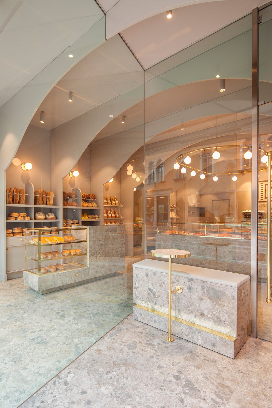 Zur Attraktivität der Szenerie tragen auch die weiteren Elemente des Raumkonzepts bei: Die prächtige Bogenstruktur an der Decke und die daran angebrachte große Hängeleuchte aus Messing und speziell dafür gestaltetem mattem Glas lockern den Minimalismus des Gesamteindrucks und die wiederkehrenden geometrischen Linien auf. Das Backwerk in den Glastheken wird wie ein Juwelenschatz ausgestellt. „Zwischen den haselnussfarbenen Trennwänden befinden sich Warenregale, Ablagefächer und kleine, aber bequeme Sitznischen, wo die Gäste ein Stück Kuchen und einen Kaffee genießen können. Auch Brot spielt eine wichtige Rolle, für die frisch gebackenen Produkte gibt es daher einen eigenen Ausstellungsbereich am Eingang.“