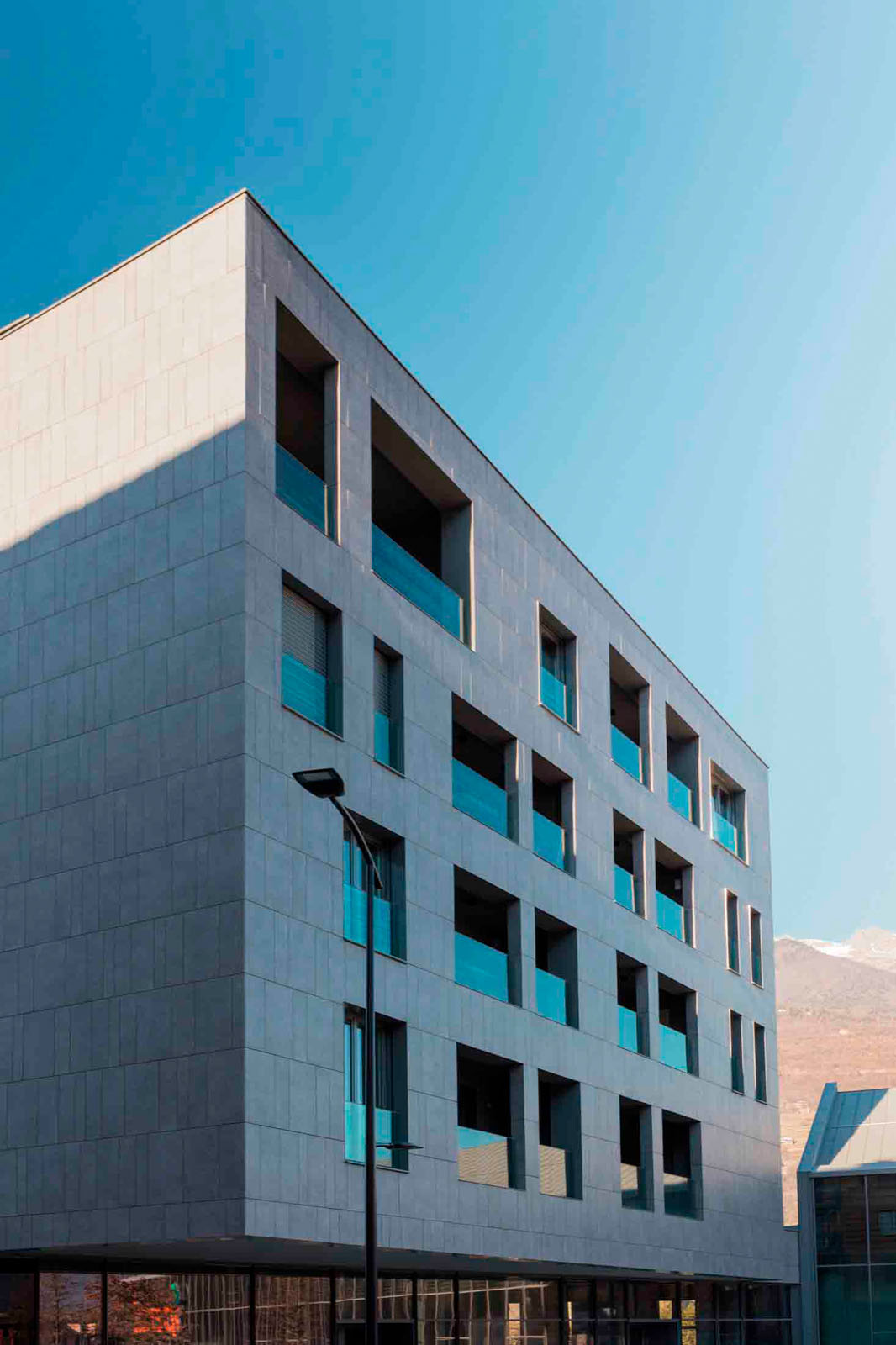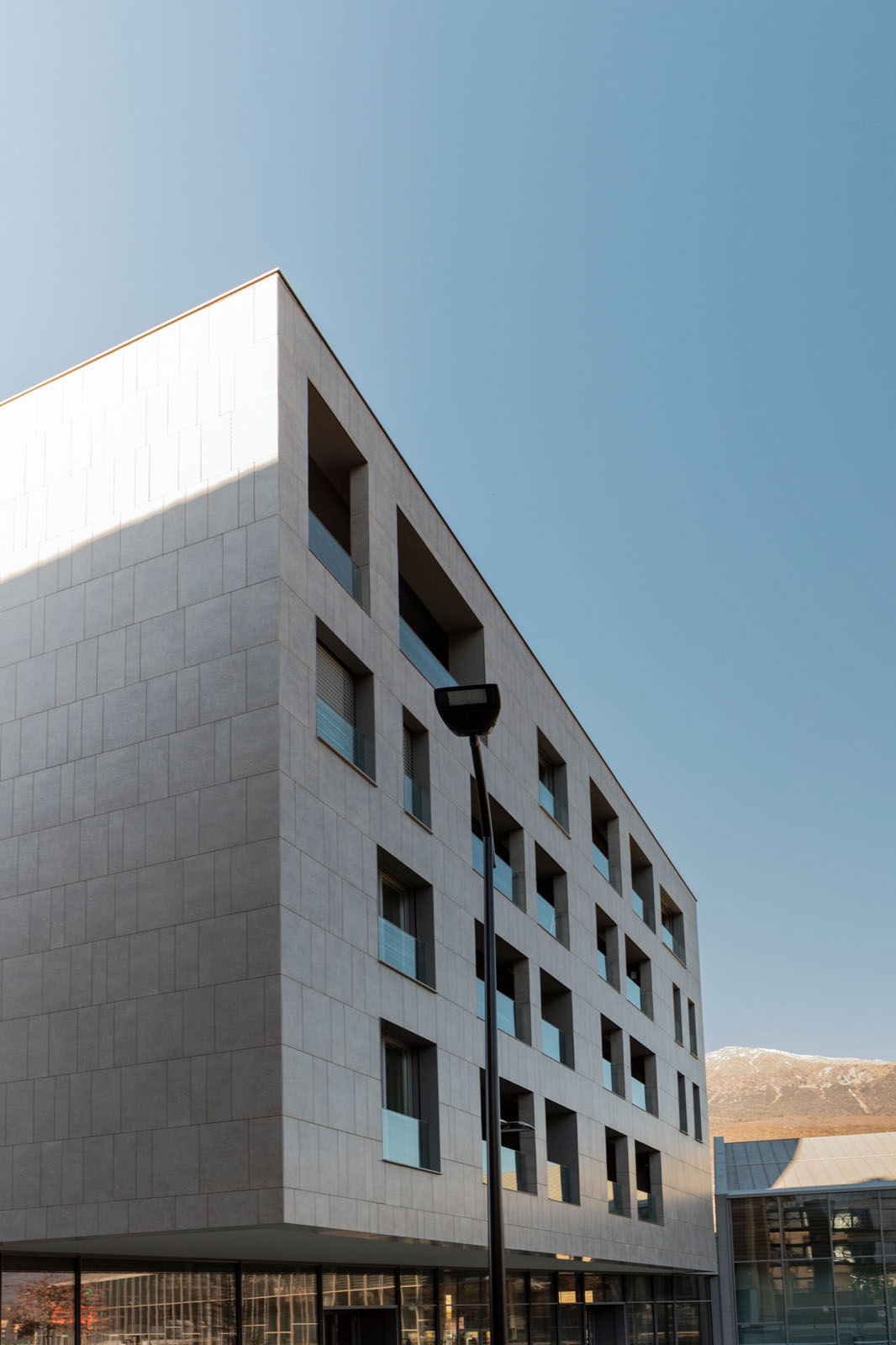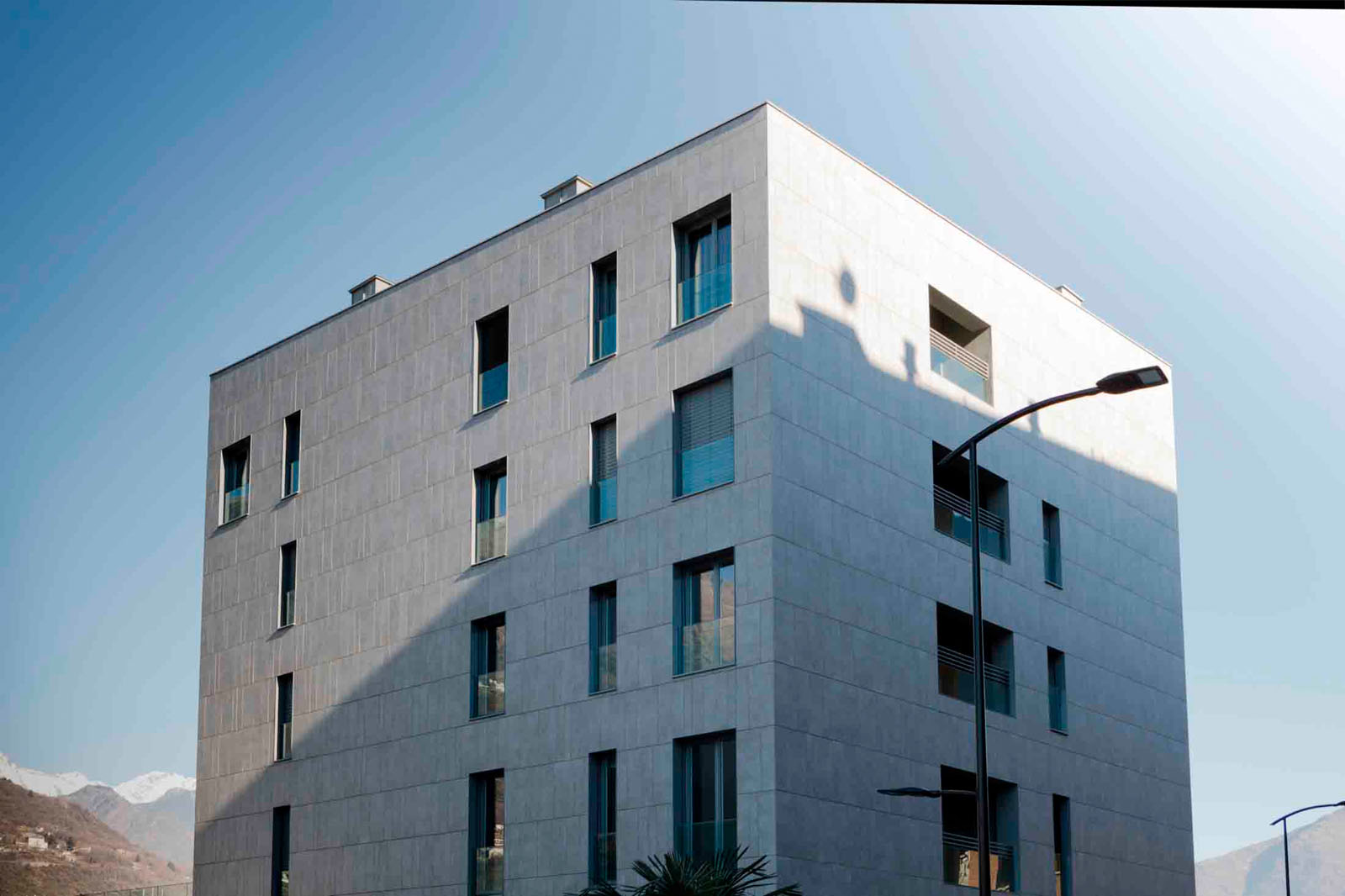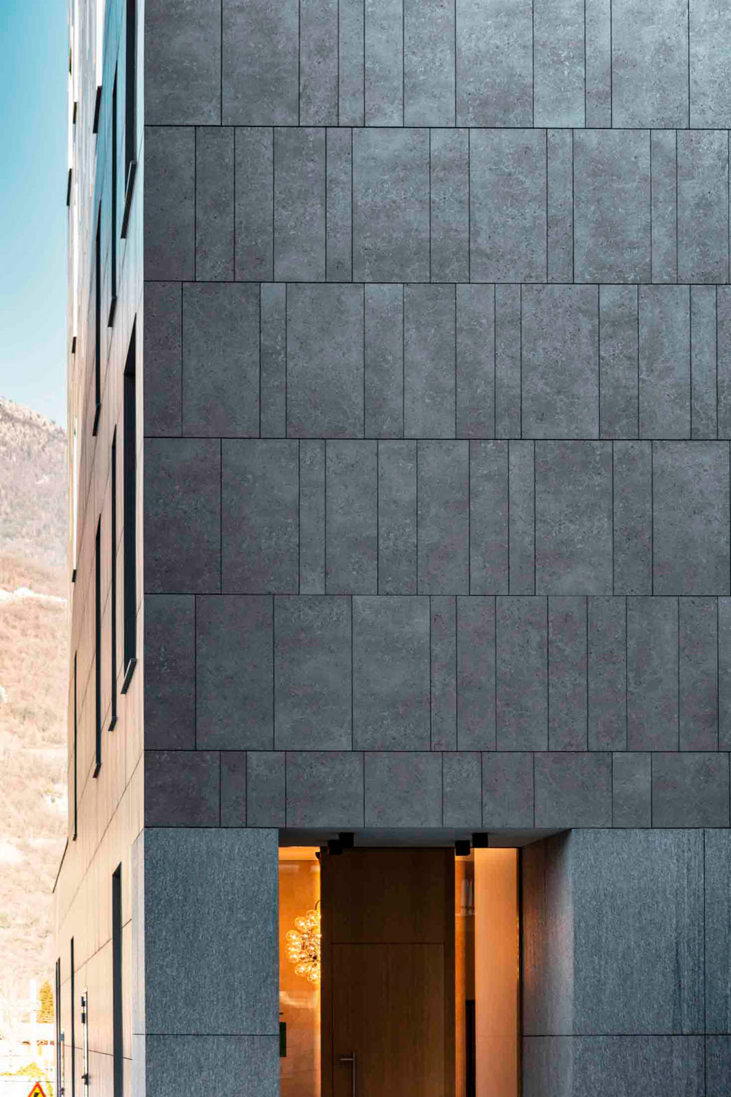 Die gezielte Maßnahme zur Umnutzung des ehemaligen Fabrikgeländes Area Martinelli in der Provinz Sondrio trägt die Handschrift des Architekturbüros Antonio Citterio Patricia Viel. Vorrangiges Ziel des Projekts zur Umnutzung des Geländes war, die städtebauliche Qualität durch Schaffung neuer Dienstleistungen und öffentlicher Räume zu verbessern. Im Fokus der Maßnahme stand u.a. das Gebäude G, ein moderner Bau mit sauberen geometrischen Formen, dessen vorgehängte hinterlüftete Fassade ganz mit dem Feinsteinzeug in Natursteinoptik Mystone Gris Fleury in mehreren Formaten (20x120 cm, 30x120 cm, 40x120 cm, 60x120 cm) bekleidet wurde.