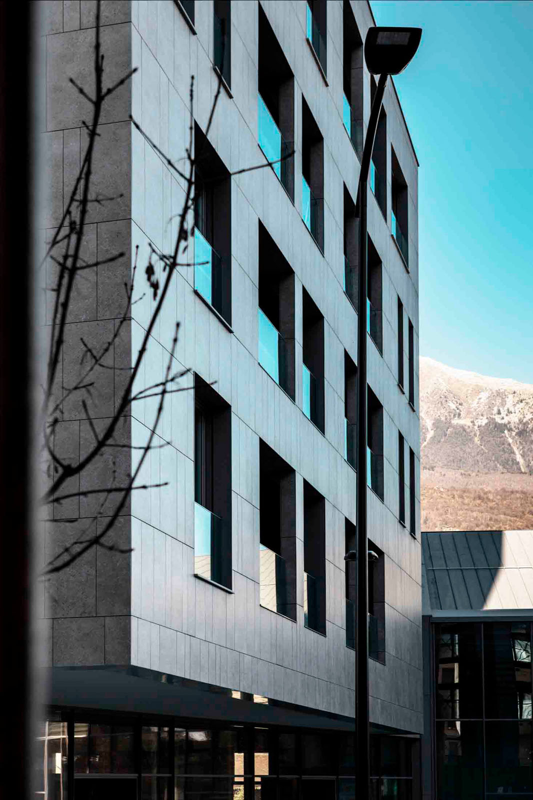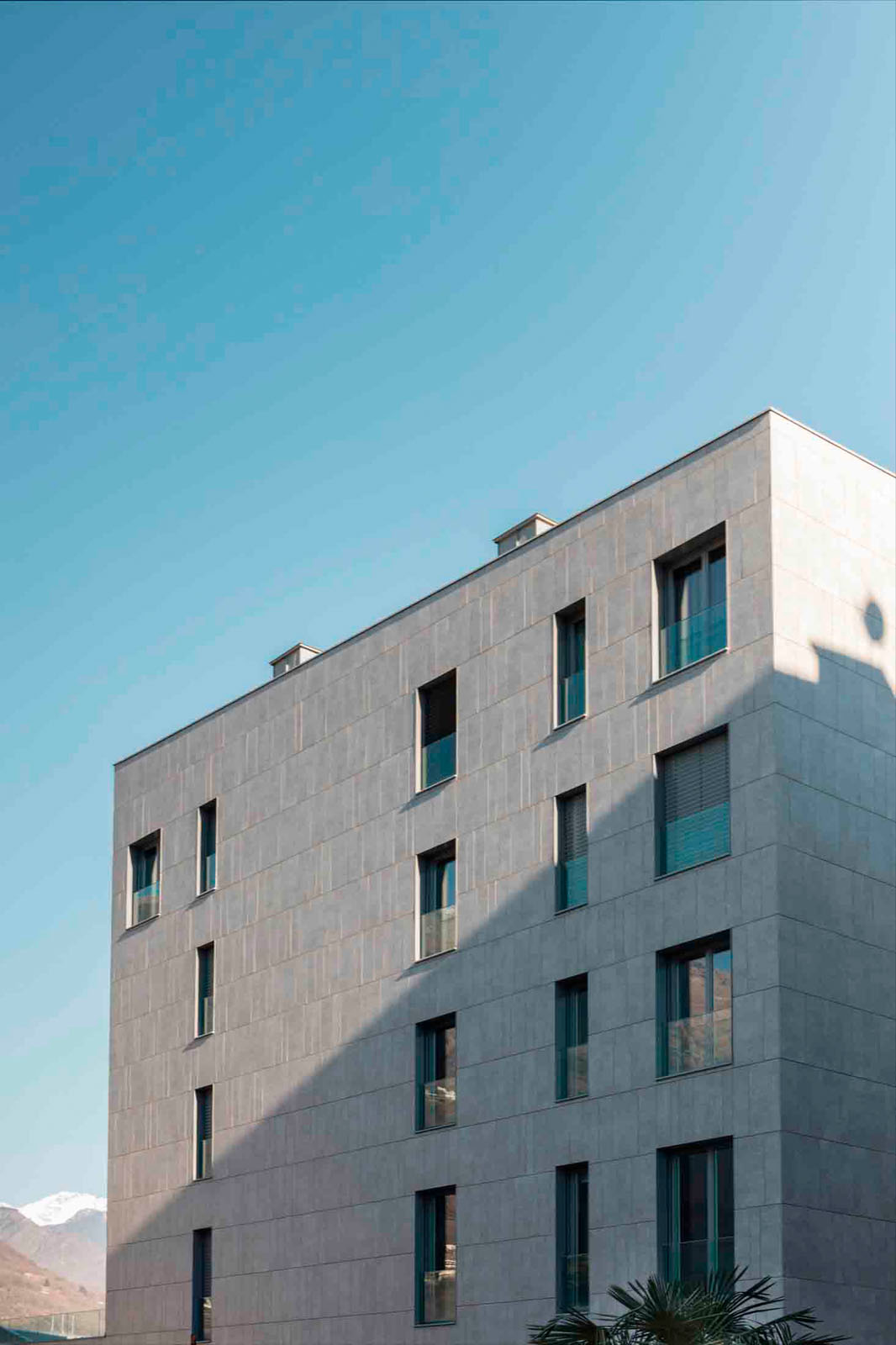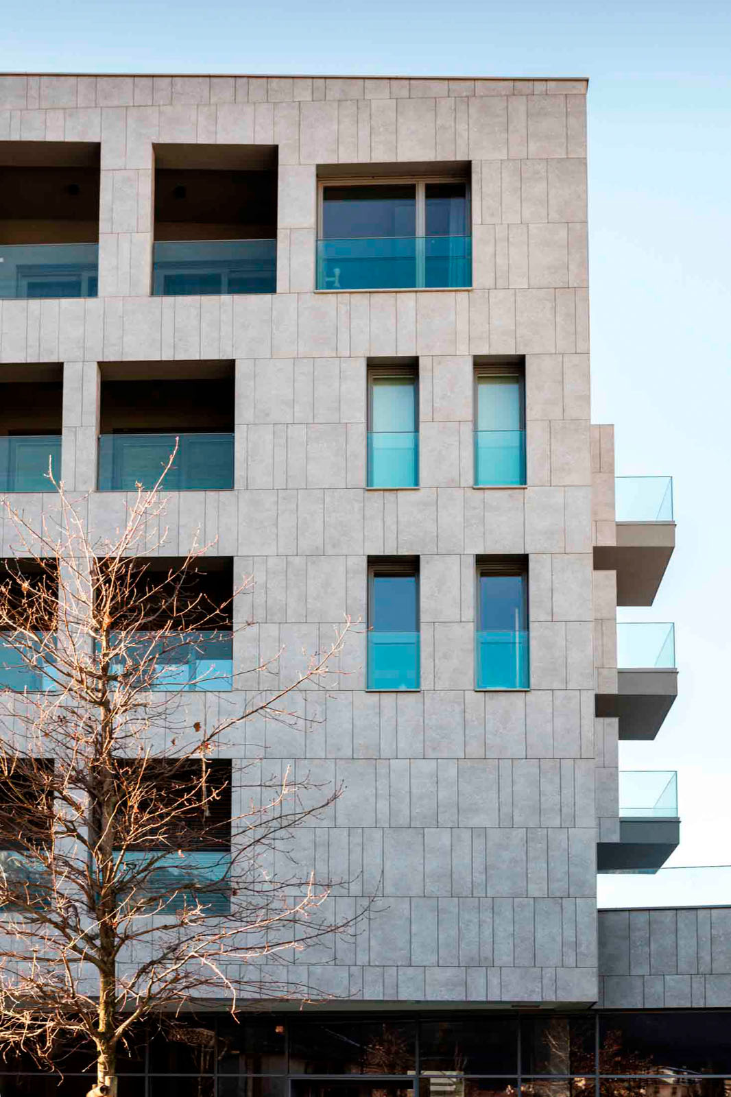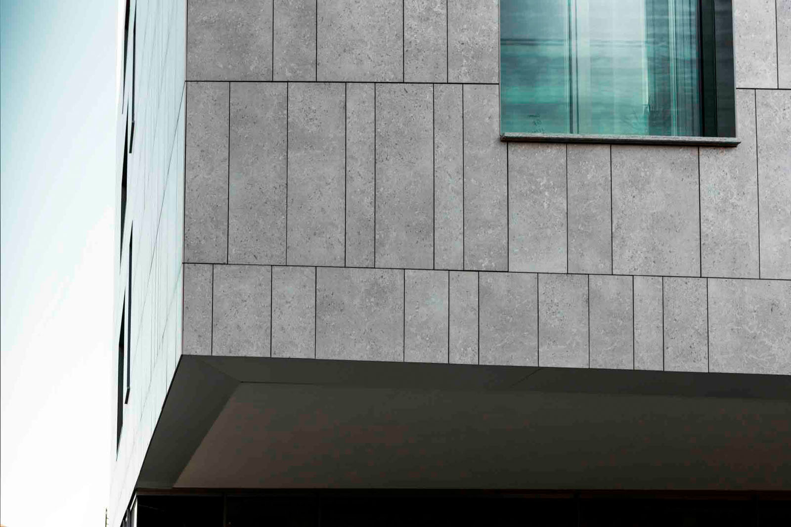 Die gezielte Maßnahme zur Umnutzung des ehemaligen Fabrikgeländes Area Martinelli in der Provinz Sondrio trägt die Handschrift des Architekturbüros Antonio Citterio Patricia Viel. Vorrangiges Ziel des Projekts zur Umnutzung des Geländes war, die städtebauliche Qualität durch Schaffung neuer Dienstleistungen und öffentlicher Räume zu verbessern. Im Fokus der Maßnahme stand u.a. das Gebäude G, ein moderner Bau mit sauberen geometrischen Formen, dessen vorgehängte hinterlüftete Fassade ganz mit dem Feinsteinzeug in Natursteinoptik Mystone Gris Fleury in mehreren Formaten (20x120 cm, 30x120 cm, 40x120 cm, 60x120 cm) bekleidet wurde.