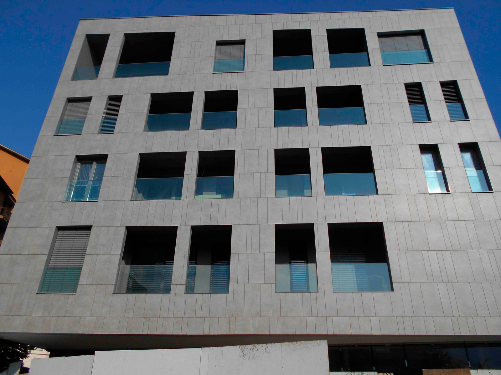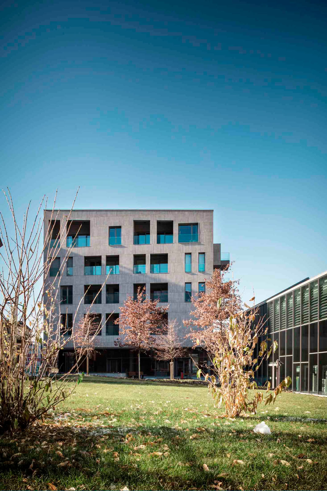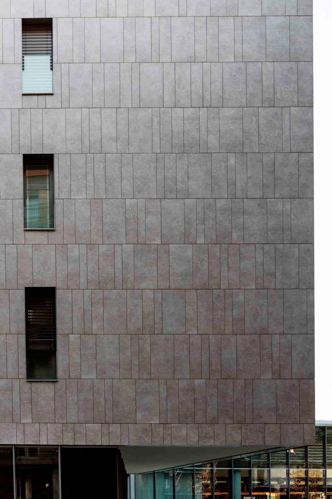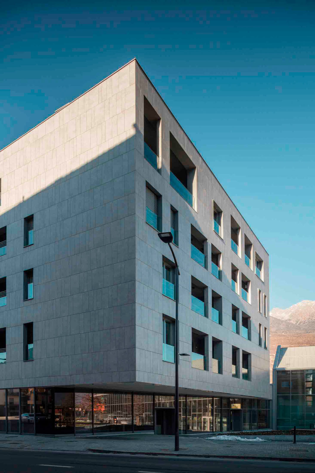 Die gezielte Maßnahme zur Umnutzung des ehemaligen Fabrikgeländes Area Martinelli in der Provinz Sondrio trägt die Handschrift des Architekturbüros Antonio Citterio Patricia Viel. Vorrangiges Ziel des Projekts zur Umnutzung des Geländes war, die städtebauliche Qualität durch Schaffung neuer Dienstleistungen und öffentlicher Räume zu verbessern. Im Fokus der Maßnahme stand u.a. das Gebäude G, ein moderner Bau mit sauberen geometrischen Formen, dessen vorgehängte hinterlüftete Fassade ganz mit dem Feinsteinzeug in Natursteinoptik Mystone Gris Fleury in mehreren Formaten (20x120 cm, 30x120 cm, 40x120 cm, 60x120 cm) bekleidet wurde.