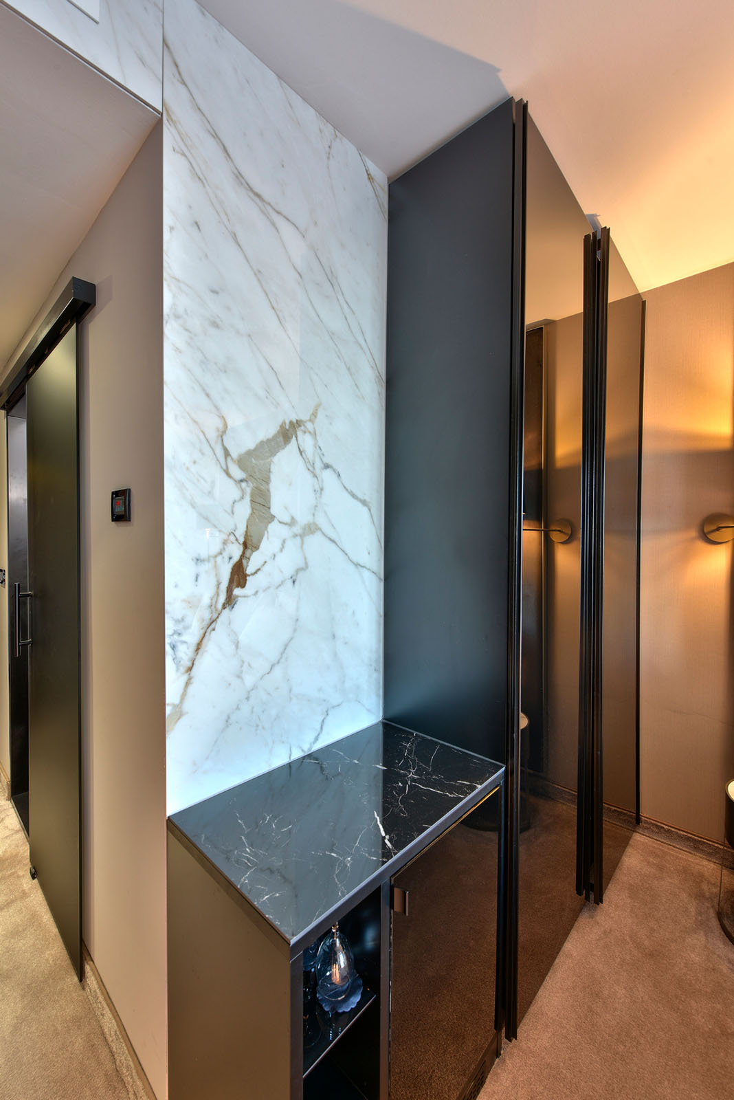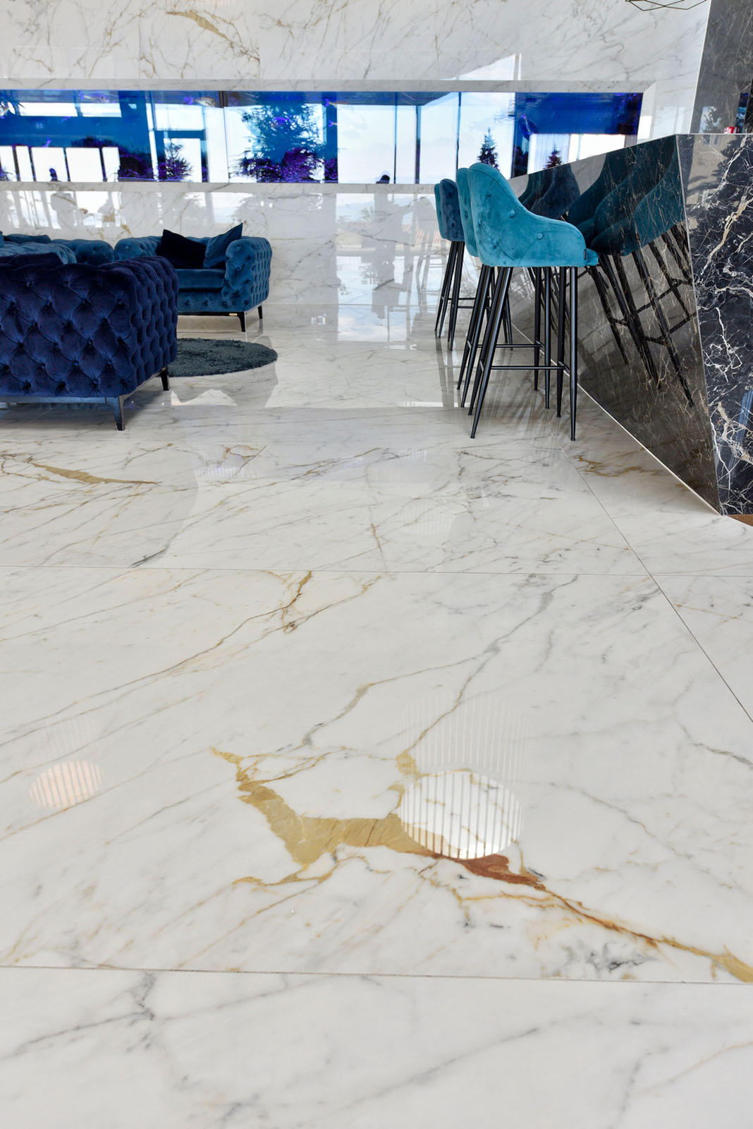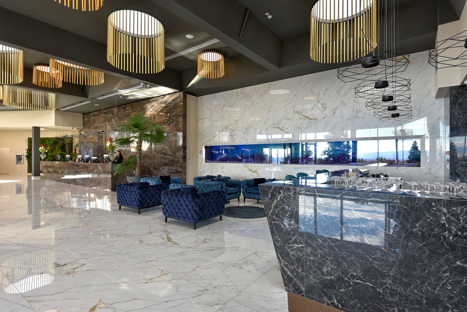 Die Kollektionen von Marazzi tragen in diesem Projekt entscheidend zur Gesamtwirkung bei und prägen die verschiedenen Ambiente, in denen sie eingesetzt wurden. In den hochwertigen und einzigartigen großformatigen Feinsteinzeugplatten der Kollektion Grande Marble Look wurde die Faszination klassischen Marmors mit seinen kontrastfarbenen Äderungen und dem Wechsel von hellen und dunklen Farbtönen in vielfältigen Nuancen mittels Digitaltechnologie neuinterpretiert. Ein Produkt, das hier für die Gemeinschaftsbereiche in den Varianten Golden White, Saint Laurent und Frappucino im Format 120x240 cm ausgewählt wurde. Auch in der luxuriösen Adriatic Sky Spa im achten Stock des Hotels mit großen Glasfronten und einem umwerfenden Blick aufs Meer wurden die großformatigen Platten Grande Marble Look Frappuccino verlegt.