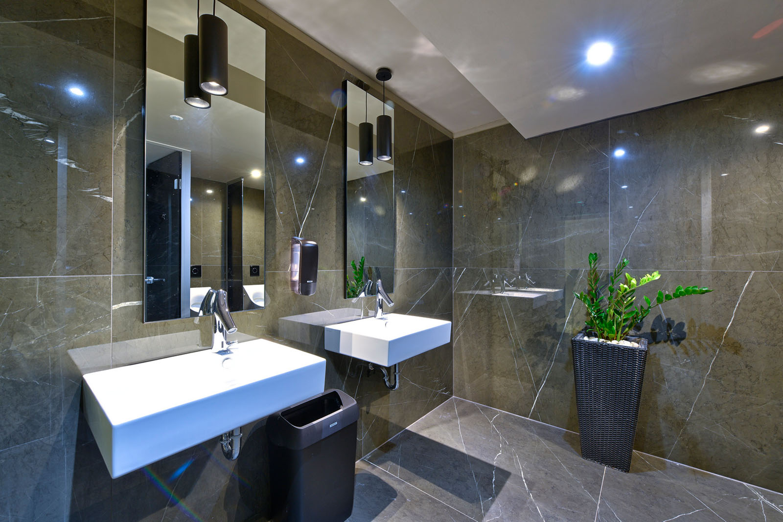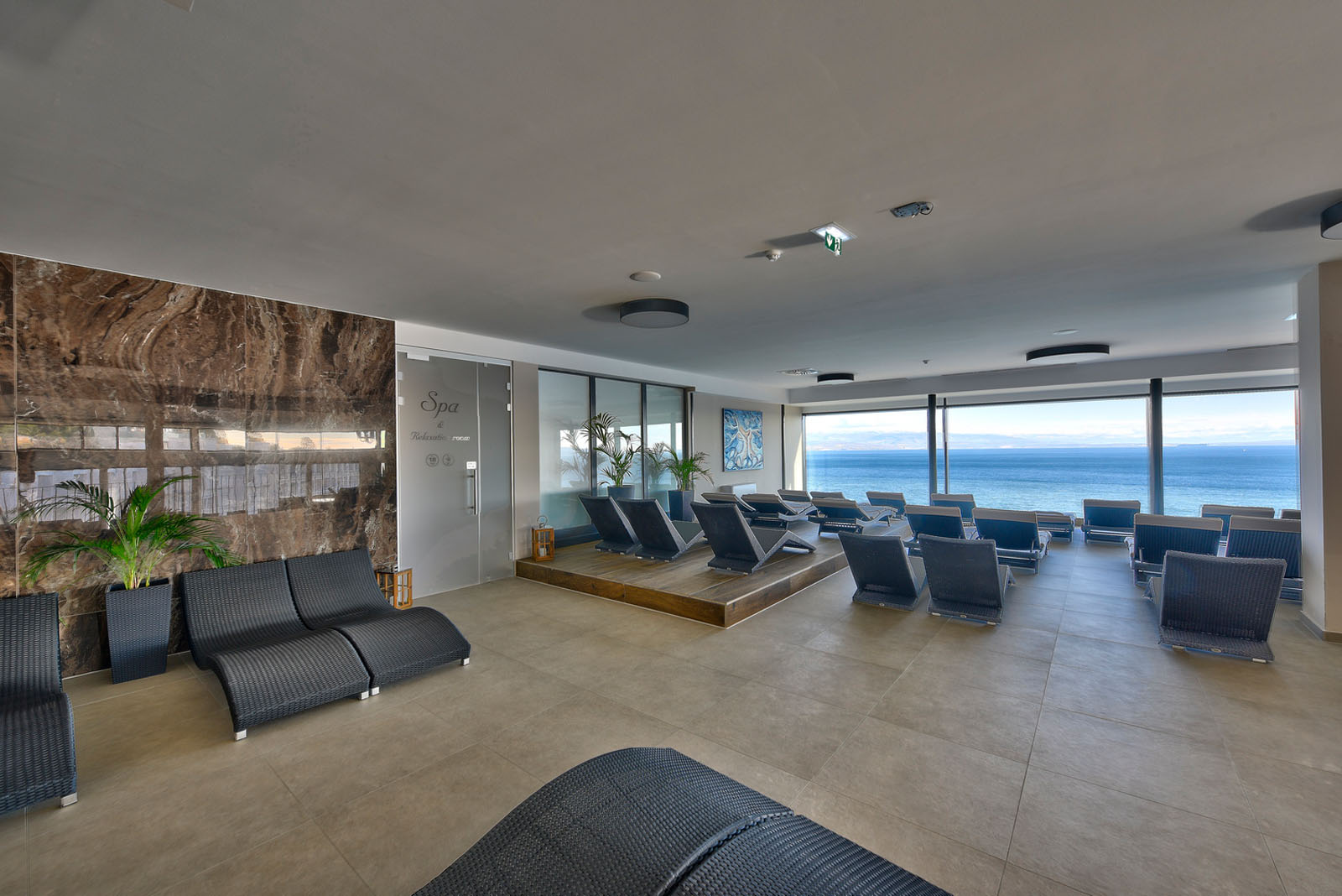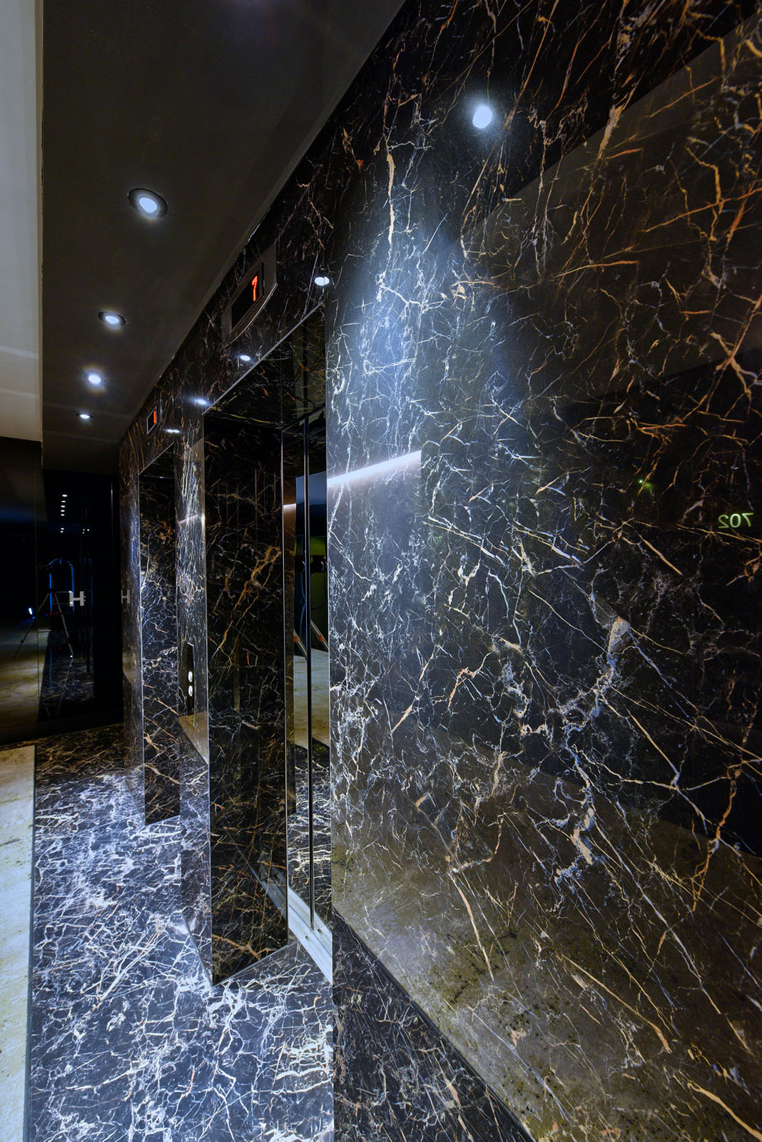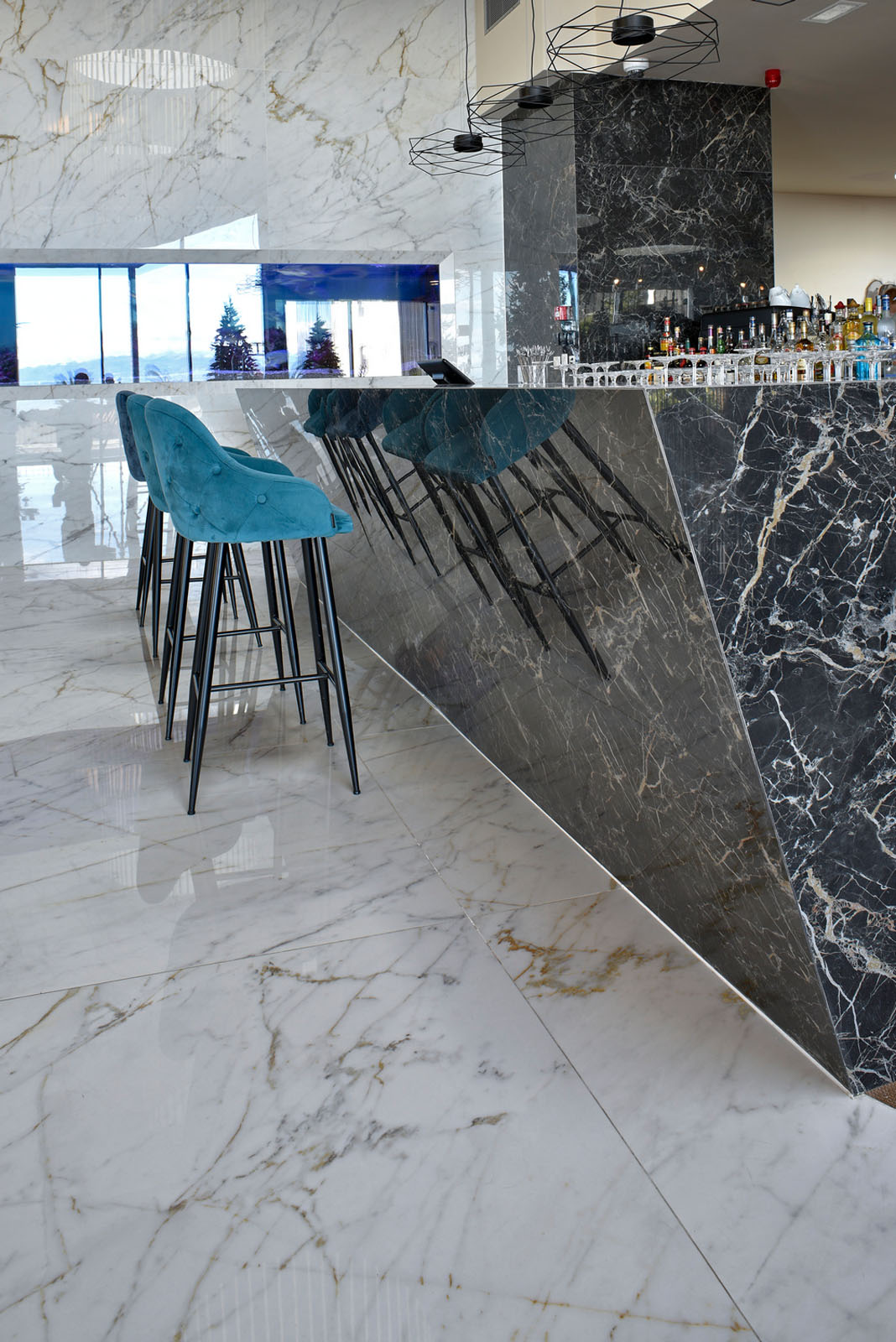 Die Kollektionen von Marazzi tragen in diesem Projekt entscheidend zur Gesamtwirkung bei und prägen die verschiedenen Ambiente, in denen sie eingesetzt wurden. In den hochwertigen und einzigartigen großformatigen Feinsteinzeugplatten der Kollektion Grande Marble Look wurde die Faszination klassischen Marmors mit seinen kontrastfarbenen Äderungen und dem Wechsel von hellen und dunklen Farbtönen in vielfältigen Nuancen mittels Digitaltechnologie neuinterpretiert. Ein Produkt, das hier für die Gemeinschaftsbereiche in den Varianten Golden White, Saint Laurent und Frappucino im Format 120x240 cm ausgewählt wurde. Auch in der luxuriösen Adriatic Sky Spa im achten Stock des Hotels mit großen Glasfronten und einem umwerfenden Blick aufs Meer wurden die großformatigen Platten Grande Marble Look Frappuccino verlegt.