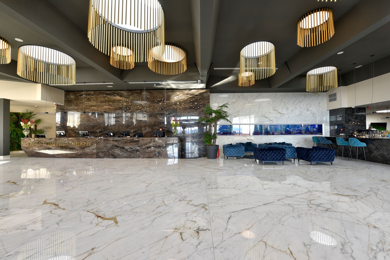 Ein 5-Sterne-Urlaub im Grand Hotel Adriatic mit atemberaubendem Blick aufs Meer. Ein Hotel in modernem Stil mit großzügigen Räumlichkeiten, deren Ausgestaltung entscheidend durch die Auswahl der Materialien und Farbgebungen – Feinsteinzeug in Marmoroptik im Großformat und Holzoptik – geprägt ist.