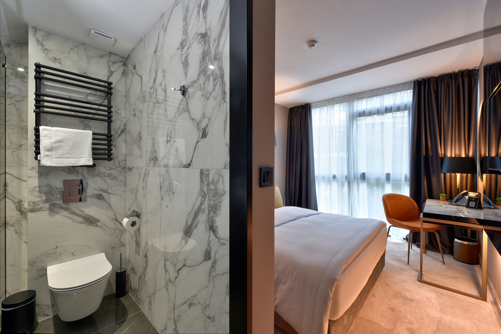 Beim Bodenbelag legte das Projekt seinen Schwerpunkt auf den Wechsel unterschiedlicher Materialoptiken. Das hierfür verwendete Feinsteinzeug in Betonoptik Terratech im Format 75x75 cm ist eine technische Kollektion, die das Zusammenspiel von Material und Farbe thematisiert. Sie stellt nicht zuletzt dank der neuartigen rutschhemmenden Technologie StepWise eine neue Ära im Bereich High Performance-Produkte dar. Verwendet wurden die Farbstellungen Cannella, Avorio und Senape, abgestimmt auf die Outdoor-Kollektion Vero in der Überstärke 20 mm und in der Farbe Rovere im Format 40x120 cm, welche die Farbtöne und Oberflächenstrukturen von Naturholz aufgreift. In den Zimmern und Suiten wurden für die Wand- und Bodenbeläge der Bäder die Platten von Grande Marble Look in den Varianten Imperiale, Calacatta Extra und Elegant Black ausgewählt, die den Räumen eine moderne Eleganz verleihen.