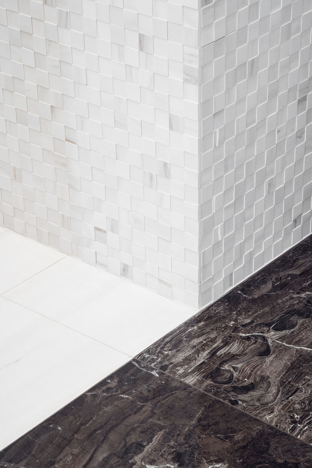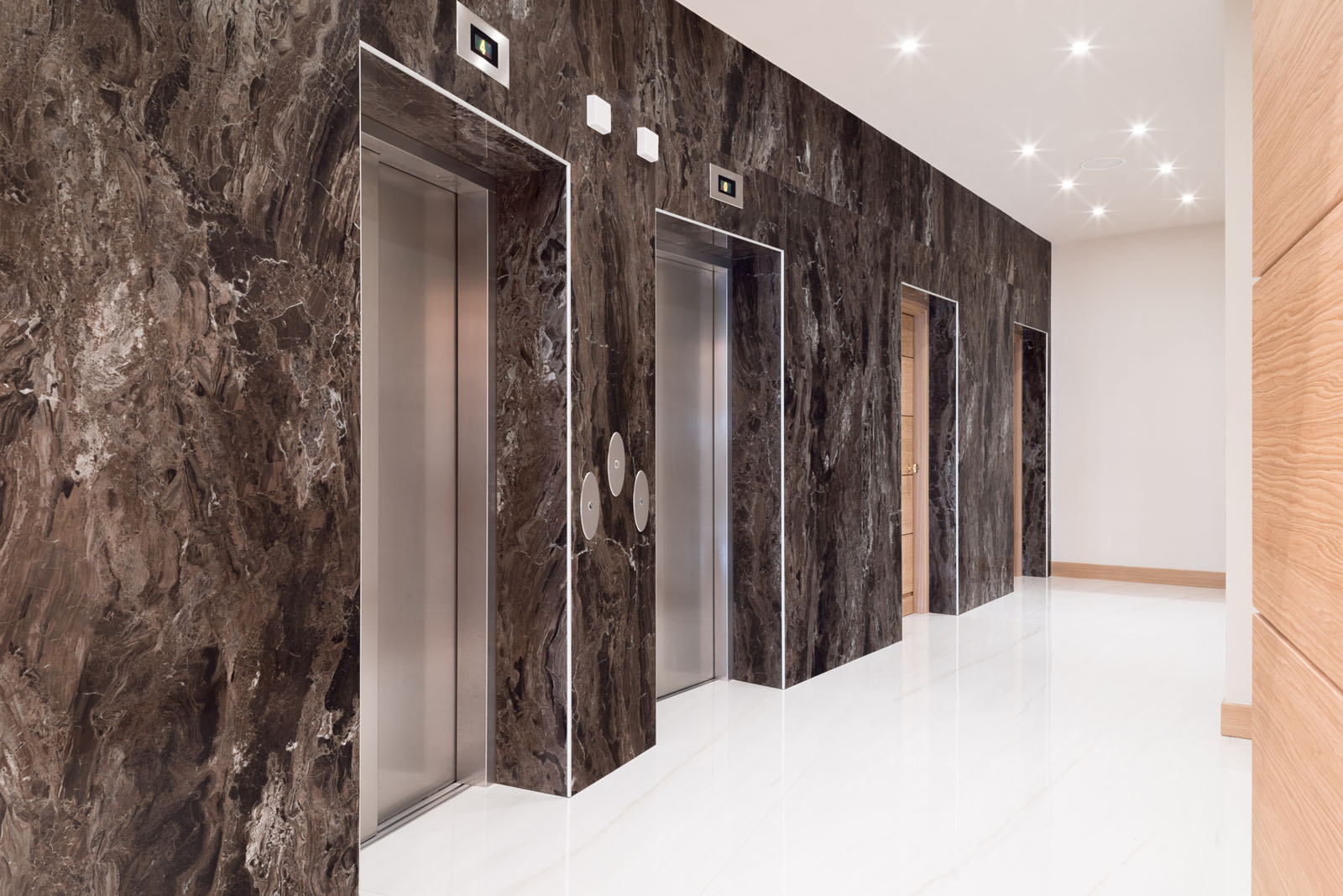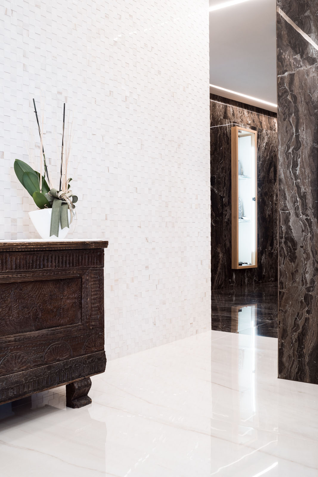 Für den neuen Look des 5-Sterne-Hotels wurden das Feinsteinzeug in Marmoroptik Allmarble und die Kollektion Grande Marble Look in der Materialstärke 6 mm und 12 mm gewählt, die ideal für die nahtlose Gestaltung von Belagflächen ist. Grande Marble Look in den Formaten 120x120 cm und 120x240 cm und in den Varianten Frappuccino und Lasa glänzend bekleidet daher Fußboden, Säulen und Rezeptionstresen in der Lobby. Das Material, das der Lobby eine raffinierte, elegante Ausstrahlung verleiht, ist auch in den WC-Räumen zu finden. Das 3D-Mosaik Allmarble Lasa wurde hingegen für die Rückwand der Rezeption und die Wände in der Lobby gewählt, wo die Varianten Lasa und Frappuccino reizvolle Kontraste bilden.