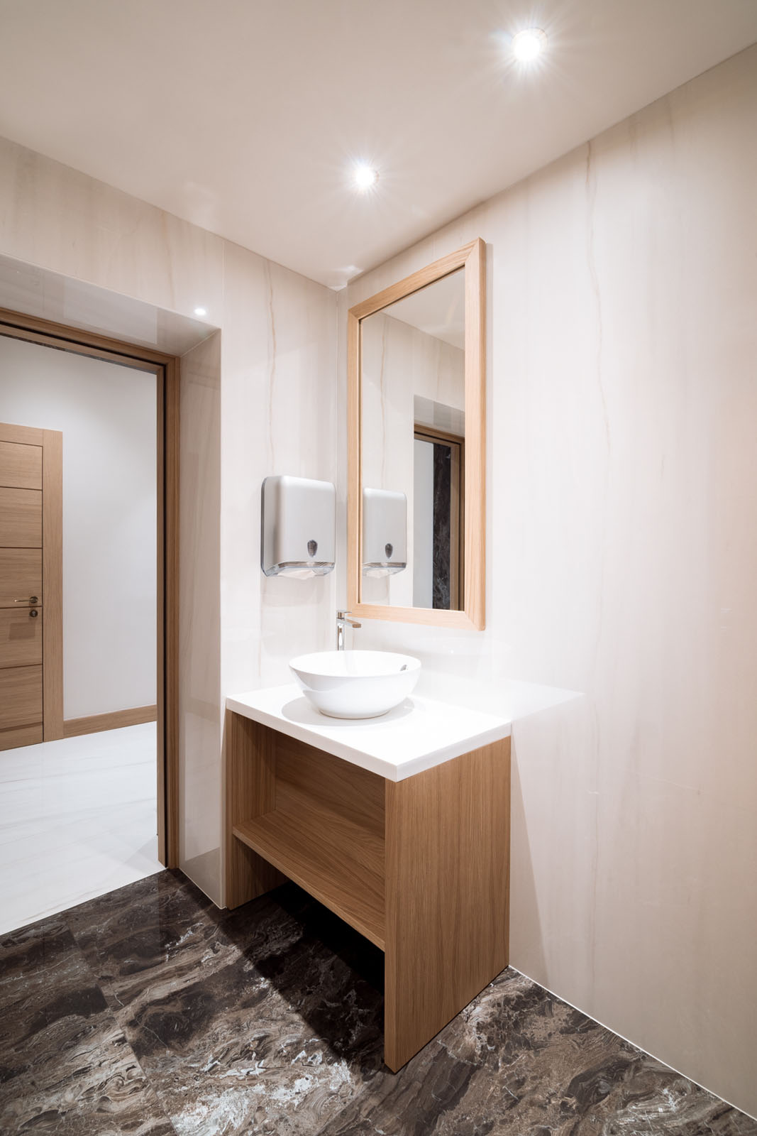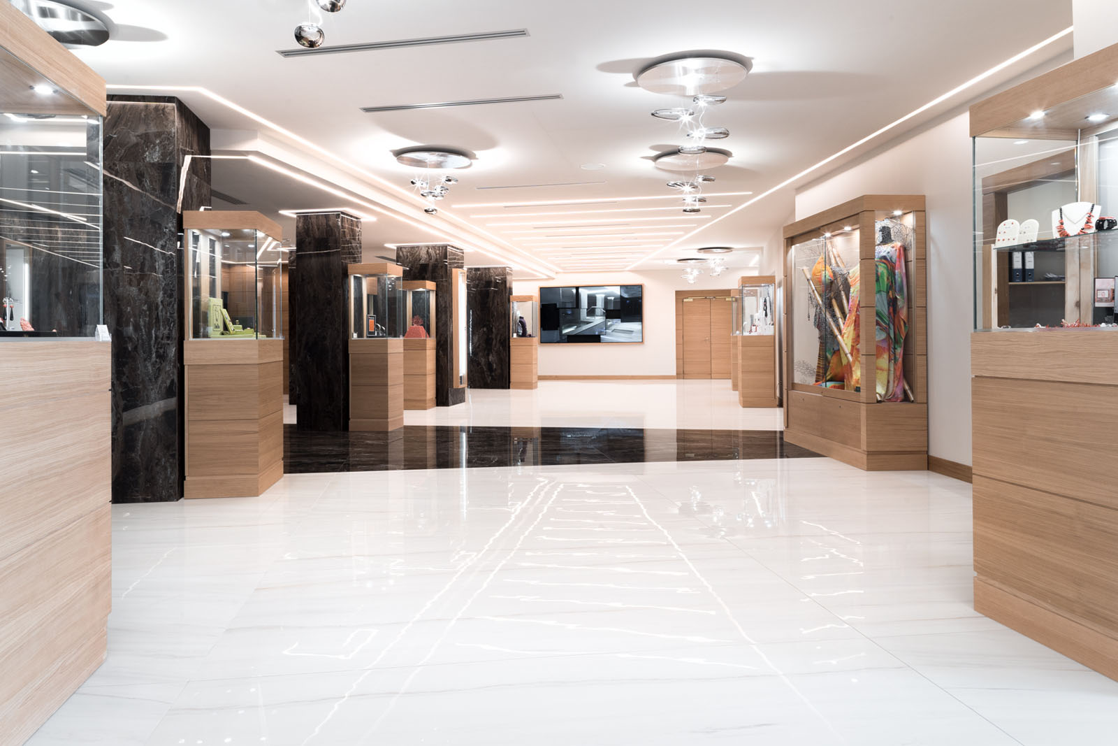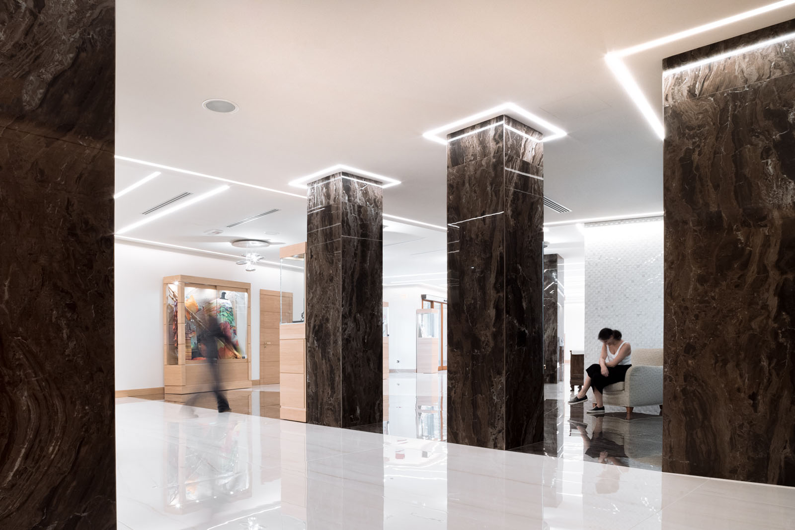 Für den neuen Look des 5-Sterne-Hotels wurden das Feinsteinzeug in Marmoroptik Allmarble und die Kollektion Grande Marble Look in der Materialstärke 6 mm und 12 mm gewählt, die ideal für die nahtlose Gestaltung von Belagflächen ist. Grande Marble Look in den Formaten 120x120 cm und 120x240 cm und in den Varianten Frappuccino und Lasa glänzend bekleidet daher Fußboden, Säulen und Rezeptionstresen in der Lobby. Das Material, das der Lobby eine raffinierte, elegante Ausstrahlung verleiht, ist auch in den WC-Räumen zu finden. Das 3D-Mosaik Allmarble Lasa wurde hingegen für die Rückwand der Rezeption und die Wände in der Lobby gewählt, wo die Varianten Lasa und Frappuccino reizvolle Kontraste bilden.