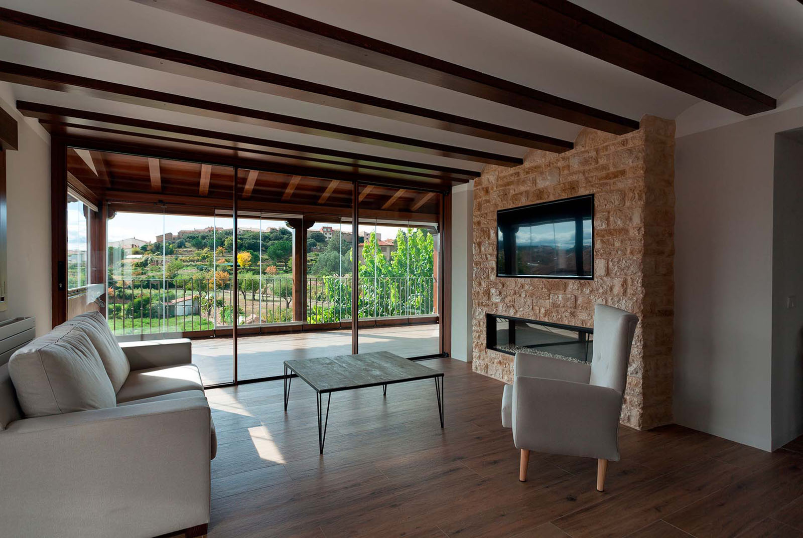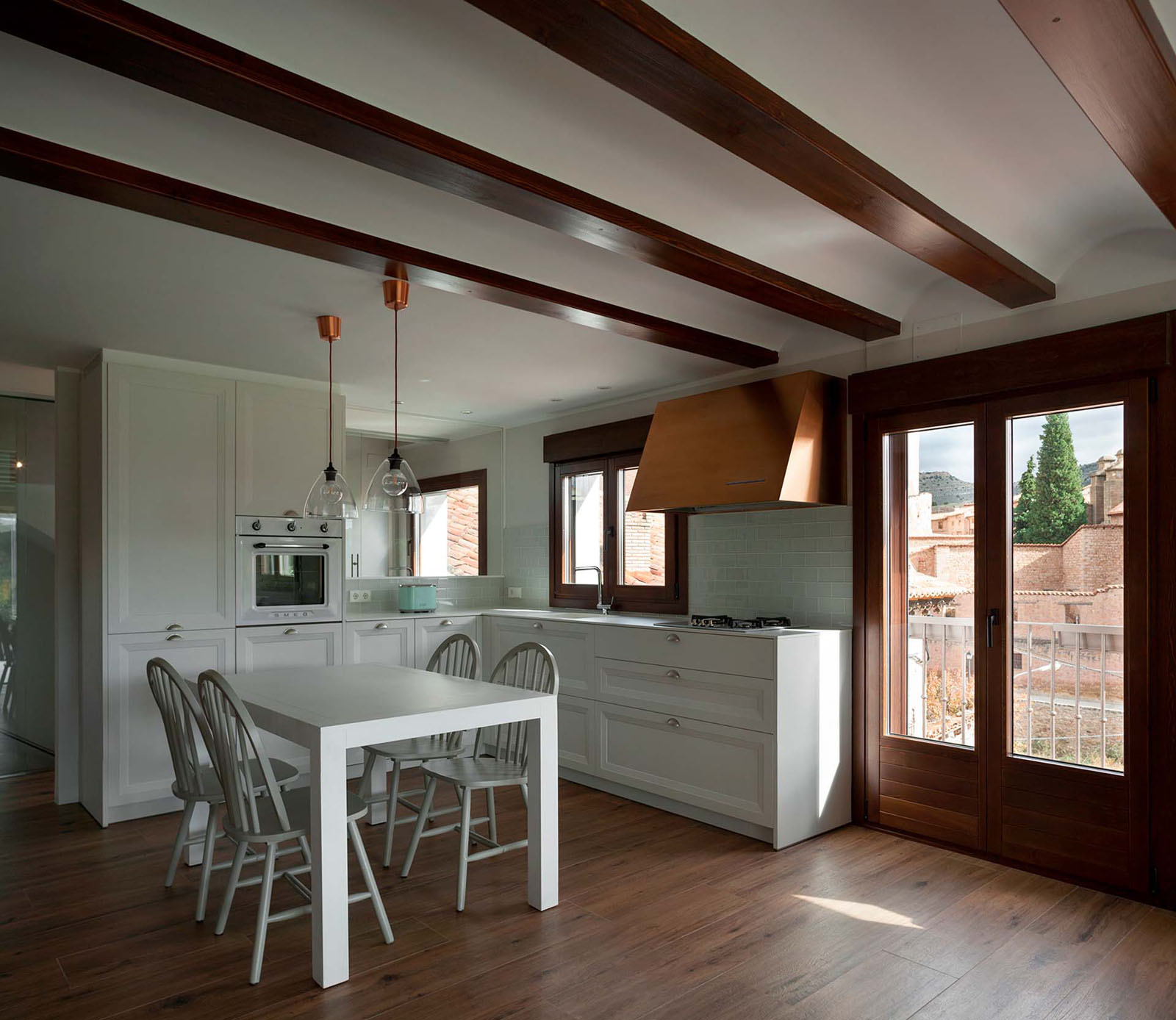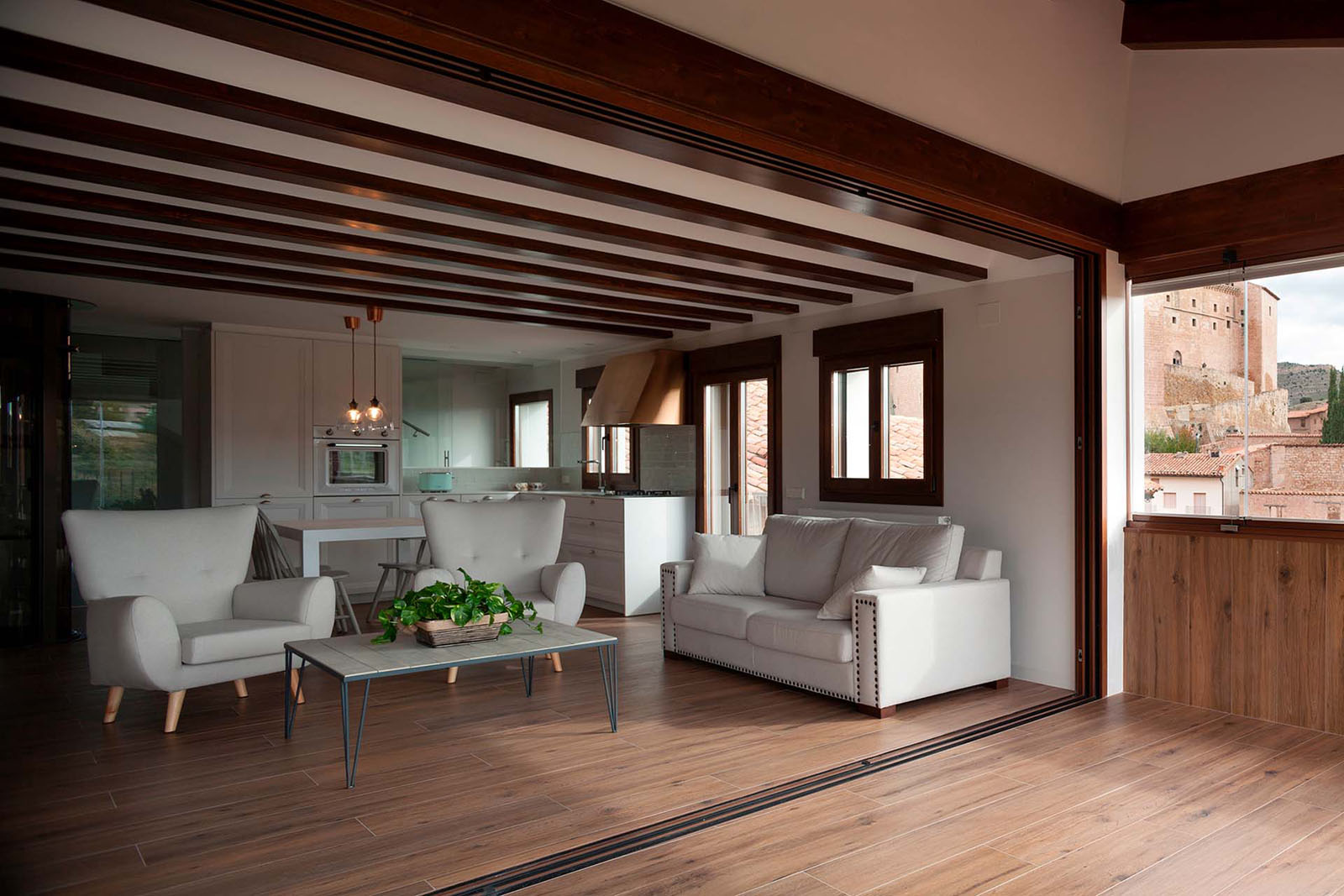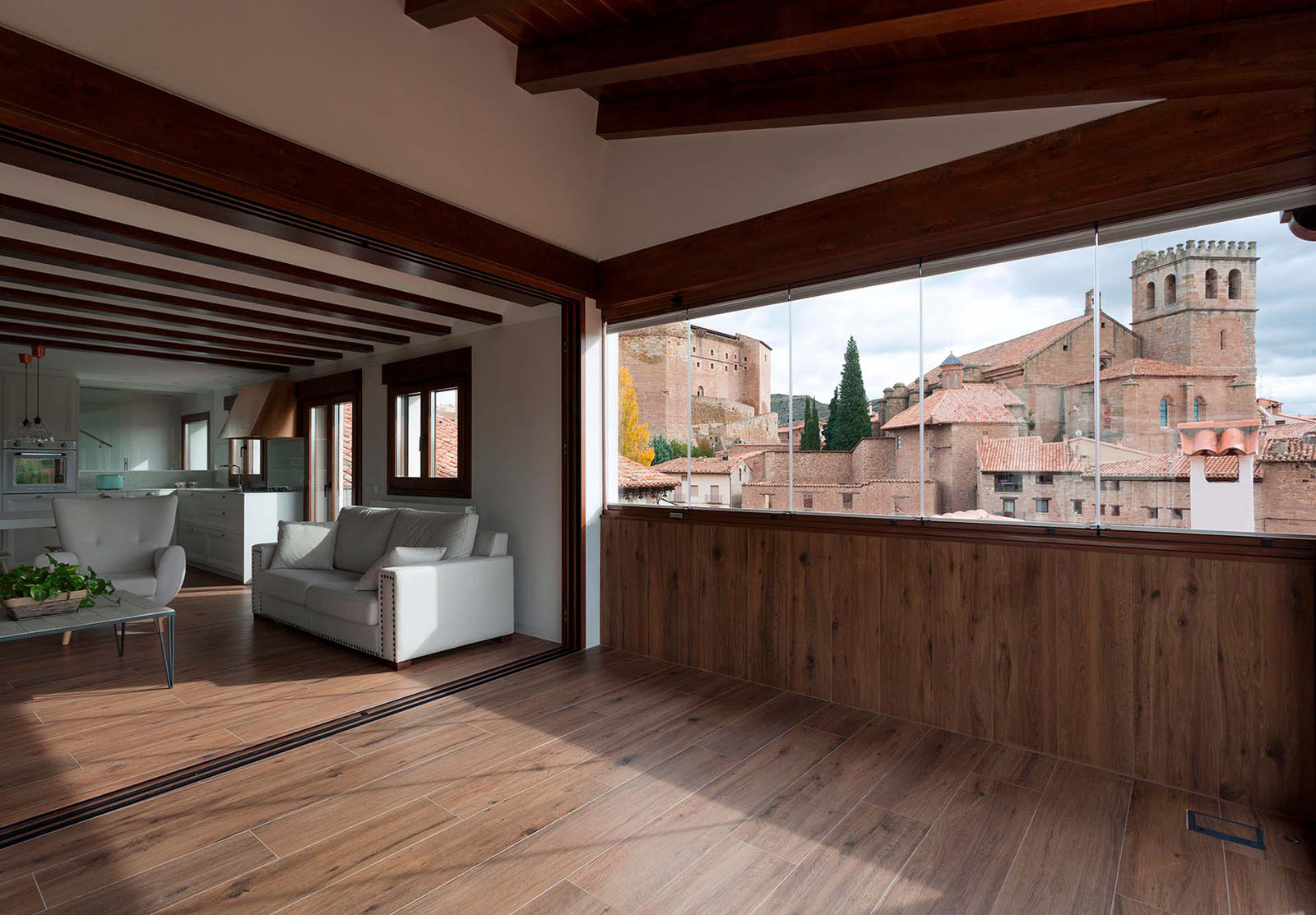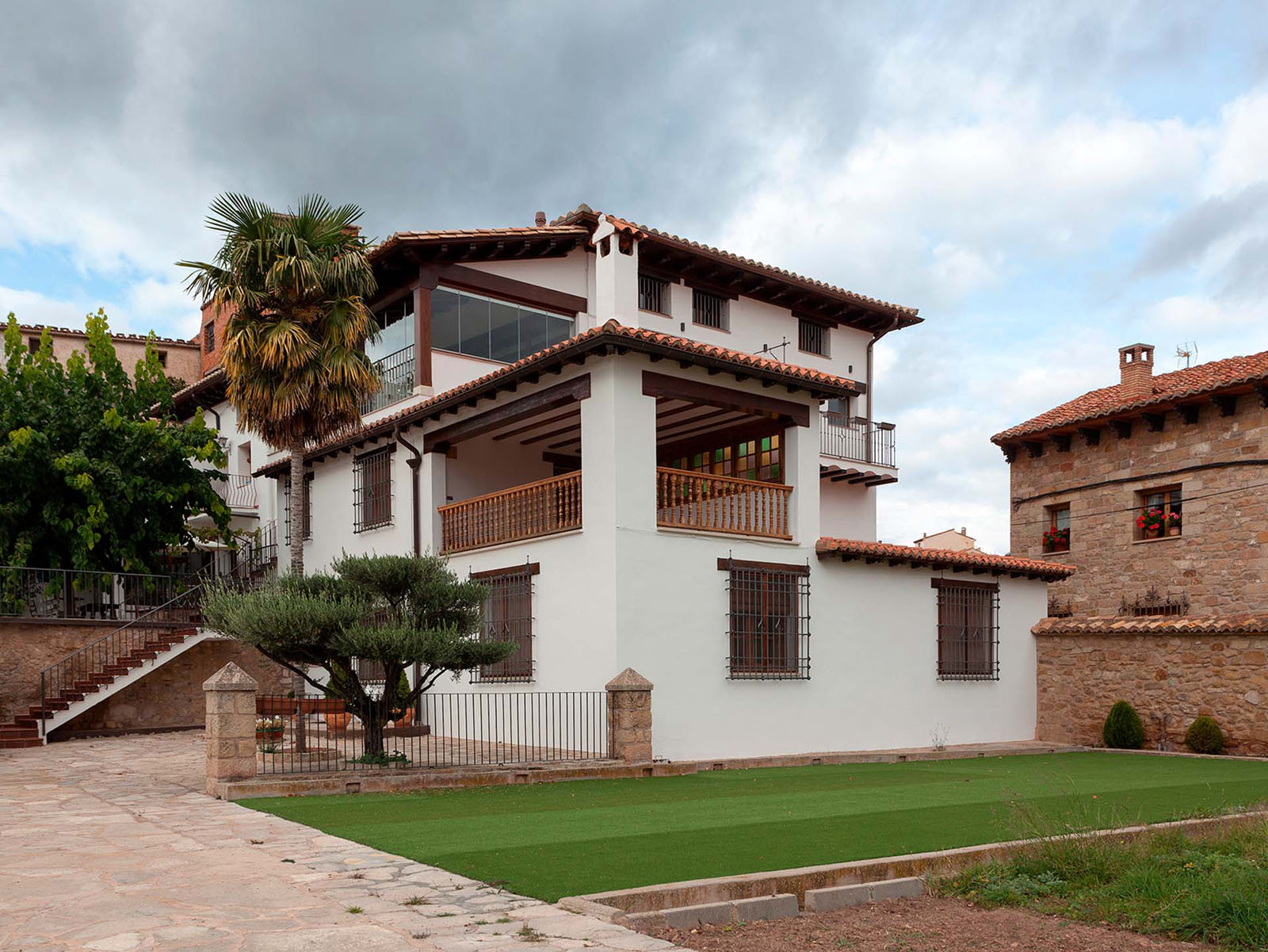 Planen in einer historischen Ortschaft, wo die Zeit stillzustehen scheint. Diese vierstöckige Villa befindet sich in Mora de Rubielos, einer Kleinstadt in Aragonien im Nordosten Spaniens. Bekannt ist sie für ihre mittelalterliche gotische Burg aus dem 14. Jahrhundert, die die Stadt beherrscht. Das nach einem Entwurf von Raul Garcia, Architekt in Valencia, gestaltete Wohnhaus befindet sich in der Nähe dieser Burg. Die speziell zugeschnittener Fensterfronten geben einen einmaligen Blick frei, den auf der einen Seite ist das Haus der Burg zugewandt, auf der anderen dem Grün einer Obstplantage.