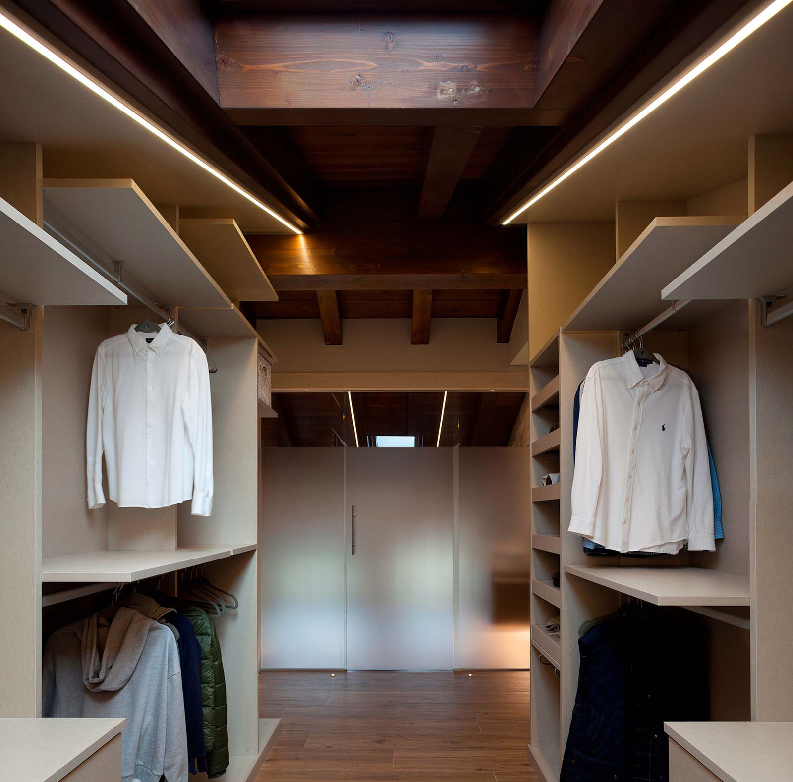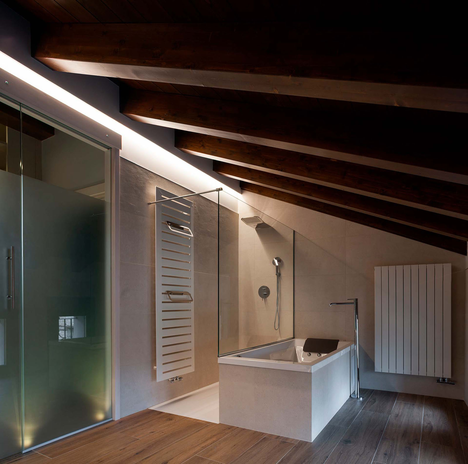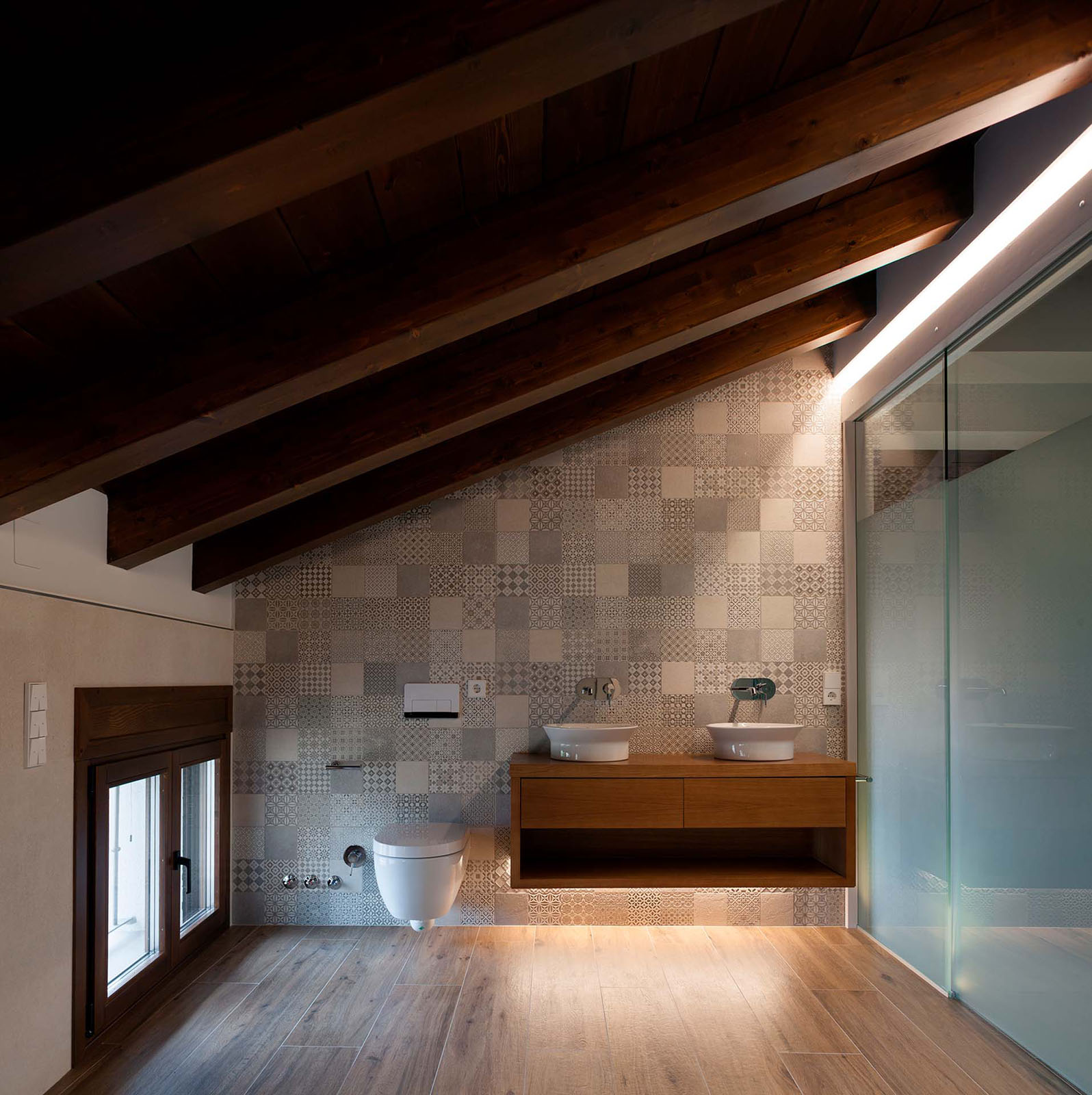 Feinsteinzeug in Holzoptik, Naturstein, weiße Fliesen, Sichtbalken und die Transparenz von Glas: wenige und einfache Elemente zeichnen die Interieurs aus, bei denen eine minimalistische, geradlinige Einrichtung mit detailverliebten, gepflegten Lösungen kombiniert ist.