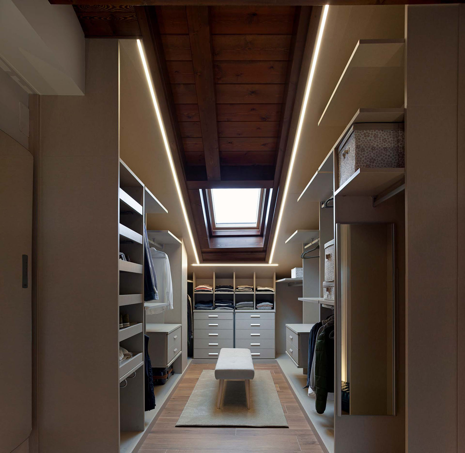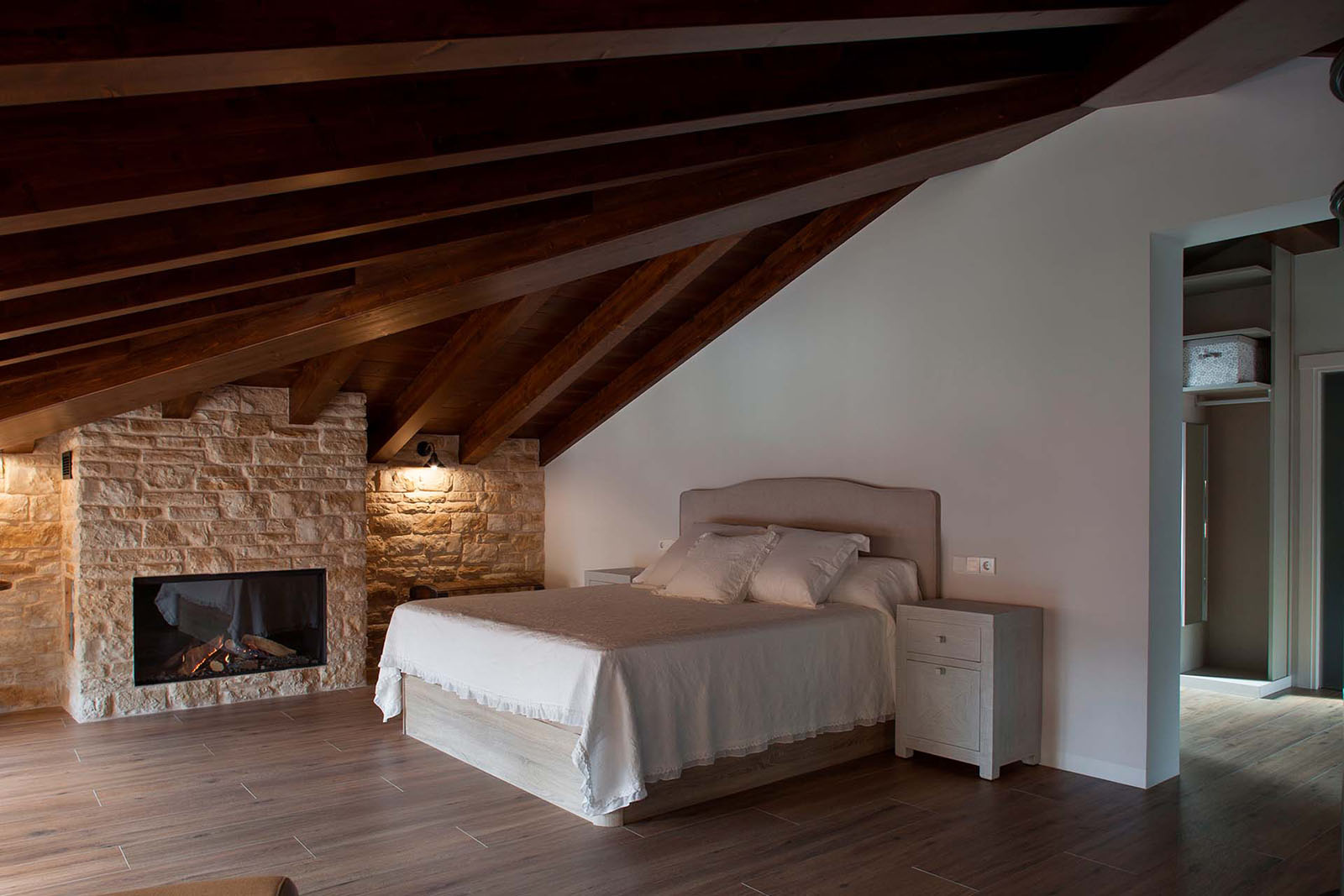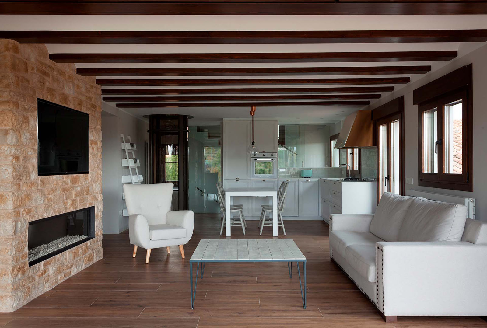 Feinsteinzeug in Holzoptik, Naturstein, weiße Fliesen, Sichtbalken und die Transparenz von Glas: wenige und einfache Elemente zeichnen die Interieurs aus, bei denen eine minimalistische, geradlinige Einrichtung mit detailverliebten, gepflegten Lösungen kombiniert ist.