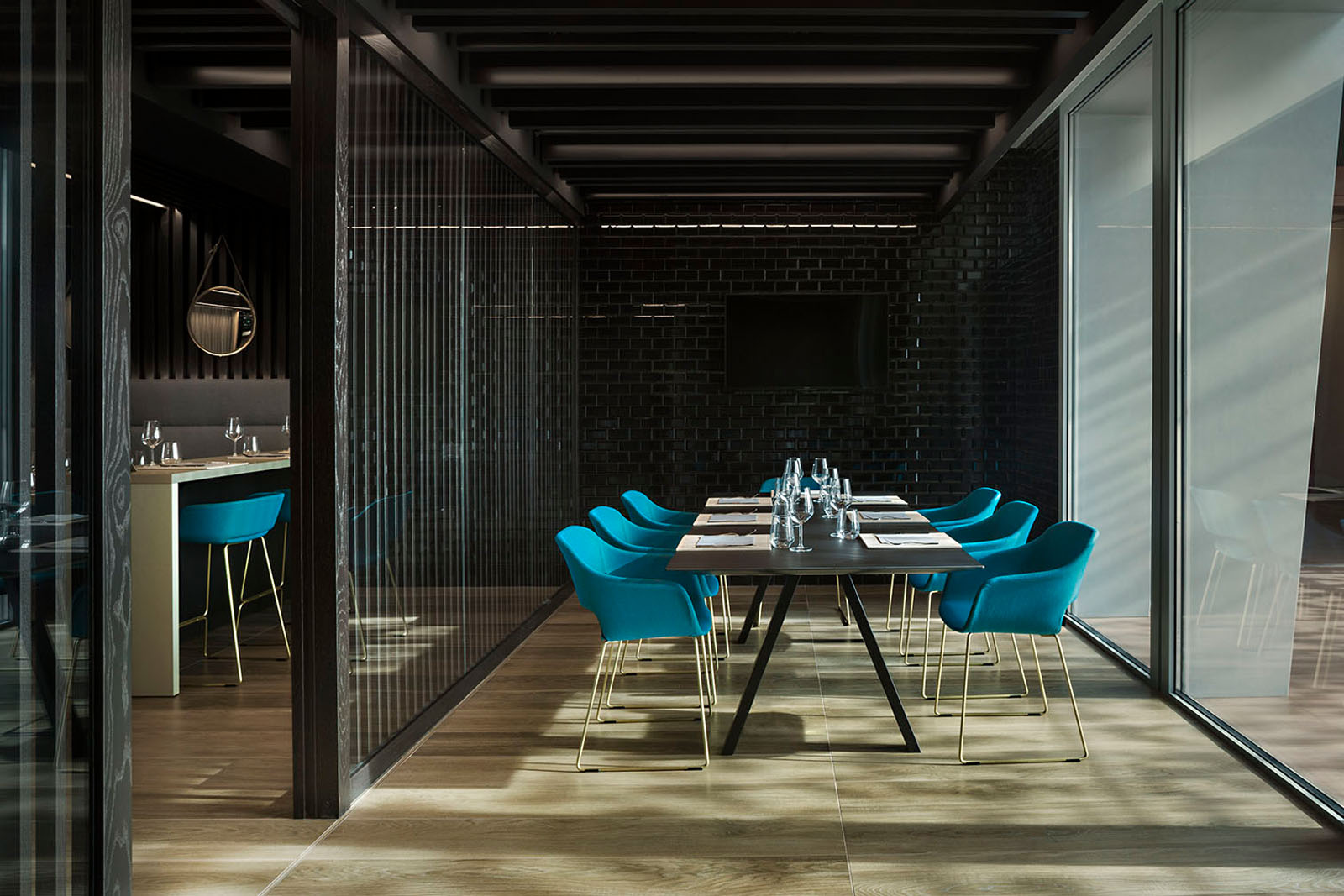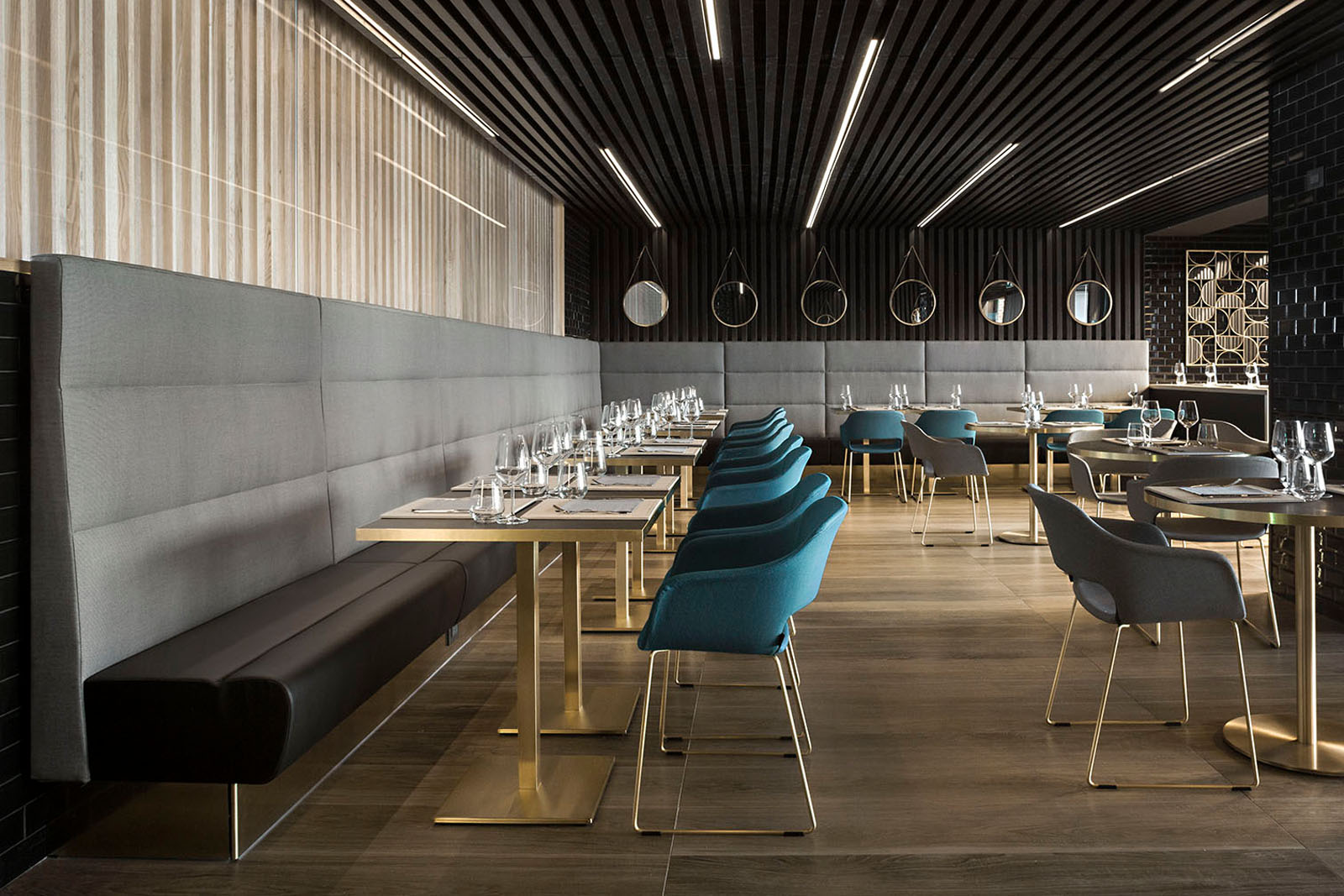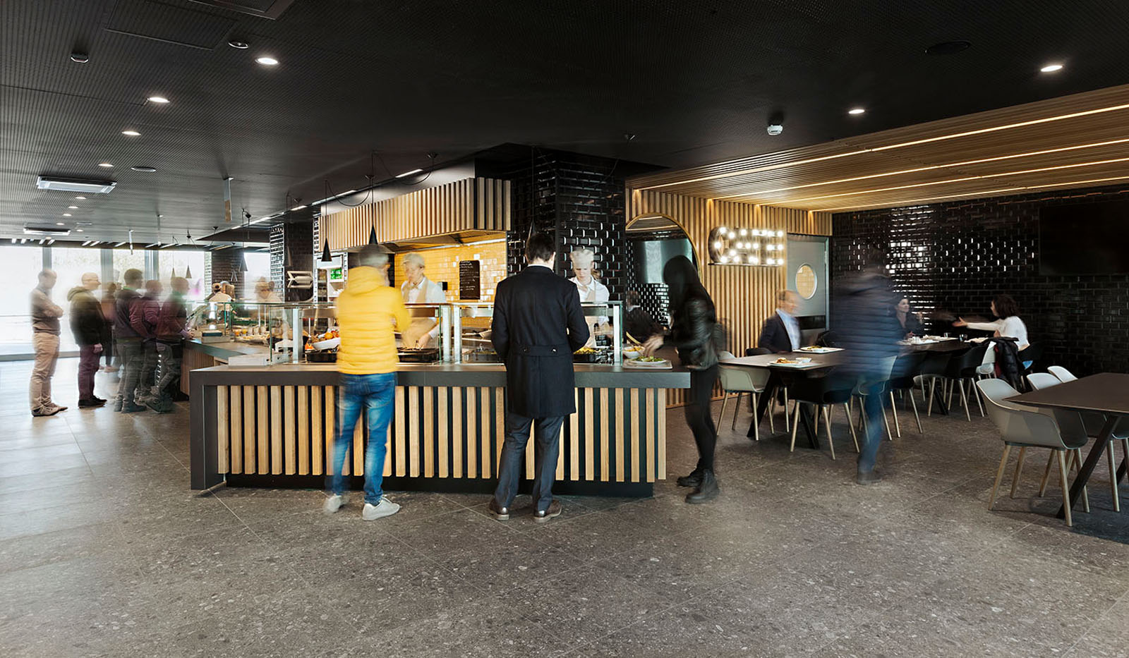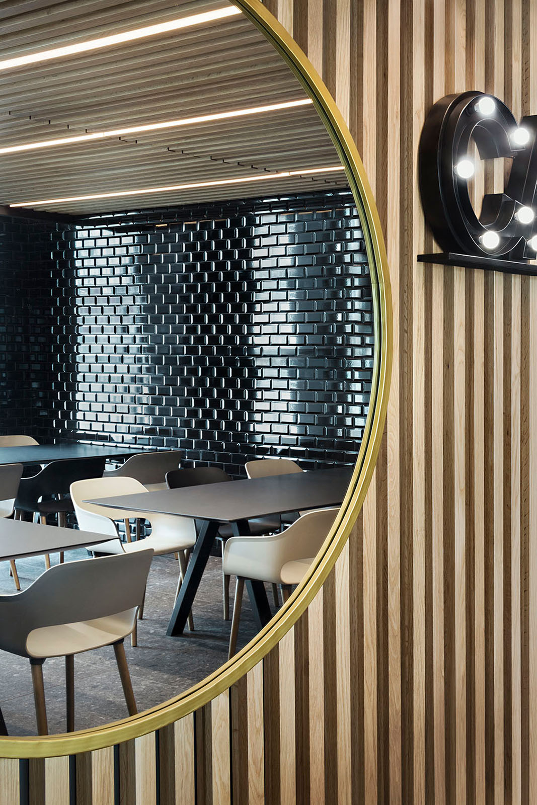 Beim Pixel Bistrò entschied man sich für das Feinsteinzeug in Holzoptik Treverkmust im Format 25x160 cm Brown, Variante Selection ohne Knoten. Das Feinsteinzeug in Holzoptik wurde mit den Keramikfliesen Hello in Farbe Schwarz mit Finish Diamantato Lux im Format 7,5x15 cm zur Wandverkleidung kombiniert.