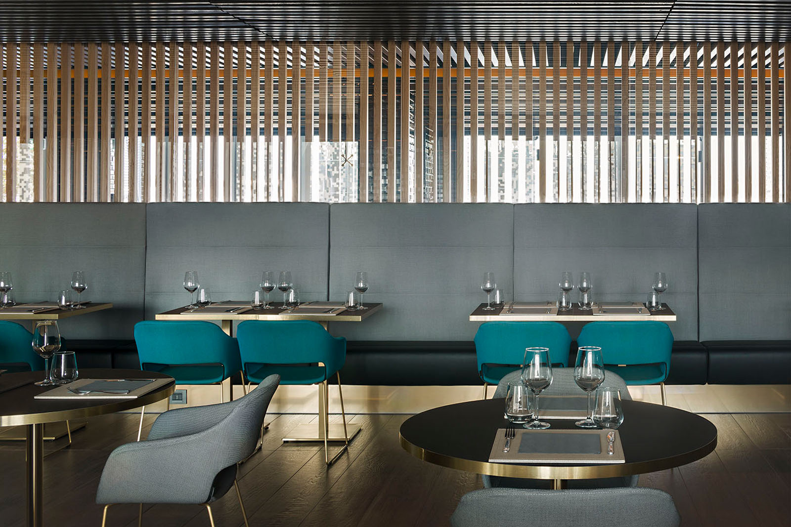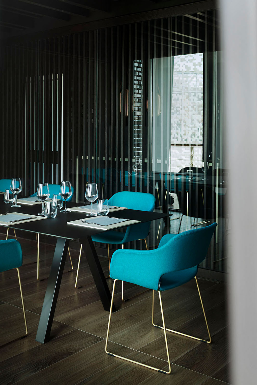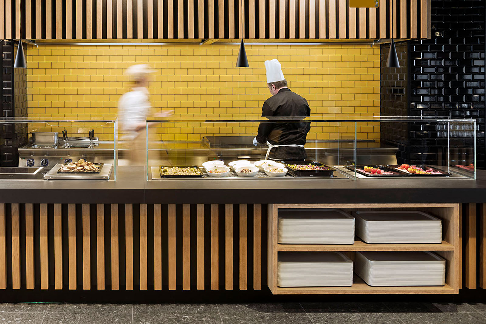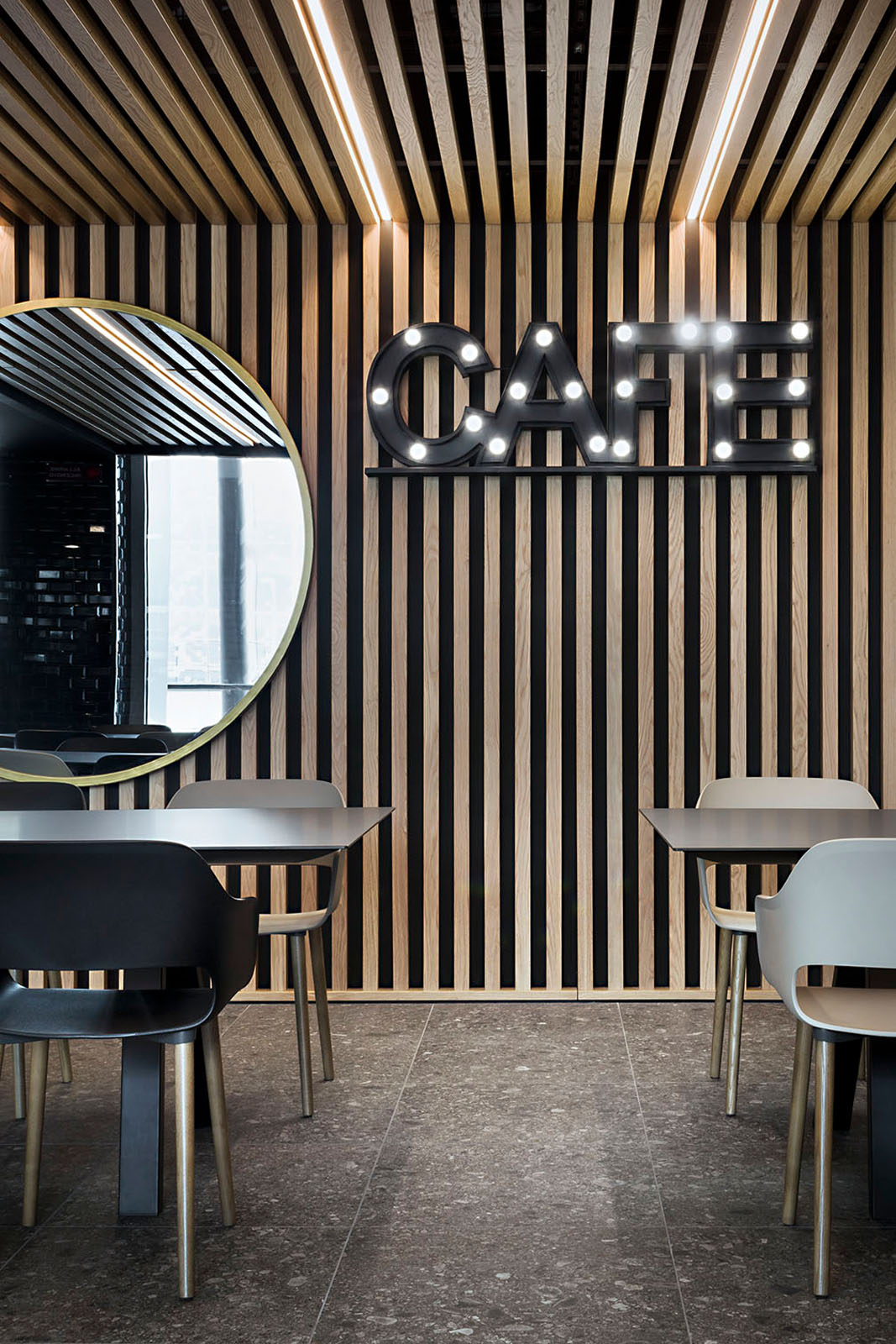 Beim Pixel Bistrò entschied man sich für das Feinsteinzeug in Holzoptik Treverkmust im Format 25x160 cm Brown, Variante Selection ohne Knoten. Das Feinsteinzeug in Holzoptik wurde mit den Keramikfliesen Hello in Farbe Schwarz mit Finish Diamantato Lux im Format 7,5x15 cm zur Wandverkleidung kombiniert.