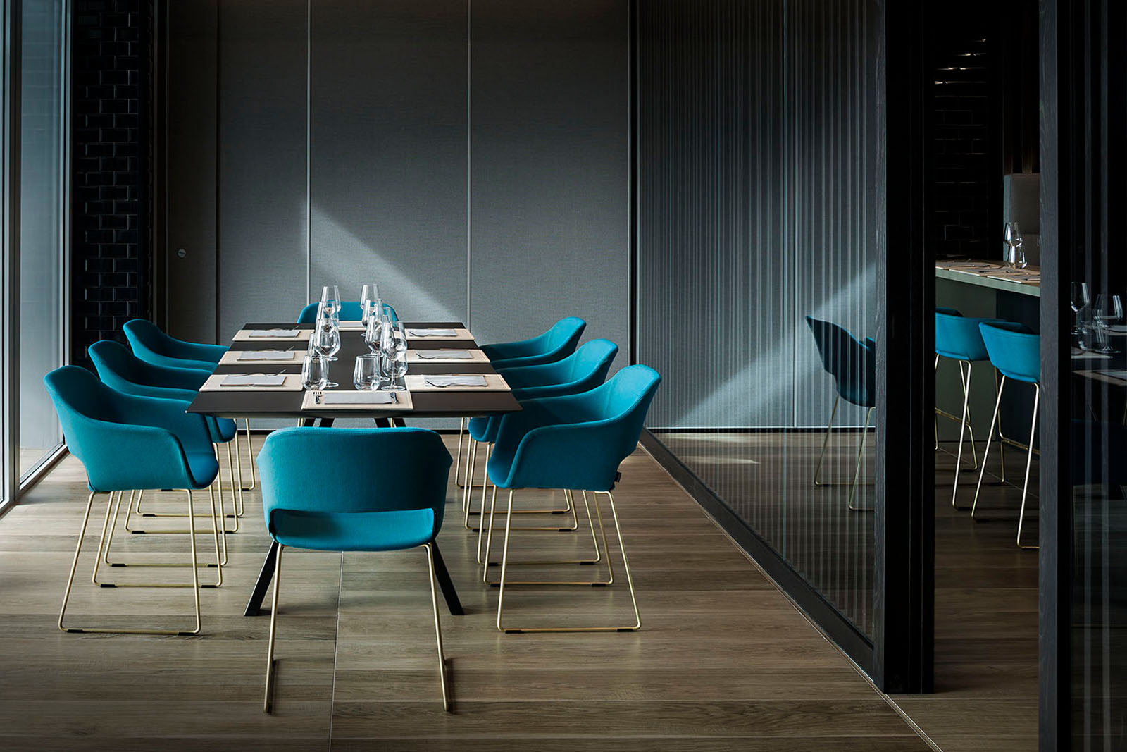 Das Hauptkonzept von Kilometro Rosso ist die Synergie zwischen den Kompetenzen; aus dieser Idee entstand das hybride Projekt des Architekturbüros Luca Bombassei: zwei Lokale, in denen das Feinsteinzeug von Marazzi perfekt die Anforderungen bezüglich Innovation und Begegnung in den Räumen der Zukunft repräsentiert.