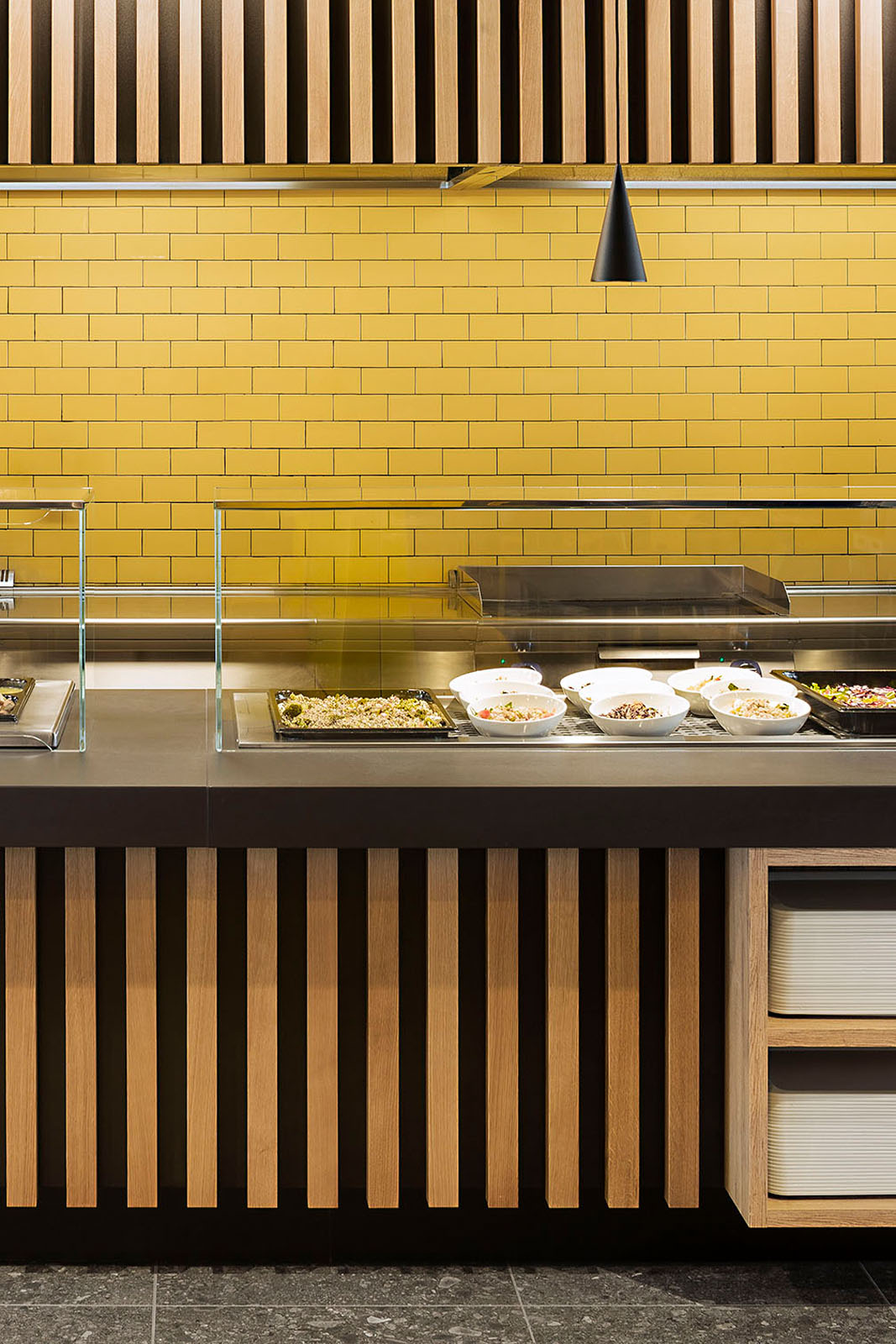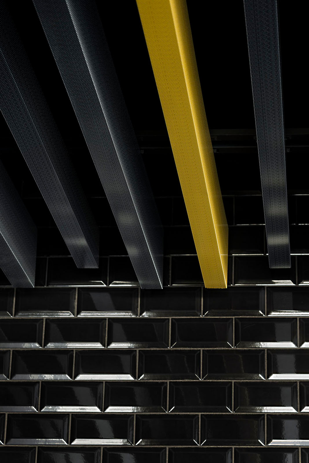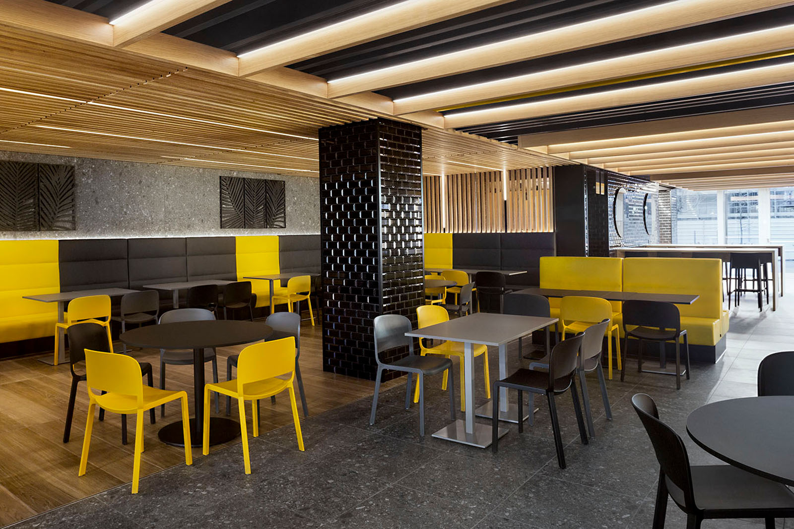 Im Restaurant Selfy wählte man das Feinsteinzeug in Natursteinoptik der Kollektion Mystone Ceppo di Gré im Farbton Anthracite – in den Formaten 60x60 cm am Boden und 75x150 cm an der Wand. Als Wandbelag finden wir auch die Kollektion Hello in glänzender Maueroptik, die hier in Gelb und in Schwarz mit Finish Lux gewählt wurde.